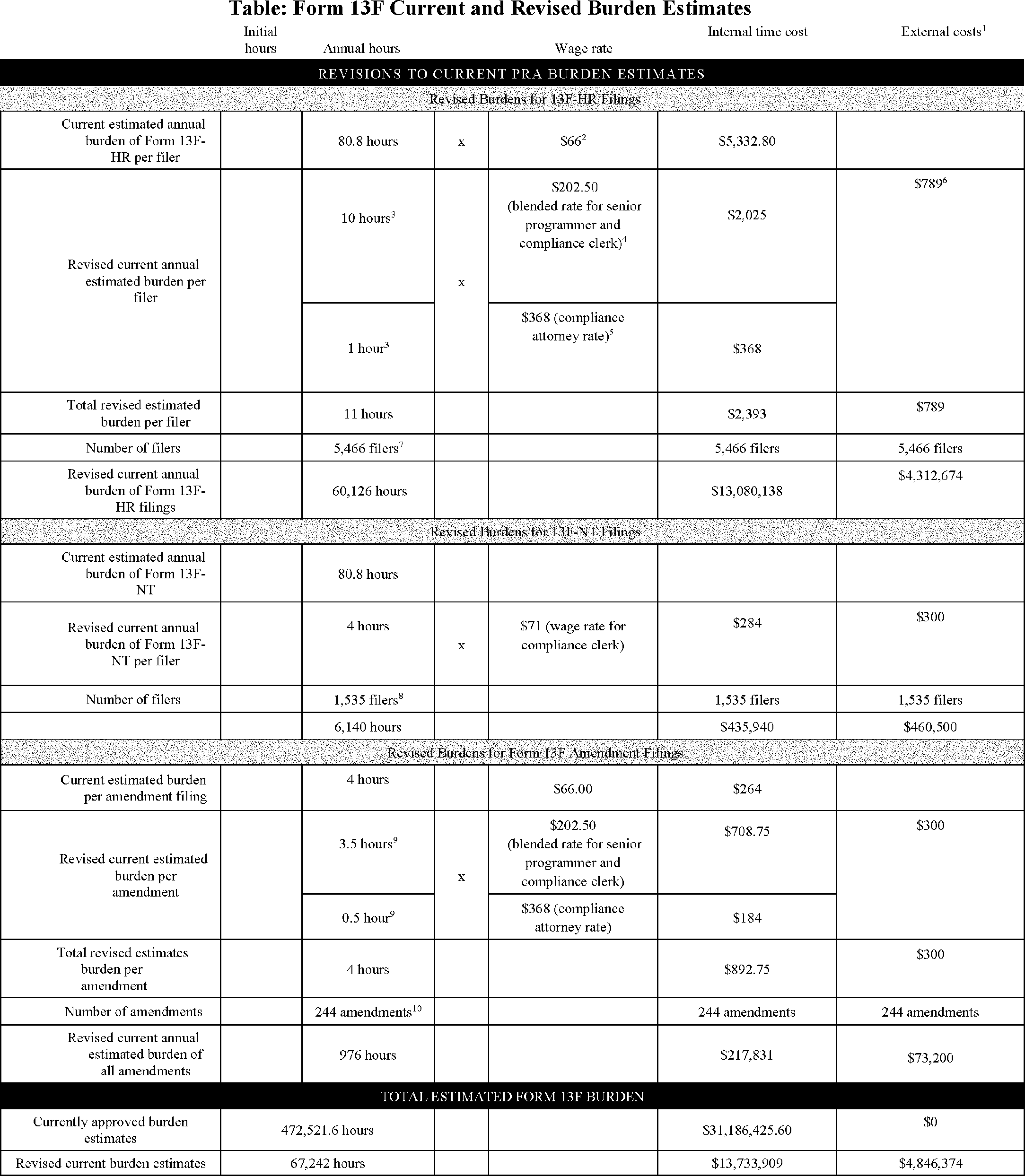The currently approved burden estimates include a total hour burden of 472,521.6 hours, with an internal cost burden of $31,186,425.60, to comply with Form 13F.[5] Consistent with a recent rulemaking proposal that made adjustments to these estimates due primarily to the Commission's belief that the currently approved estimates do not appropriately reflect the information collection costs associated with Form 13F,[6] the table below reflects the revised estimates.