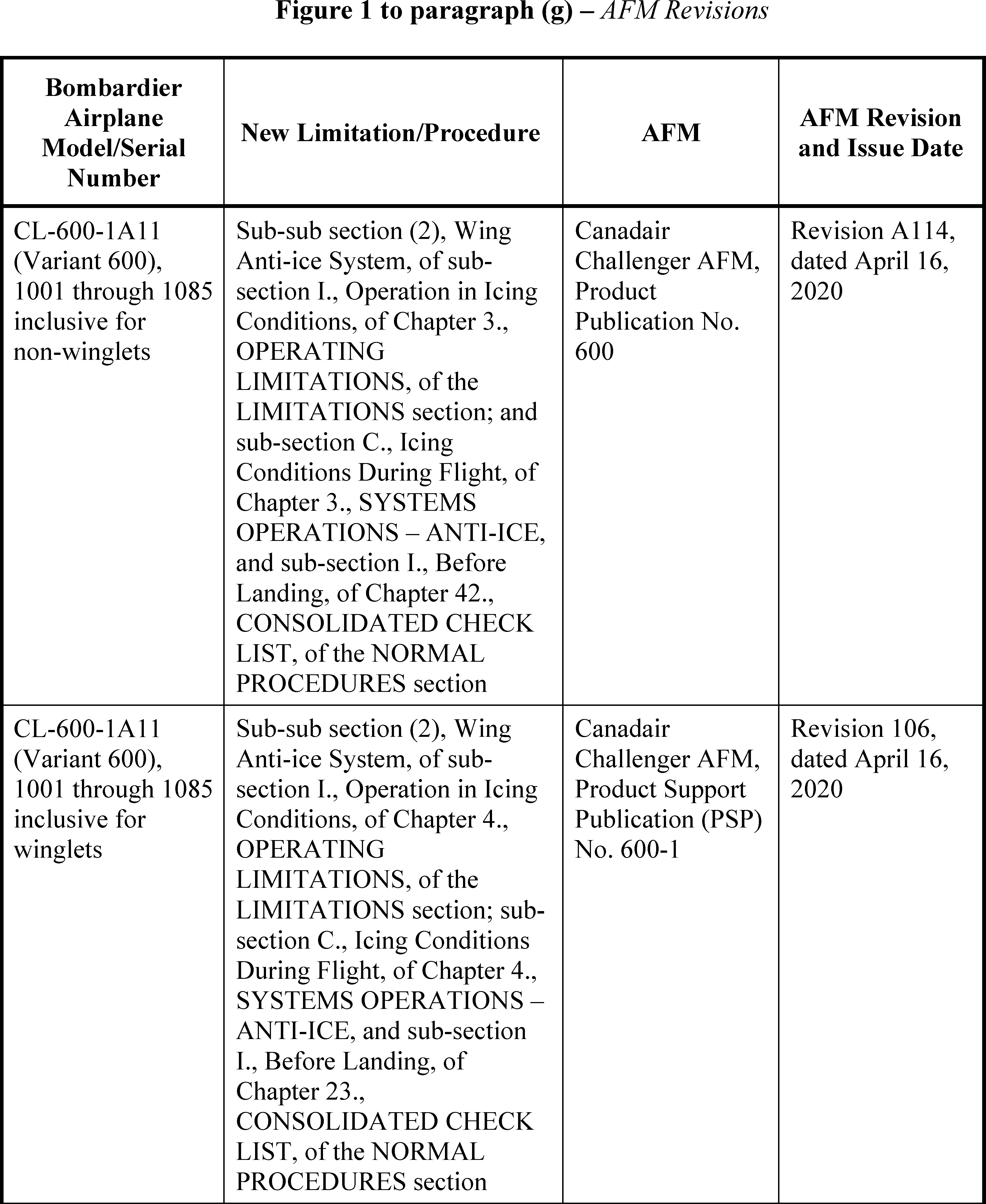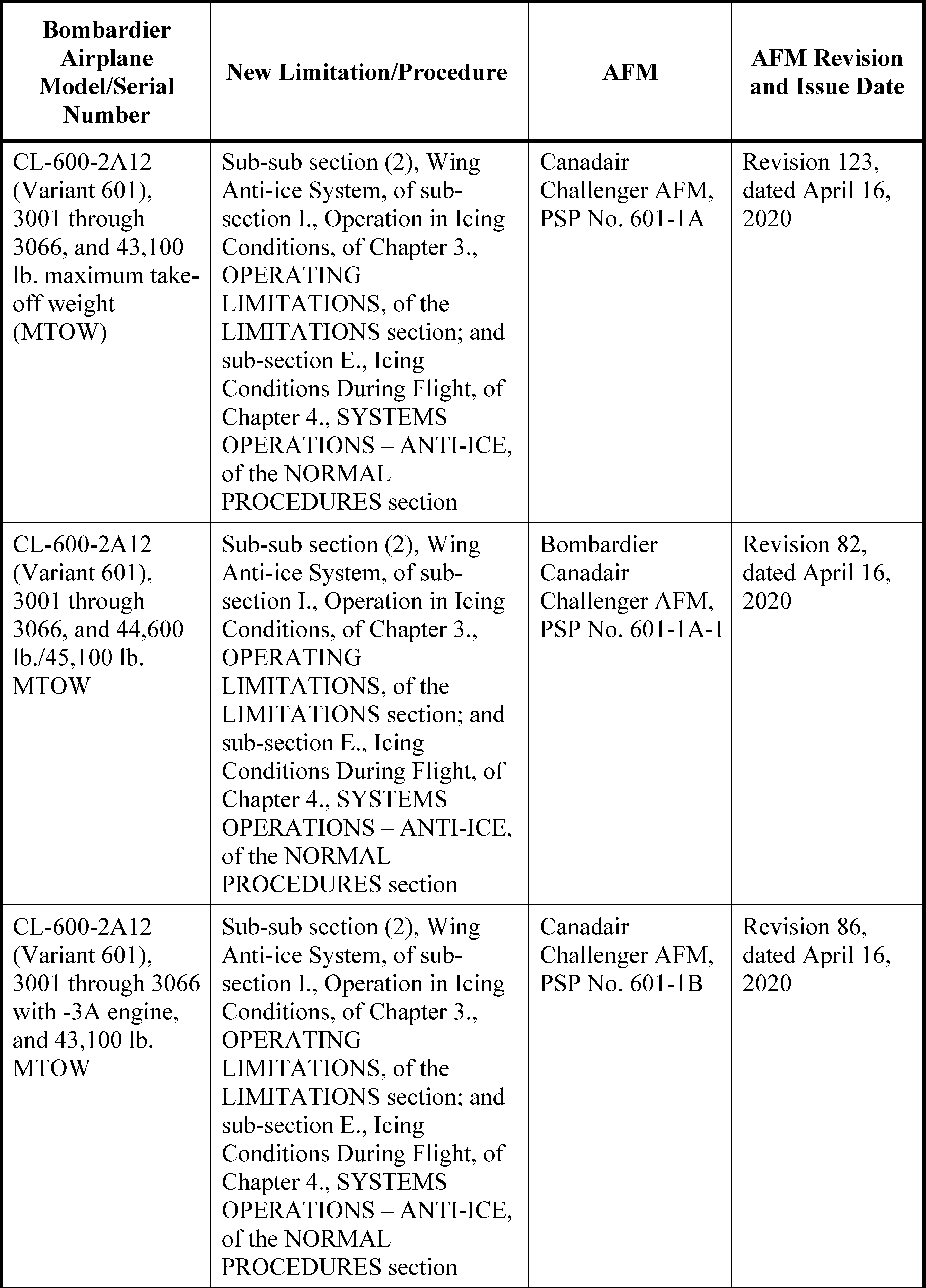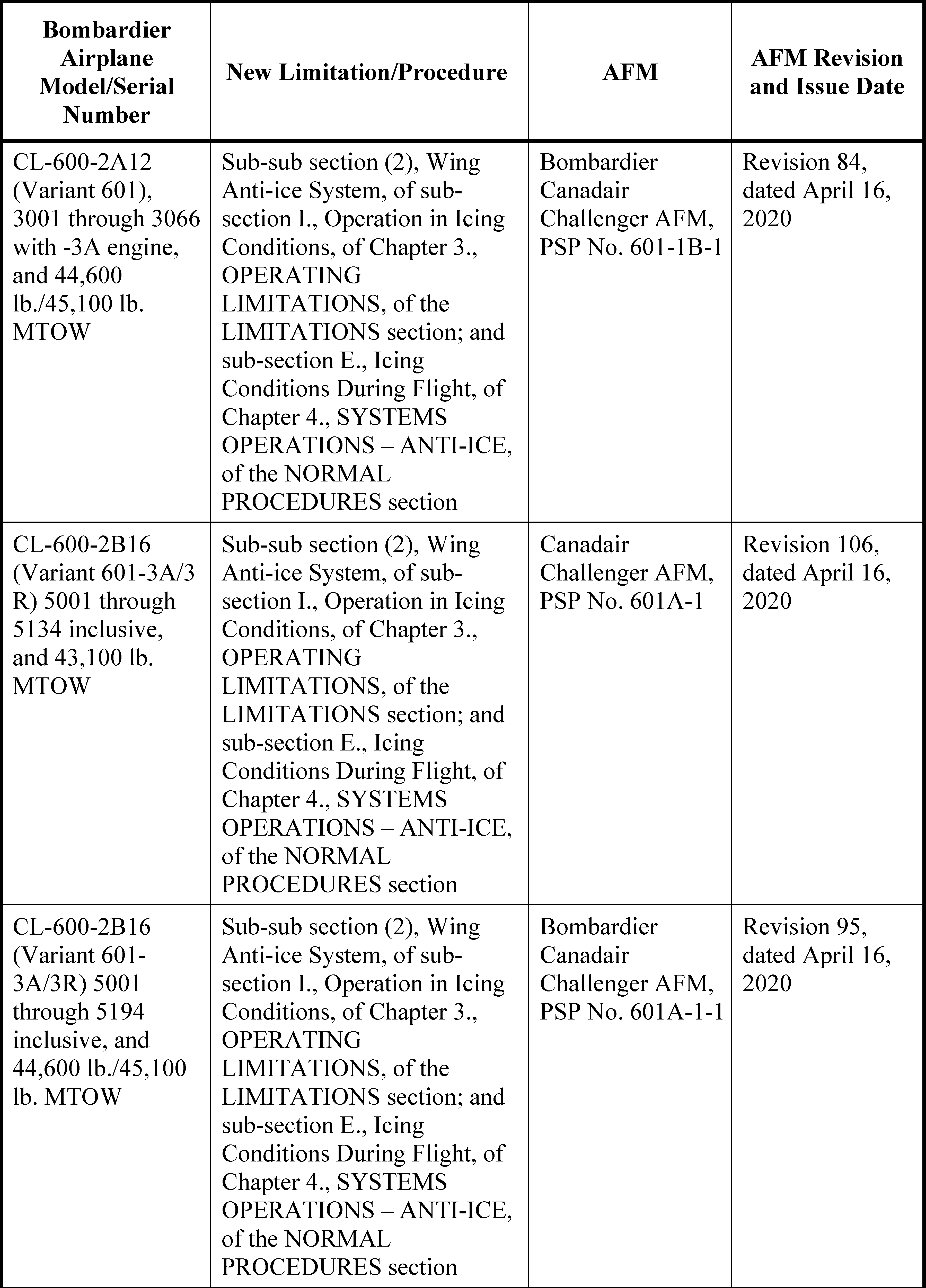 (iv) Sub-sub section (2), Wing Anti-ice System, of sub-section I., Operation in Icing Conditions, of Chapter 4., OPERATING LIMITATIONS, of the LIMITATIONS section, of the Canadair Challenger AFM, Product Support Publication (PSP) No. 600-1, Revision 106, dated April 16, 2020.