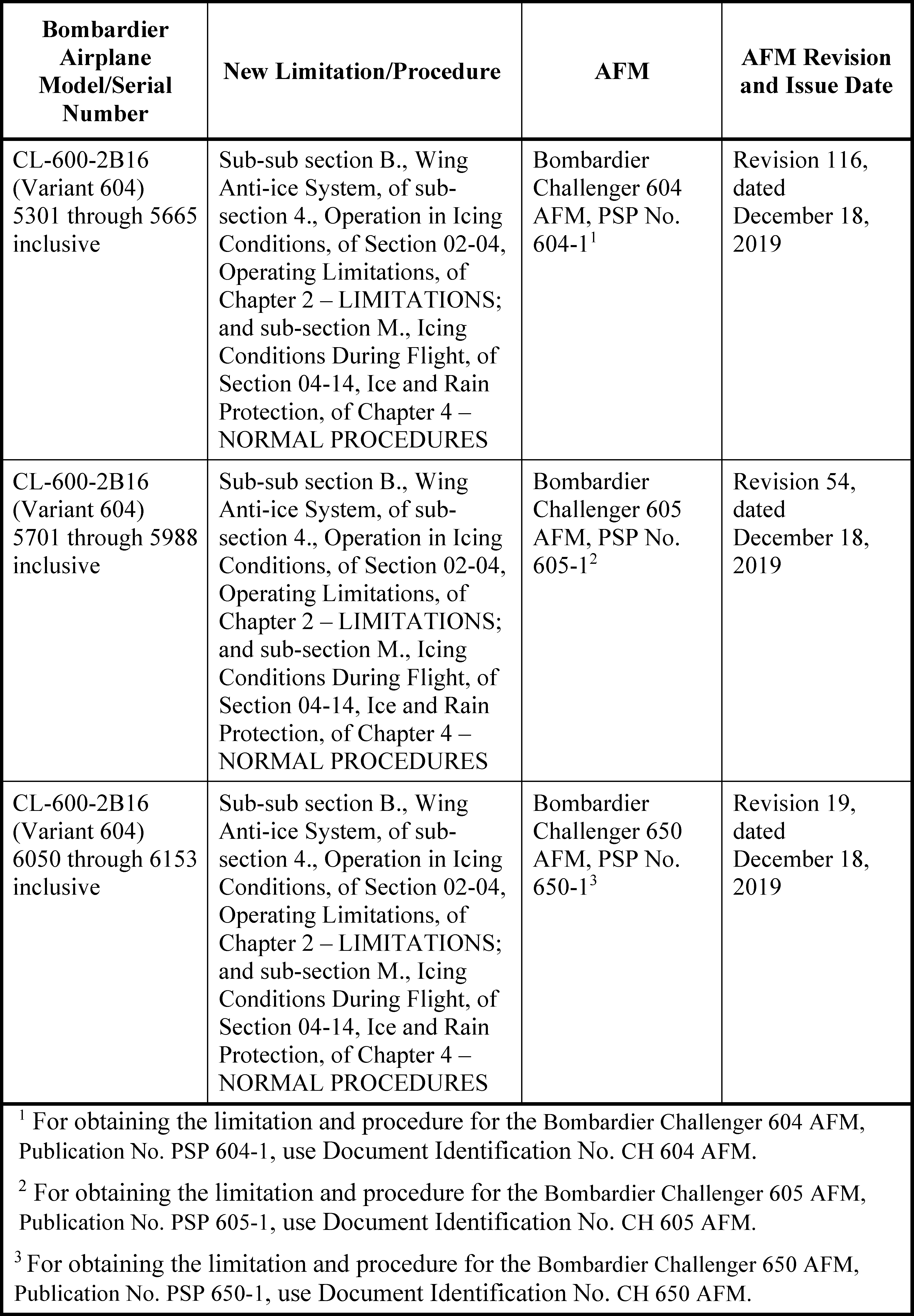 Sub-sub section B., Wing Anti-ice System, of sub-section 4., Operation in Icing Conditions, of Section 02-04, Operating Limitations, of Chapter 2—LIMITATIONS, of the Bombardier Challenger 604 AFM, Publication No. PSP 604-1, Revision 116, dated December 18, 2019. (For obtaining the limitation and procedure for the Bombardier Challenger 604 AFM, Publication No. PSP 604-1, use Document Identification No. CH 604 AFM.)
