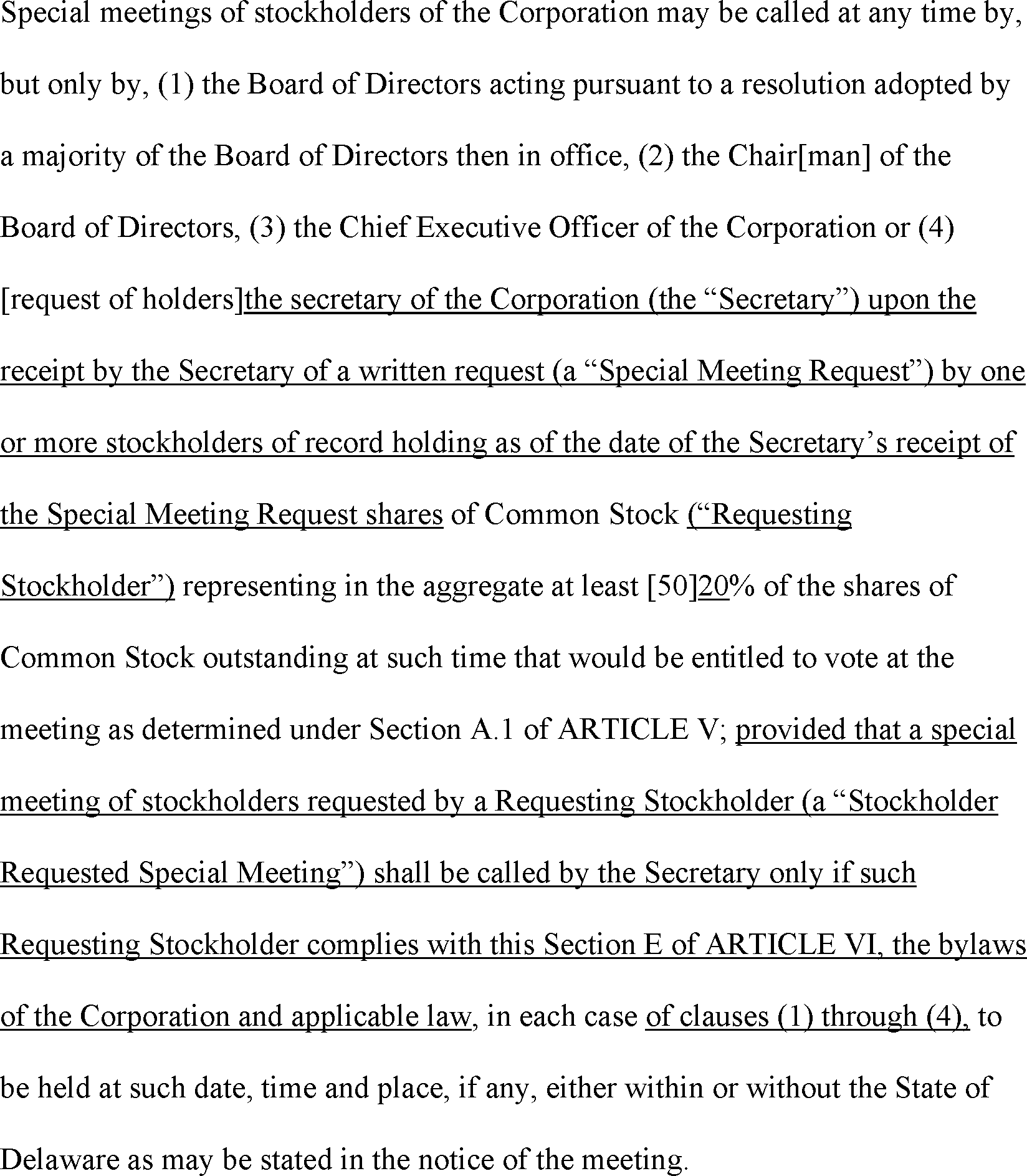 To implement the change, the Exchange proposes to amend Article VI, Section E (Power to Call Stockholder Meetings) of the ICE Certificate as follows (proposed text underlined, proposed deletions bracketed):