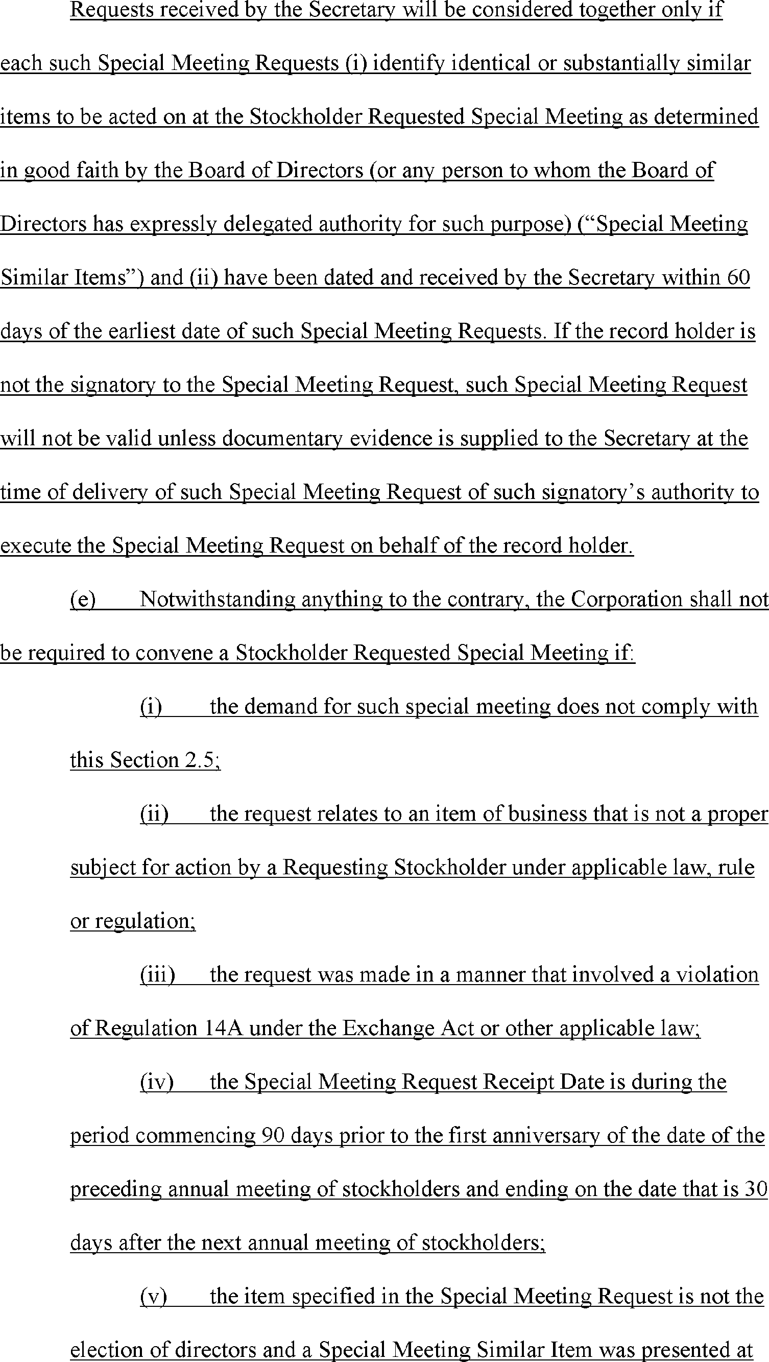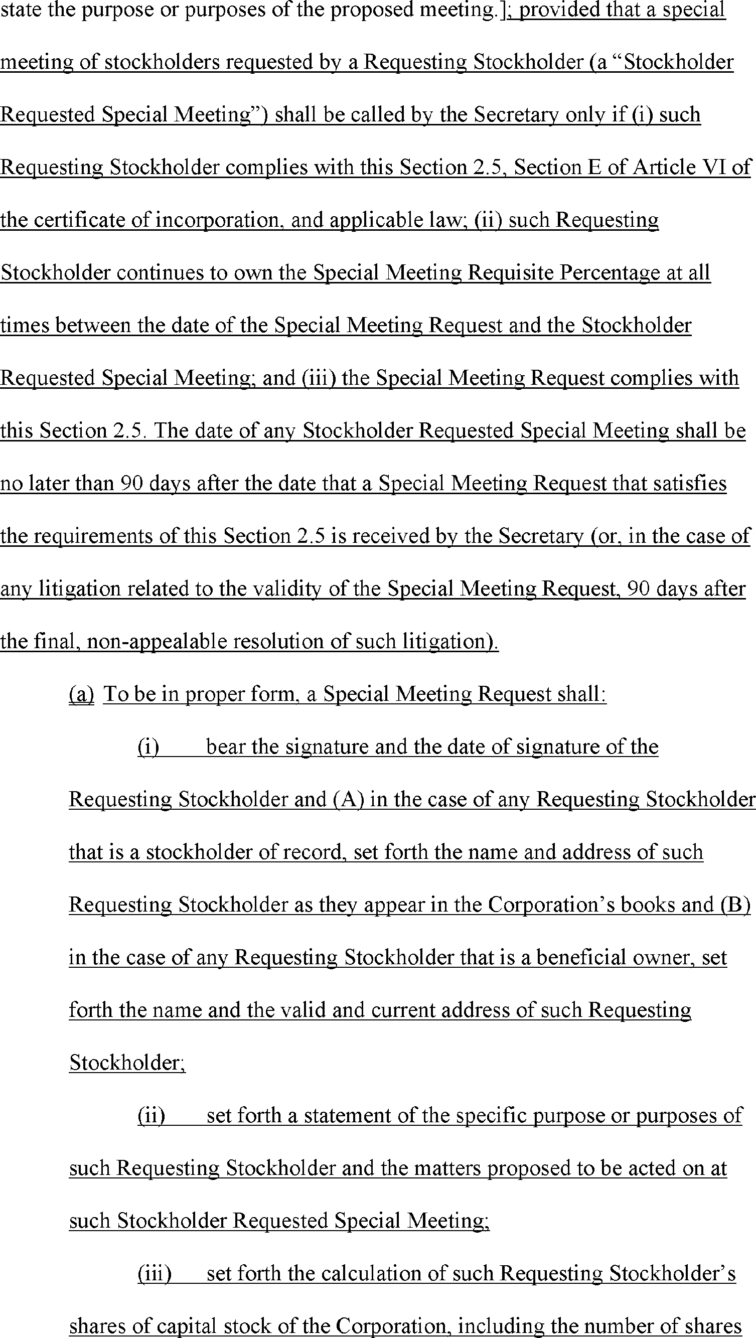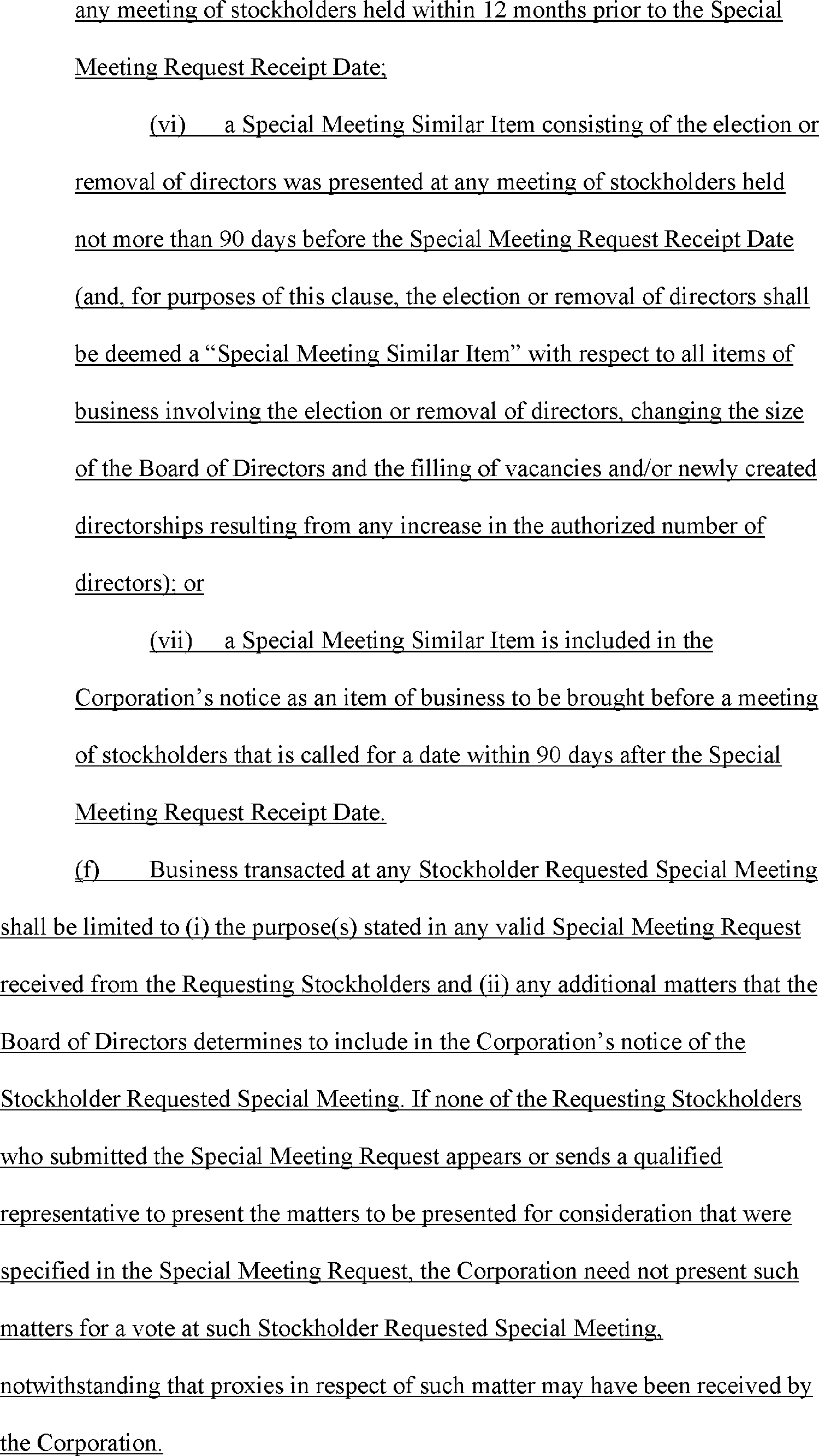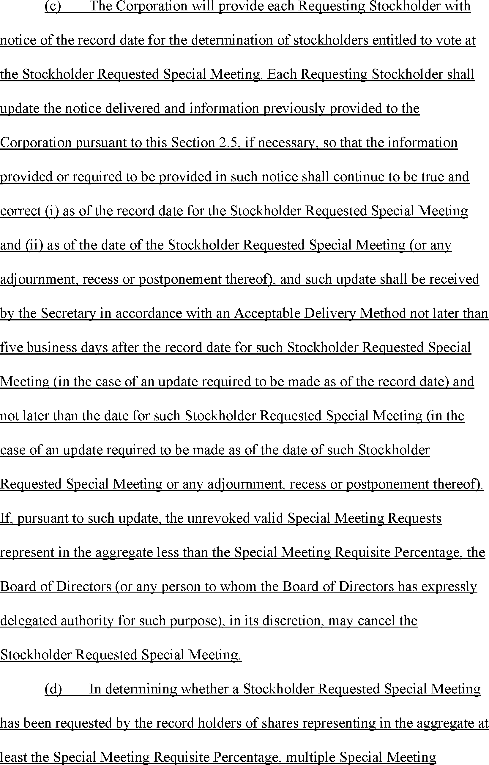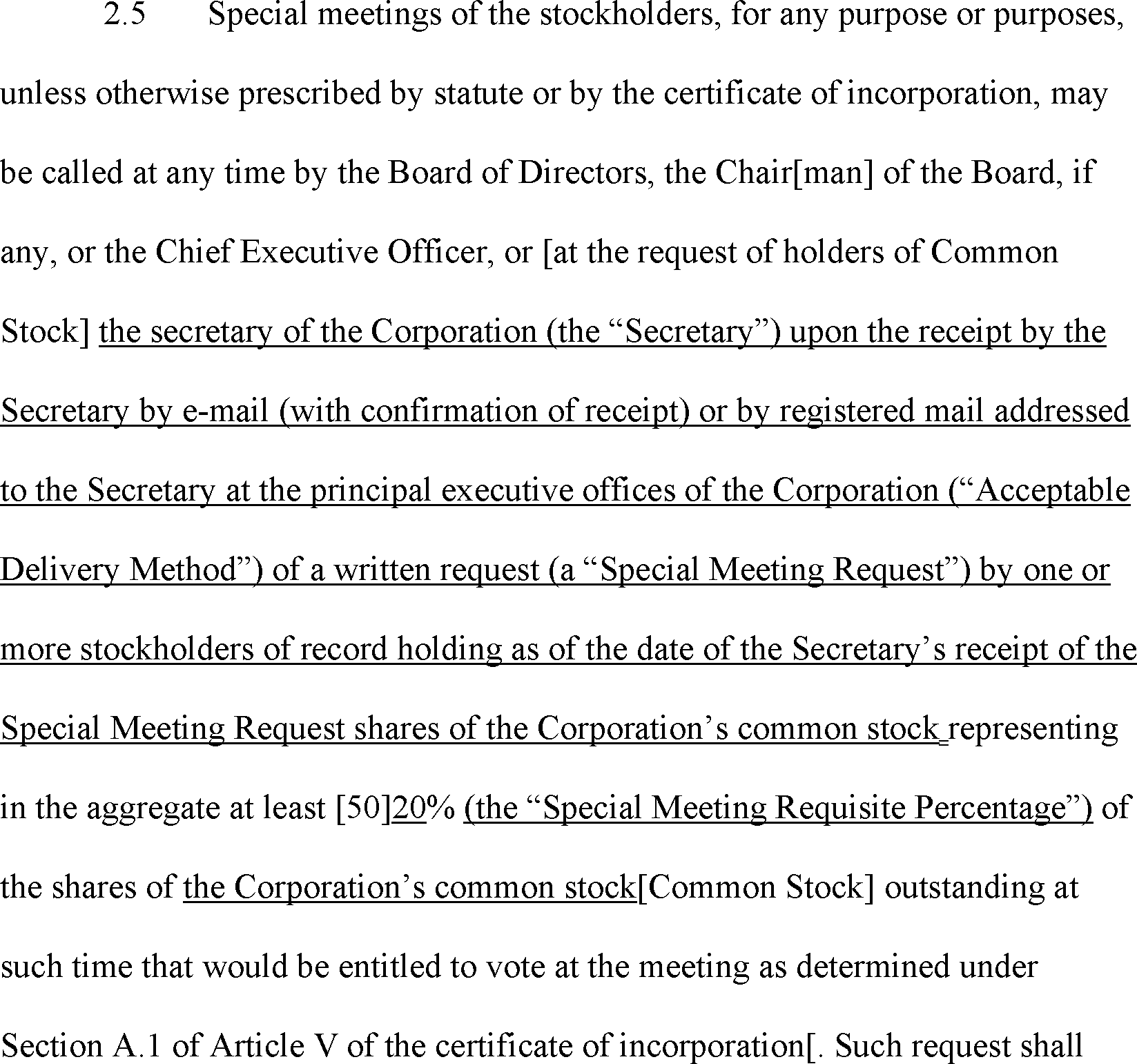 - To clarify that the notice of a special meeting referenced in Section 2.6 would be given by the Corporation, the text “by the Corporation” would be added to the first sentence, between “shall be given” and “not fewer than.”