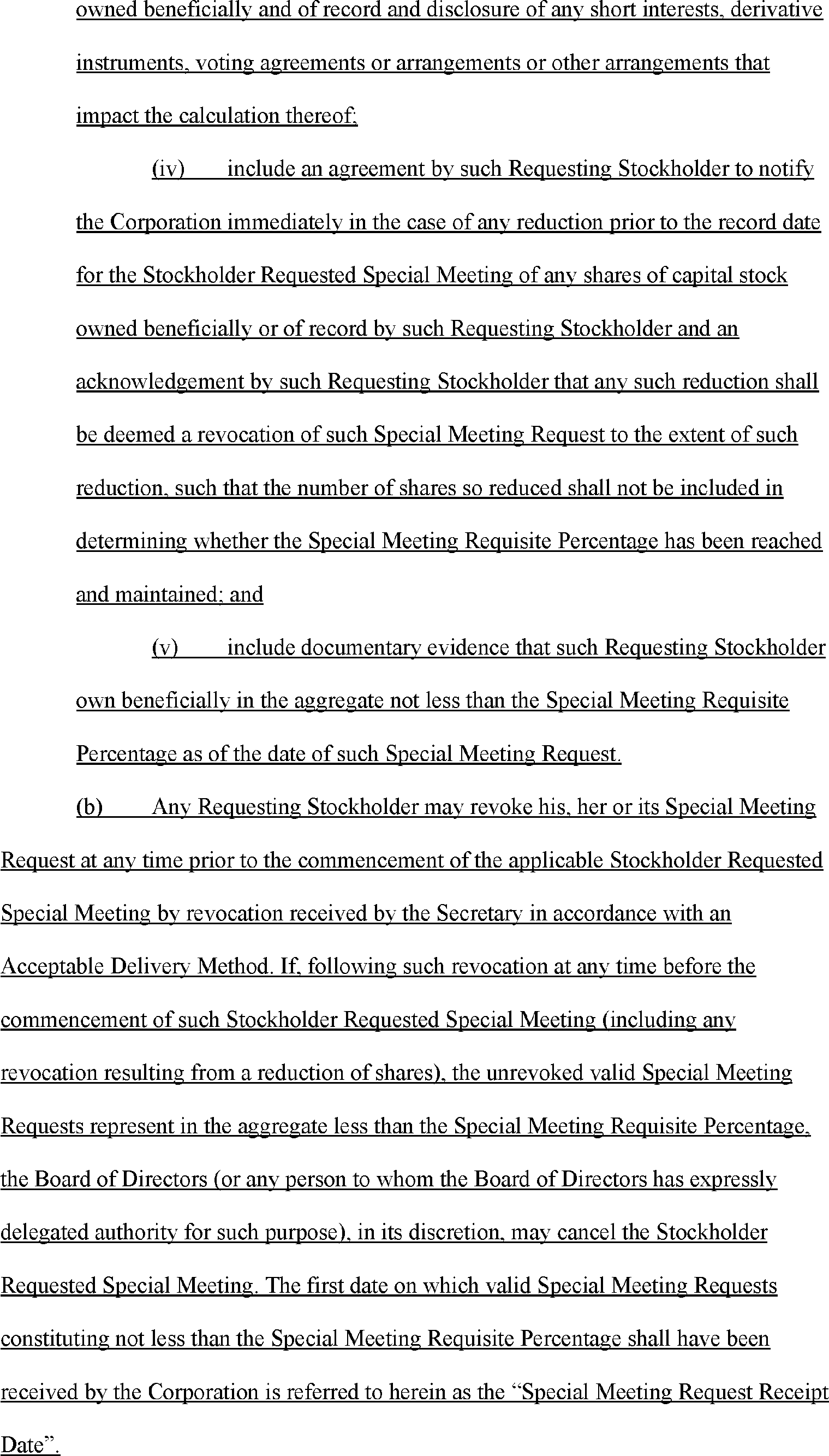 Because the special meeting provision in the ICE Bylaws likewise provides for a 50% ownership threshold, the ICE Bylaws would also be amended to lower the special meeting ownership threshold to 20%. Article II, Section 2.5 would be amended to set forth the procedures for calling a special meeting. The first paragraph would set forth the percentage threshold and timing of an email or mailed request. The remainder of Section 2.5 would set forth the informational requirements for a stockholder to request a special meeting, as well as procedural safeguards (such as ensuring that special meetings are called for lawful and appropriate purposes). It also would set forth the procedures for revoking a meeting request, whether by the requesting stockholder or the board of directors, what business may be transacted at the meeting, and what body will determine that the requesting stockholder has complied with the requirements of the section.