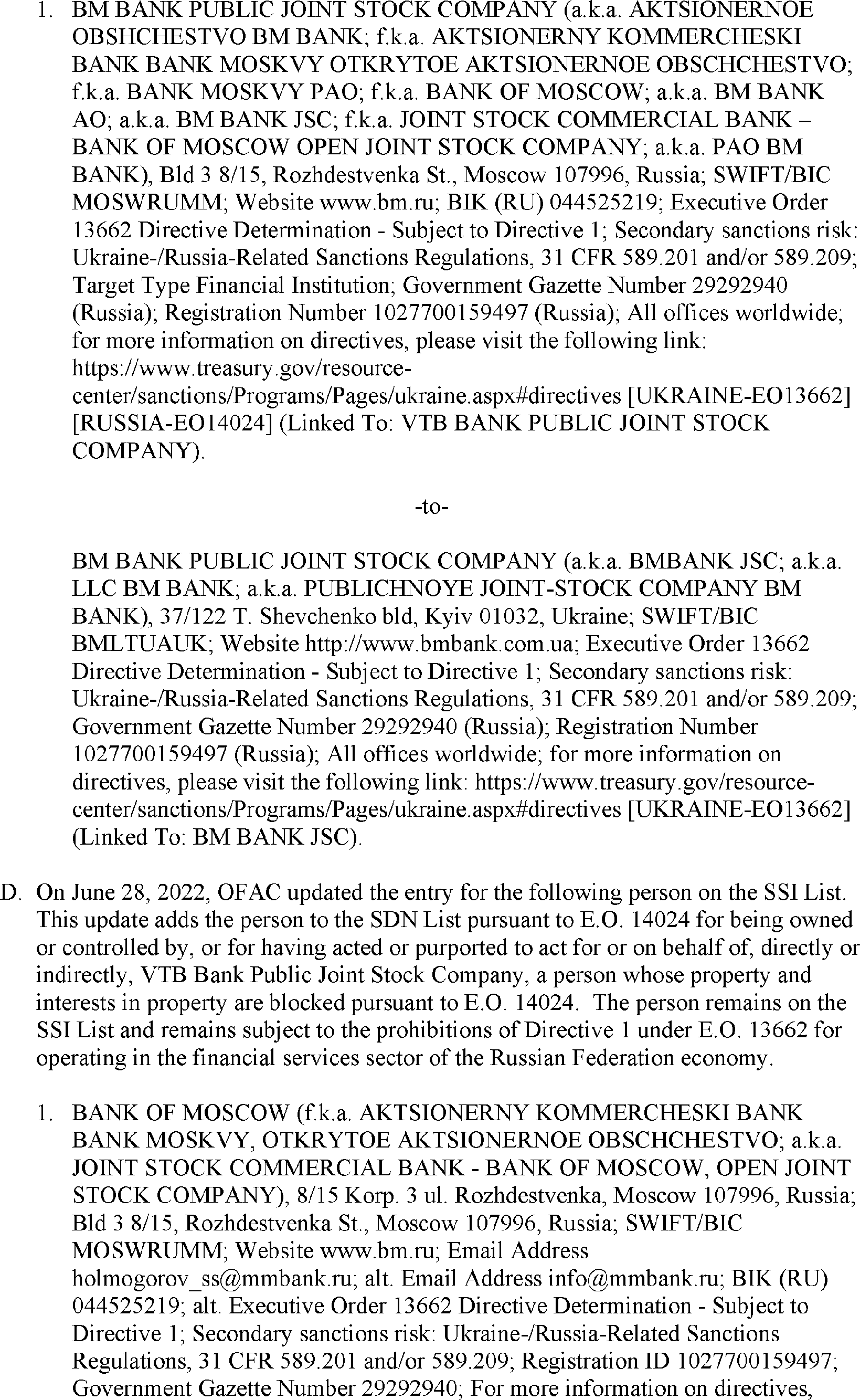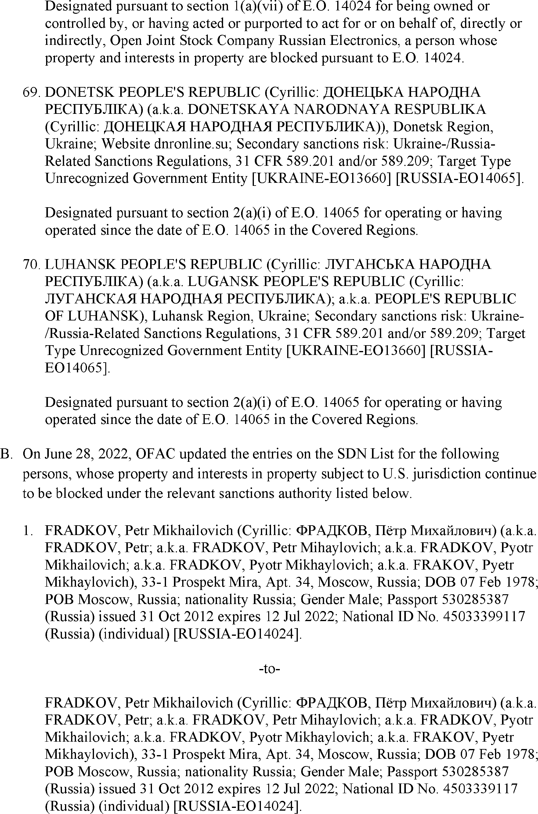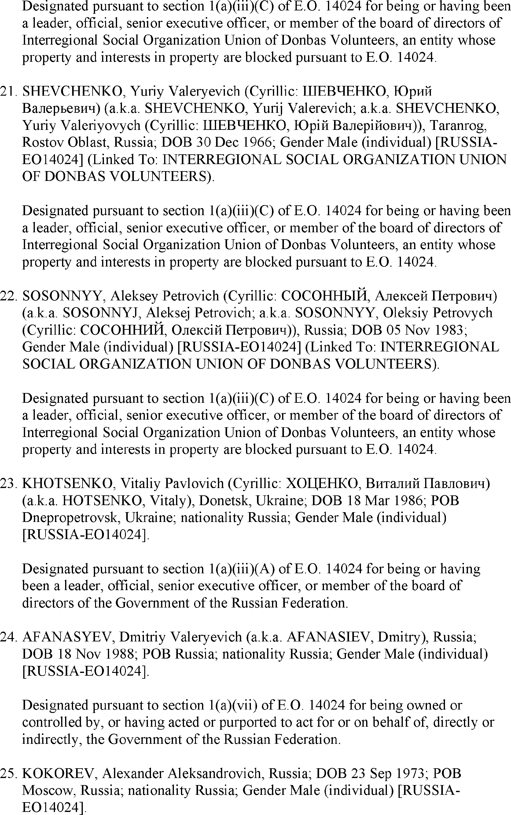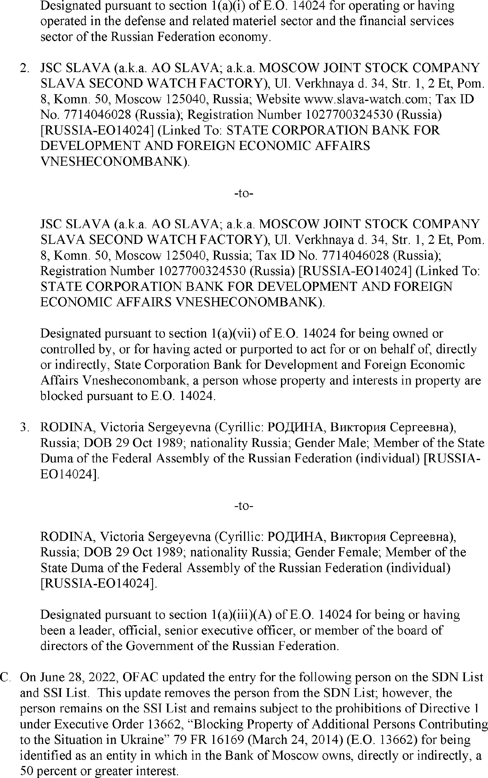 The U.S. Department of the Treasury's Office of Foreign Assets Control (OFAC) is publishing the names of one or more persons that have been placed on OFAC's Specially Designated Nationals and Blocked Persons List (SDN List) based on OFAC's determination that one or more ( printed page 39902) applicable legal criteria were satisfied. All property and interests in property subject to U.S. jurisdiction of these persons are blocked, and U.S. persons are generally prohibited from engaging in transactions with them. Additionally, OFAC is publishing updates to the identifying information of one or more persons currently included on the SDN List. OFAC is also publishing updates to the identifying information of one person currently included on the SDN List and the Sectoral Sanctions Identification List (SSI List); these updates will remove that person from the SDN List. OFAC is publishing updates to the identifying information of one person currently included on the SSI List; these updates will additionally add that person to the SDN List.