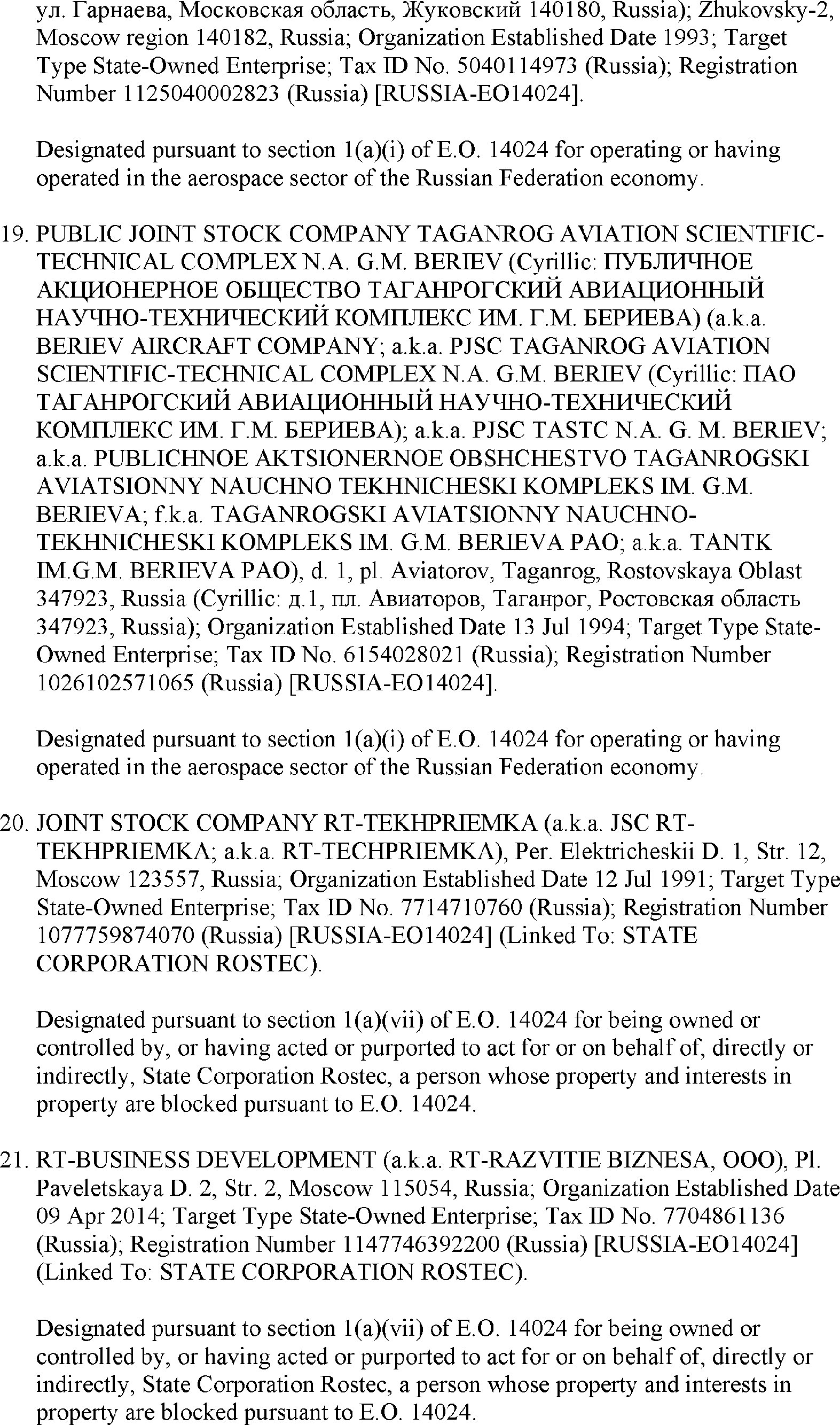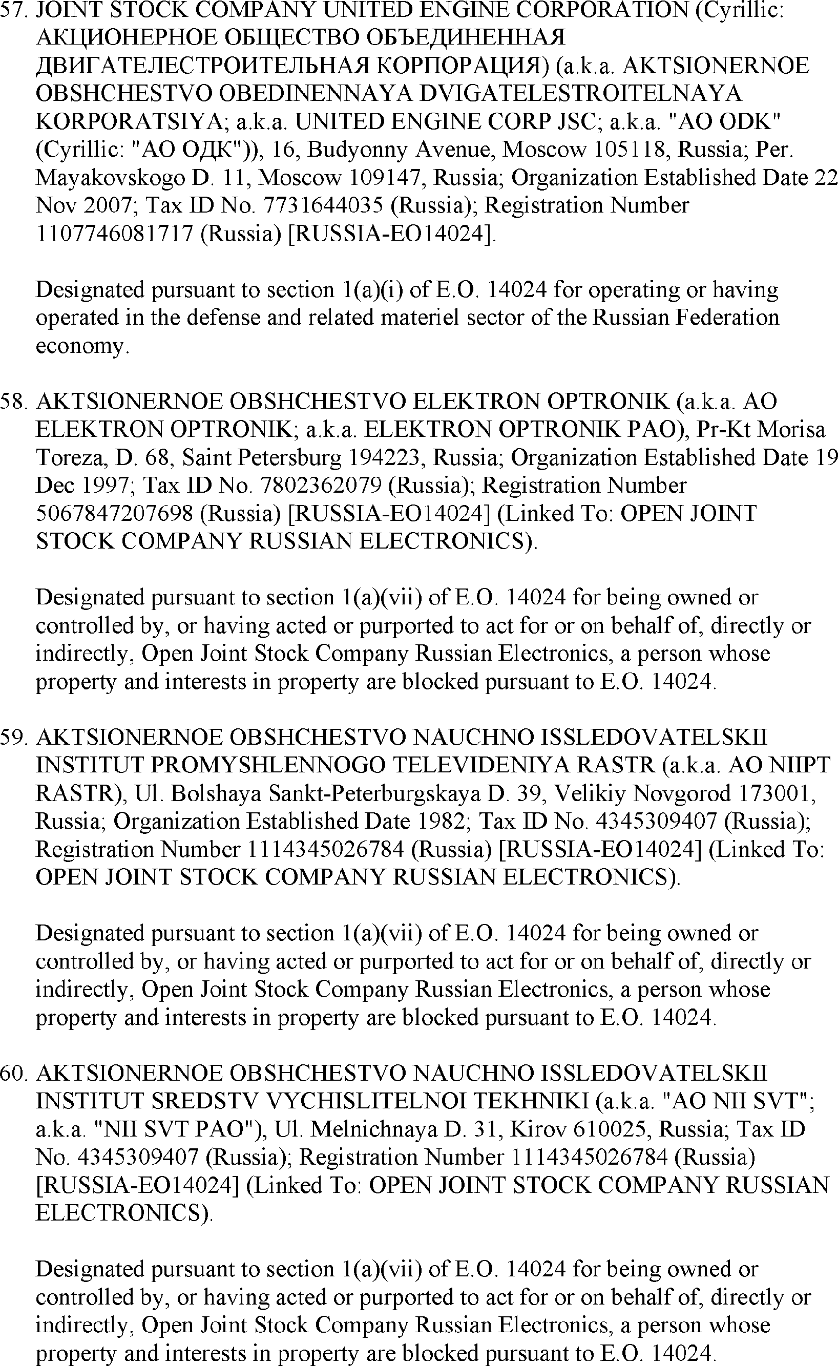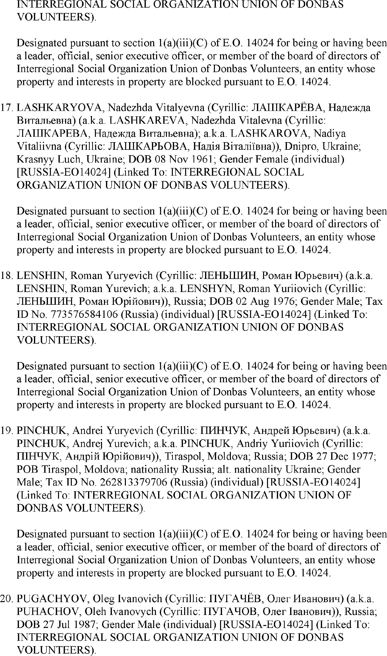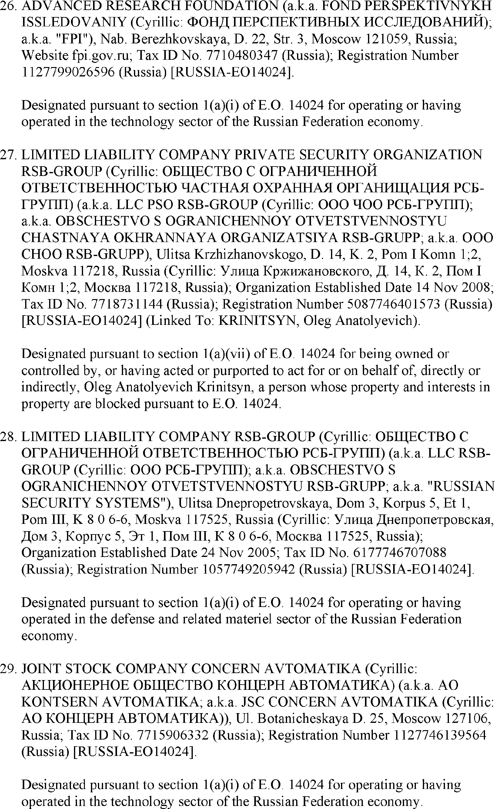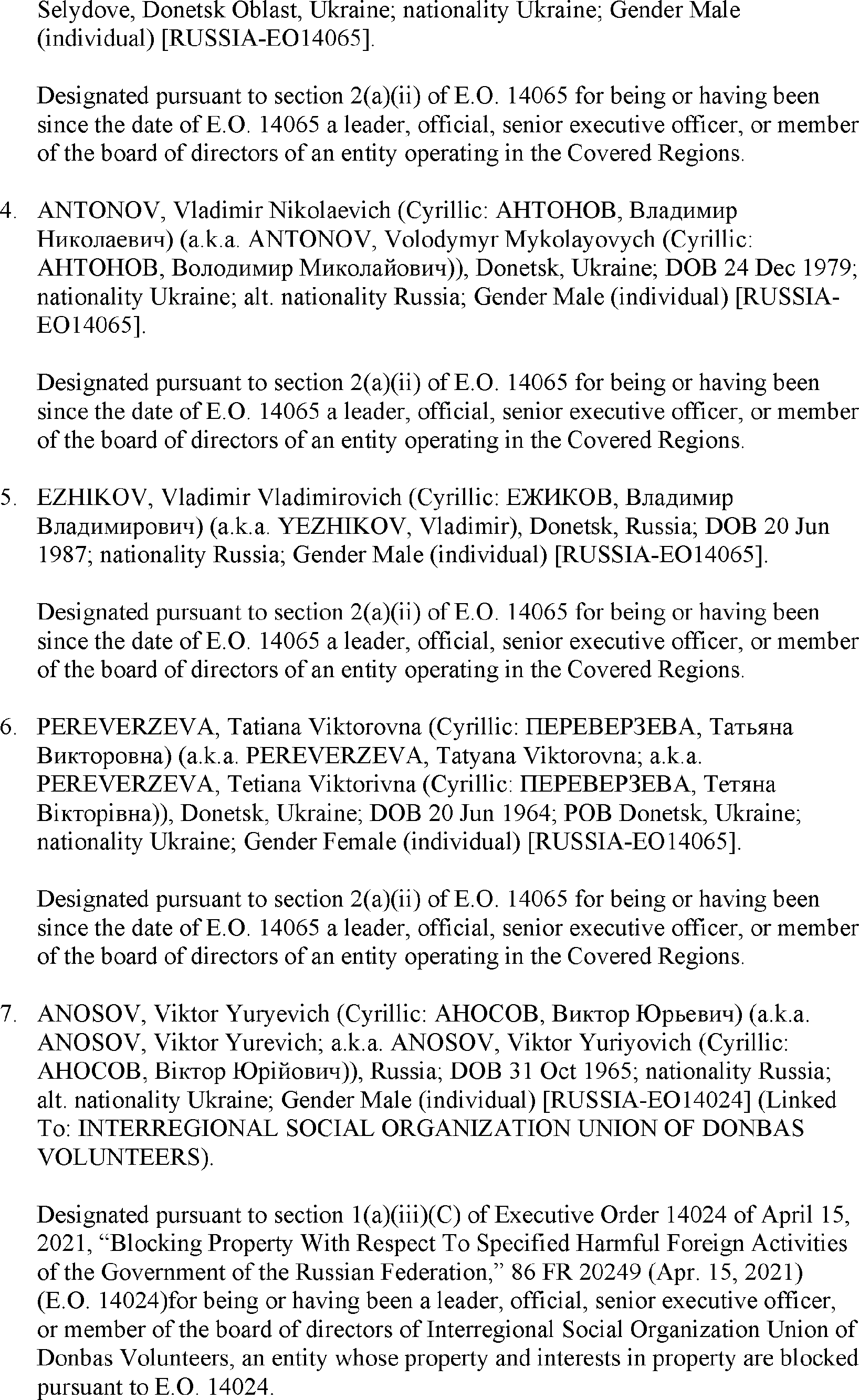 The U.S. Department of the Treasury's Office of Foreign Assets Control (OFAC) is publishing the names of one or more persons that have been placed on OFAC's Specially Designated Nationals and Blocked Persons List (SDN List) based on OFAC's determination that one or more ( printed page 39902) applicable legal criteria were satisfied. All property and interests in property subject to U.S. jurisdiction of these persons are blocked, and U.S. persons are generally prohibited from engaging in transactions with them. Additionally, OFAC is publishing updates to the identifying information of one or more persons currently included on the SDN List. OFAC is also publishing updates to the identifying information of one person currently included on the SDN List and the Sectoral Sanctions Identification List (SSI List); these updates will remove that person from the SDN List. OFAC is publishing updates to the identifying information of one person currently included on the SSI List; these updates will additionally add that person to the SDN List.