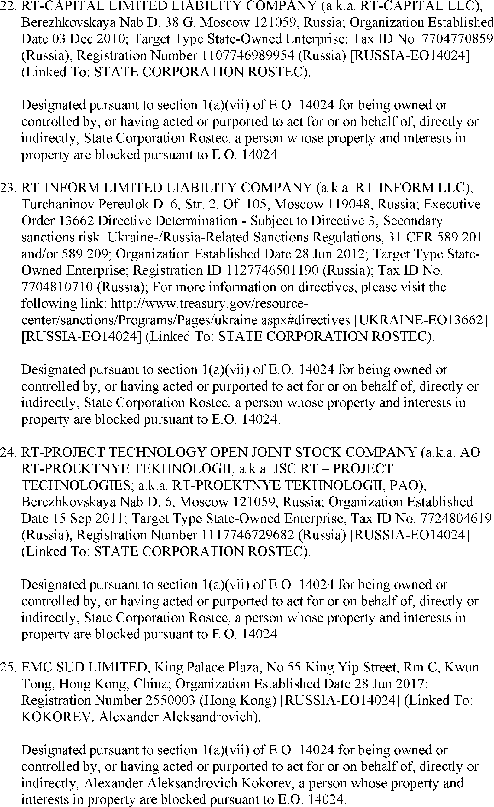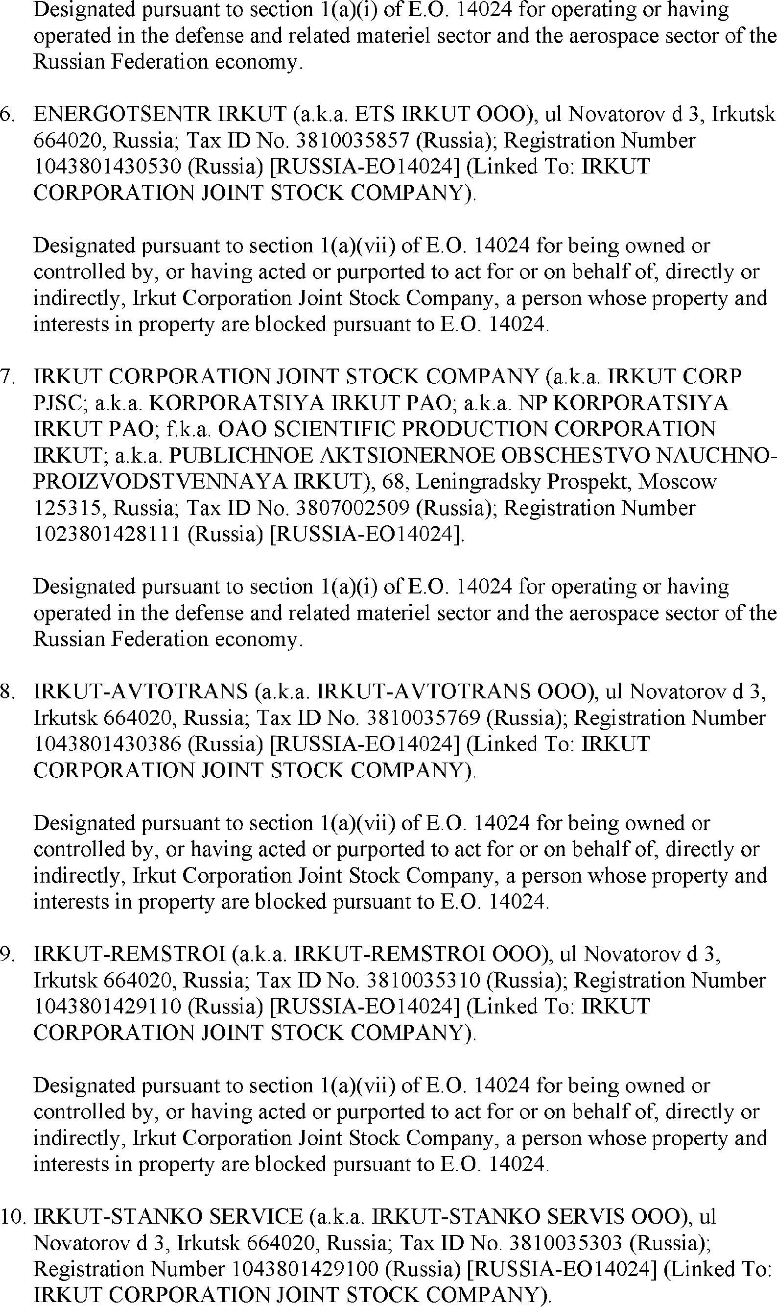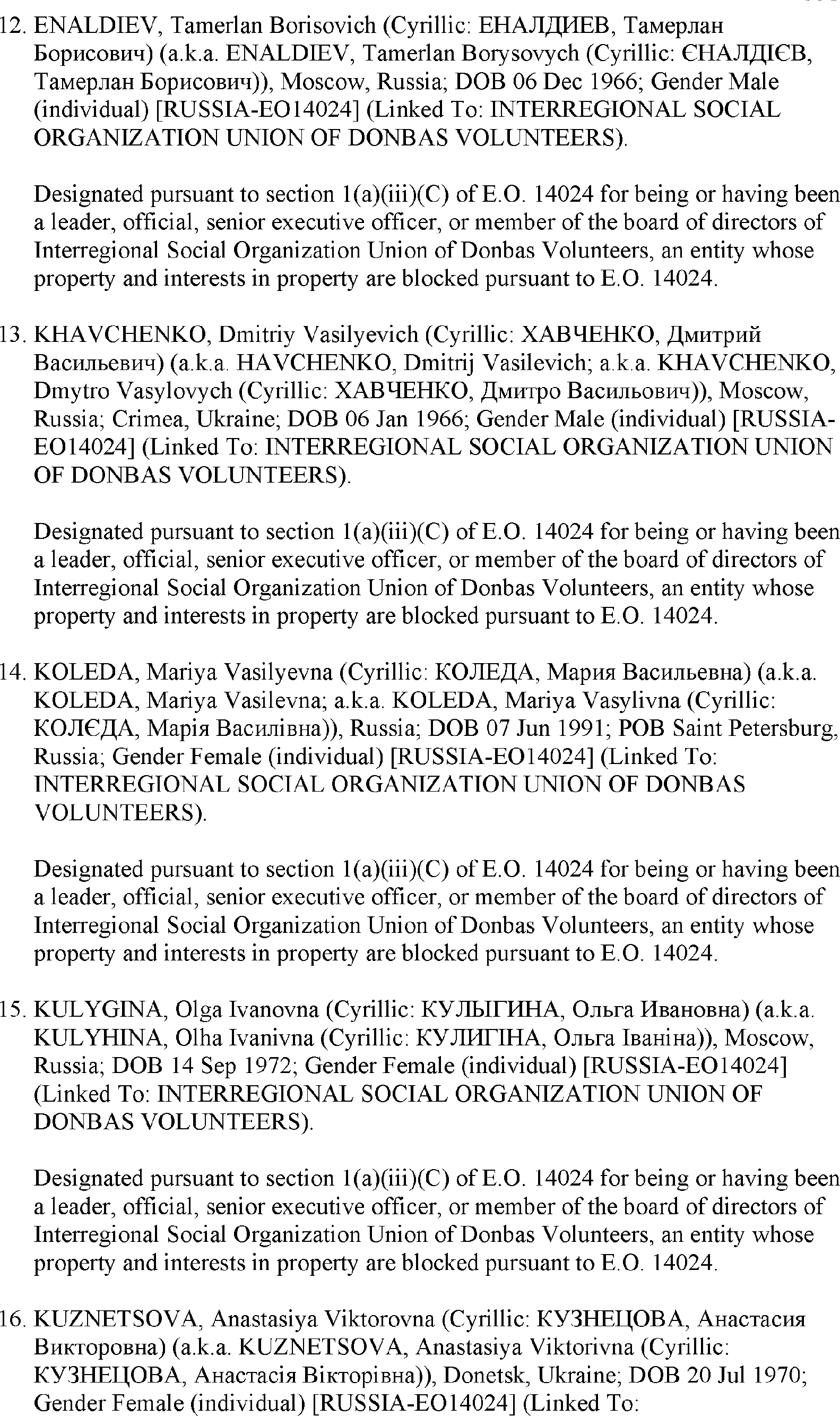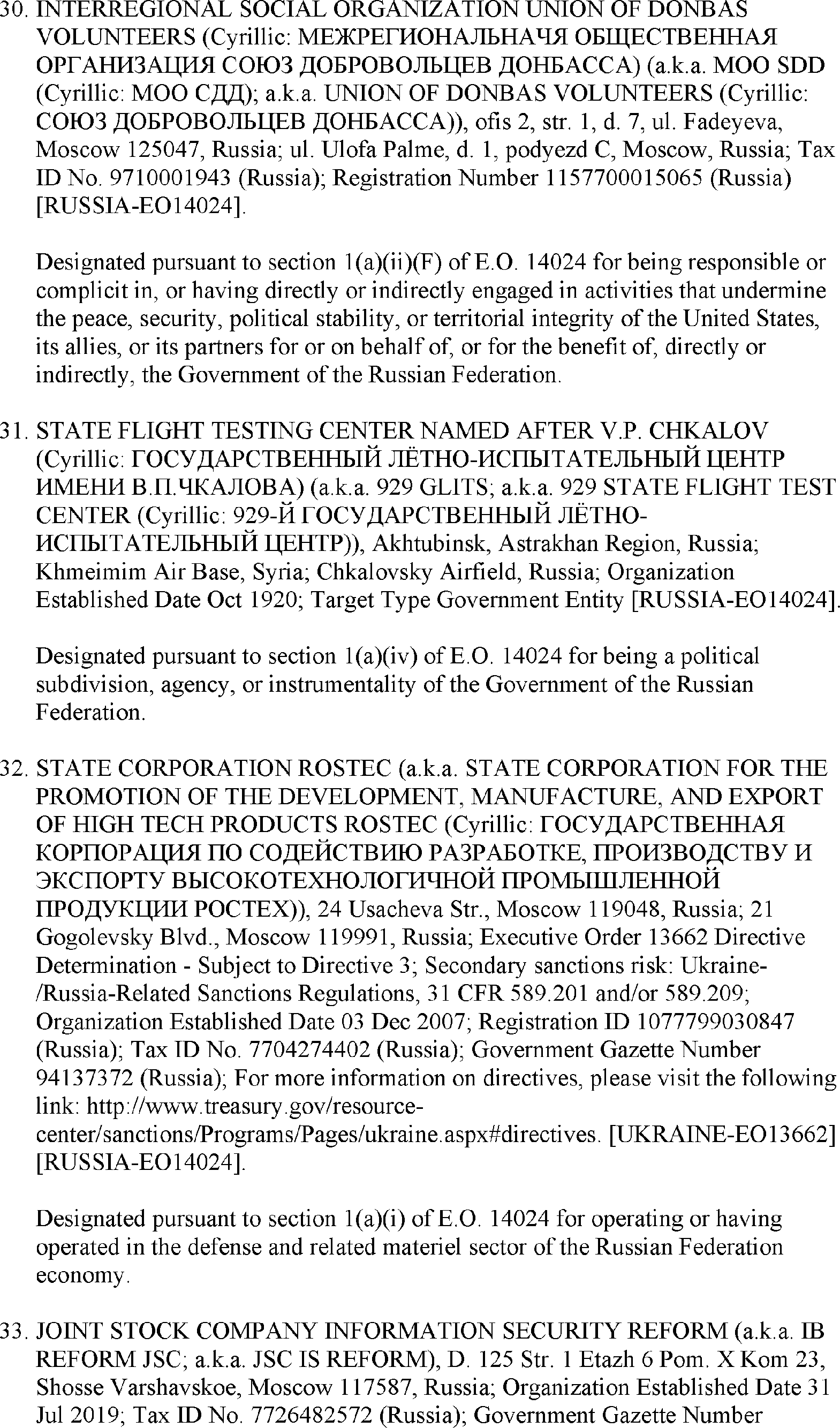 The U.S. Department of the Treasury's Office of Foreign Assets Control (OFAC) is publishing the names of one or more persons that have been placed on OFAC's Specially Designated Nationals and Blocked Persons List (SDN List) based on OFAC's determination that one or more ( printed page 39902) applicable legal criteria were satisfied. All property and interests in property subject to U.S. jurisdiction of these persons are blocked, and U.S. persons are generally prohibited from engaging in transactions with them. Additionally, OFAC is publishing updates to the identifying information of one or more persons currently included on the SDN List. OFAC is also publishing updates to the identifying information of one person currently included on the SDN List and the Sectoral Sanctions Identification List (SSI List); these updates will remove that person from the SDN List. OFAC is publishing updates to the identifying information of one person currently included on the SSI List; these updates will additionally add that person to the SDN List.