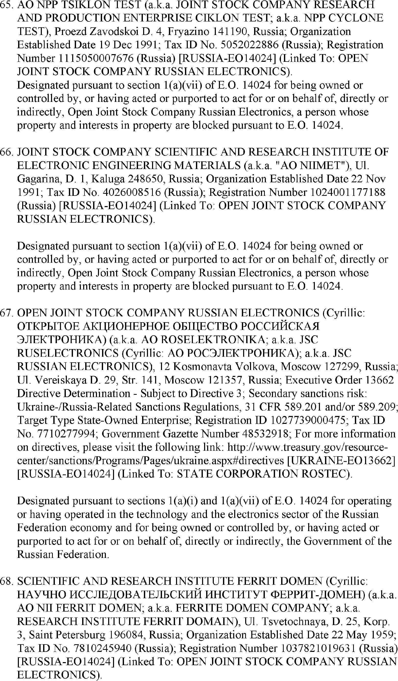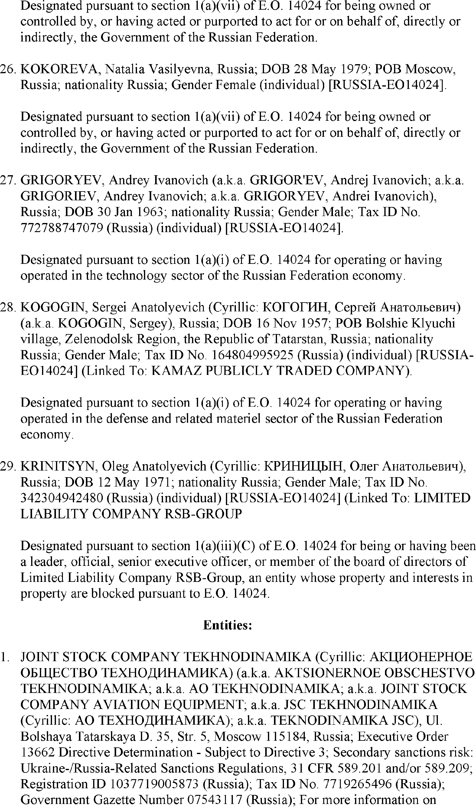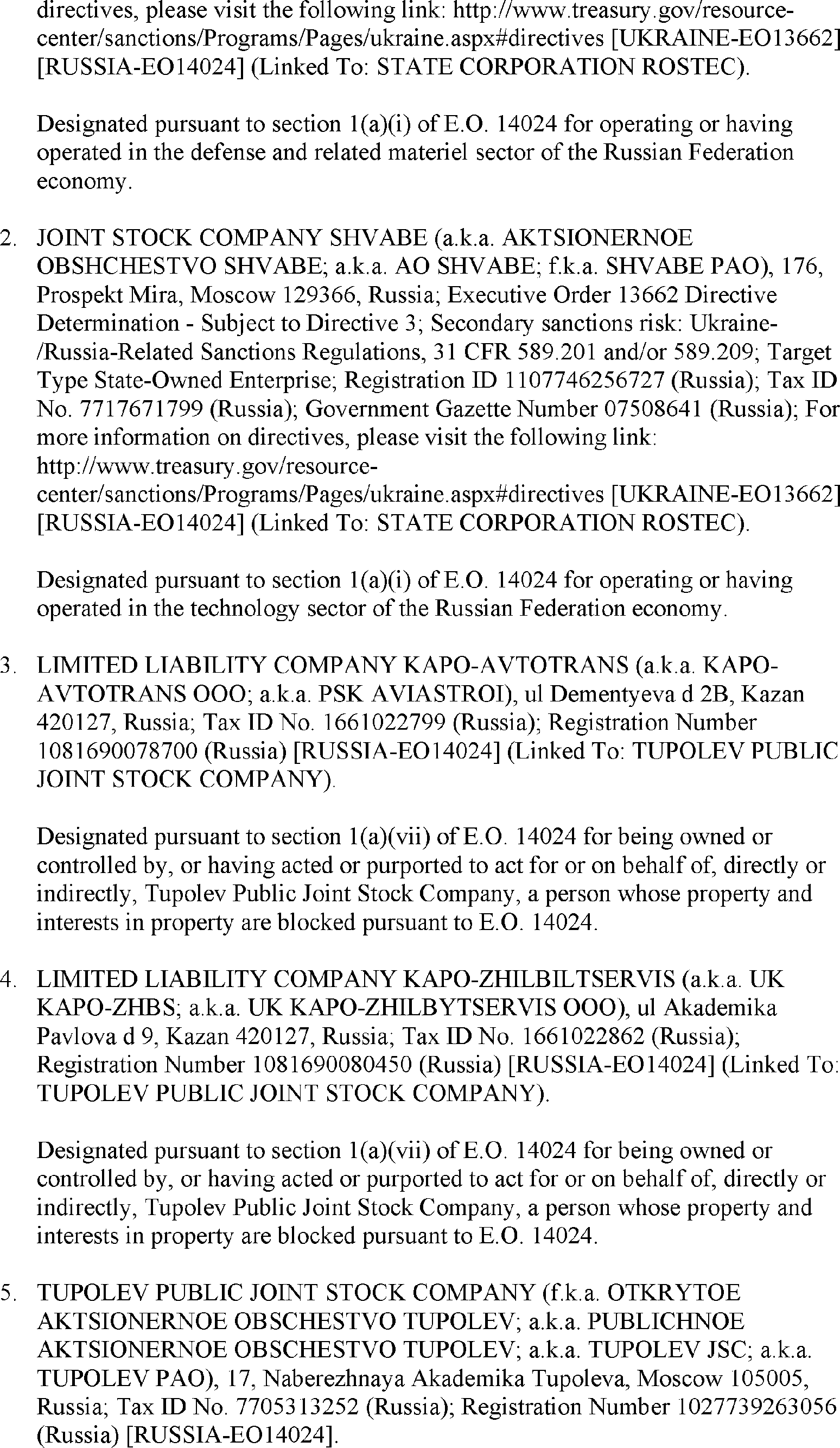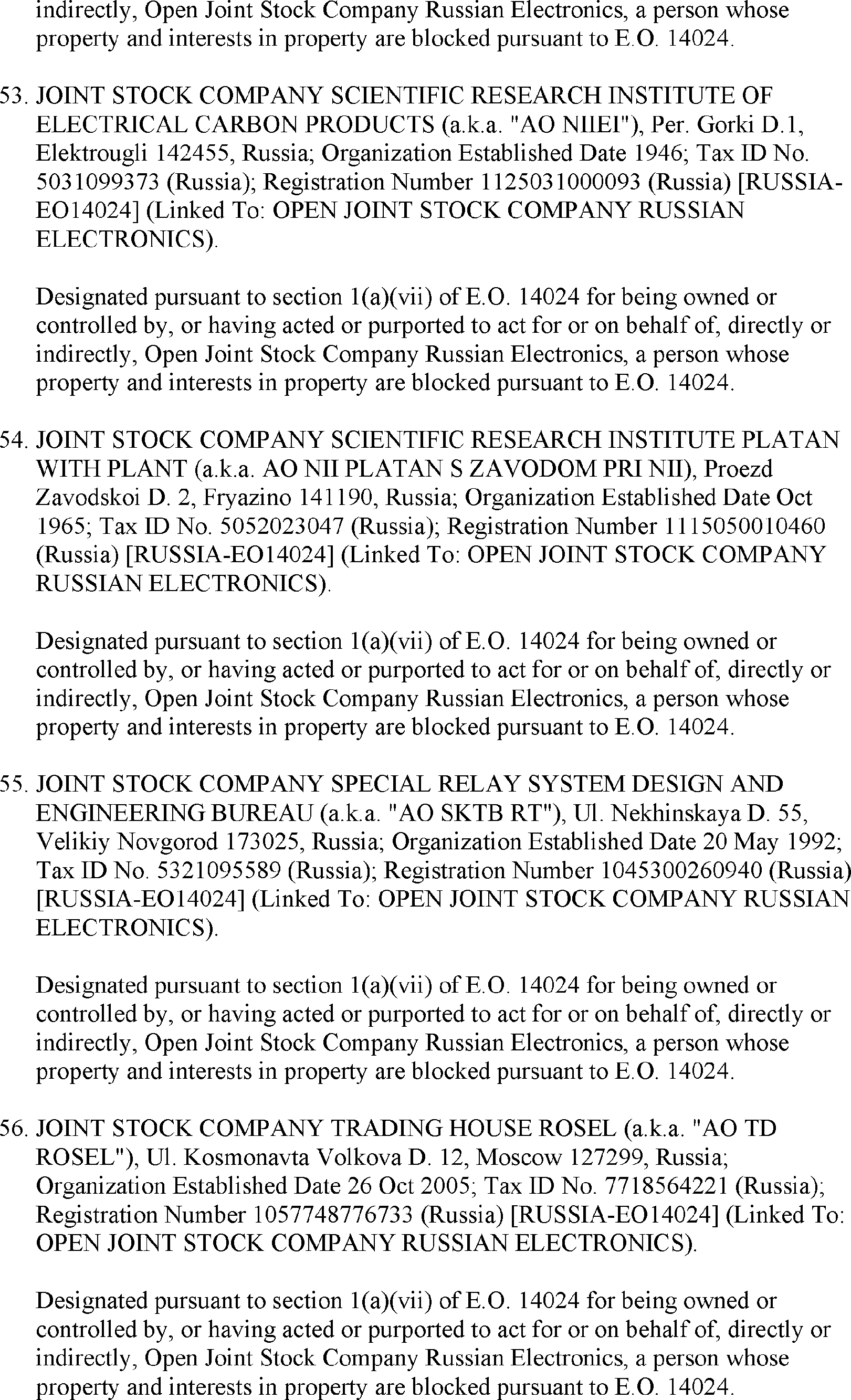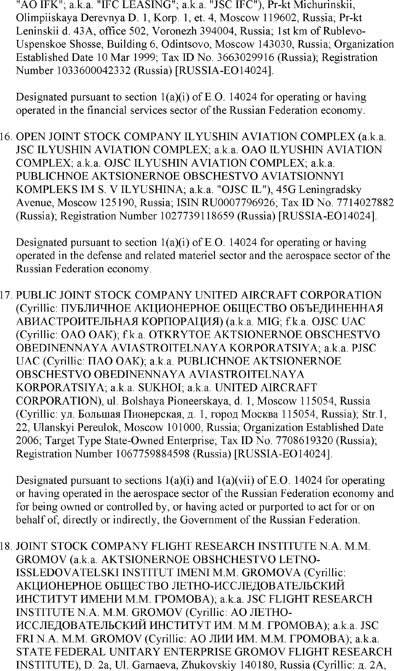 The U.S. Department of the Treasury's Office of Foreign Assets Control (OFAC) is publishing the names of one or more persons that have been placed on OFAC's Specially Designated Nationals and Blocked Persons List (SDN List) based on OFAC's determination that one or more ( printed page 39902) applicable legal criteria were satisfied. All property and interests in property subject to U.S. jurisdiction of these persons are blocked, and U.S. persons are generally prohibited from engaging in transactions with them. Additionally, OFAC is publishing updates to the identifying information of one or more persons currently included on the SDN List. OFAC is also publishing updates to the identifying information of one person currently included on the SDN List and the Sectoral Sanctions Identification List (SSI List); these updates will remove that person from the SDN List. OFAC is publishing updates to the identifying information of one person currently included on the SSI List; these updates will additionally add that person to the SDN List.