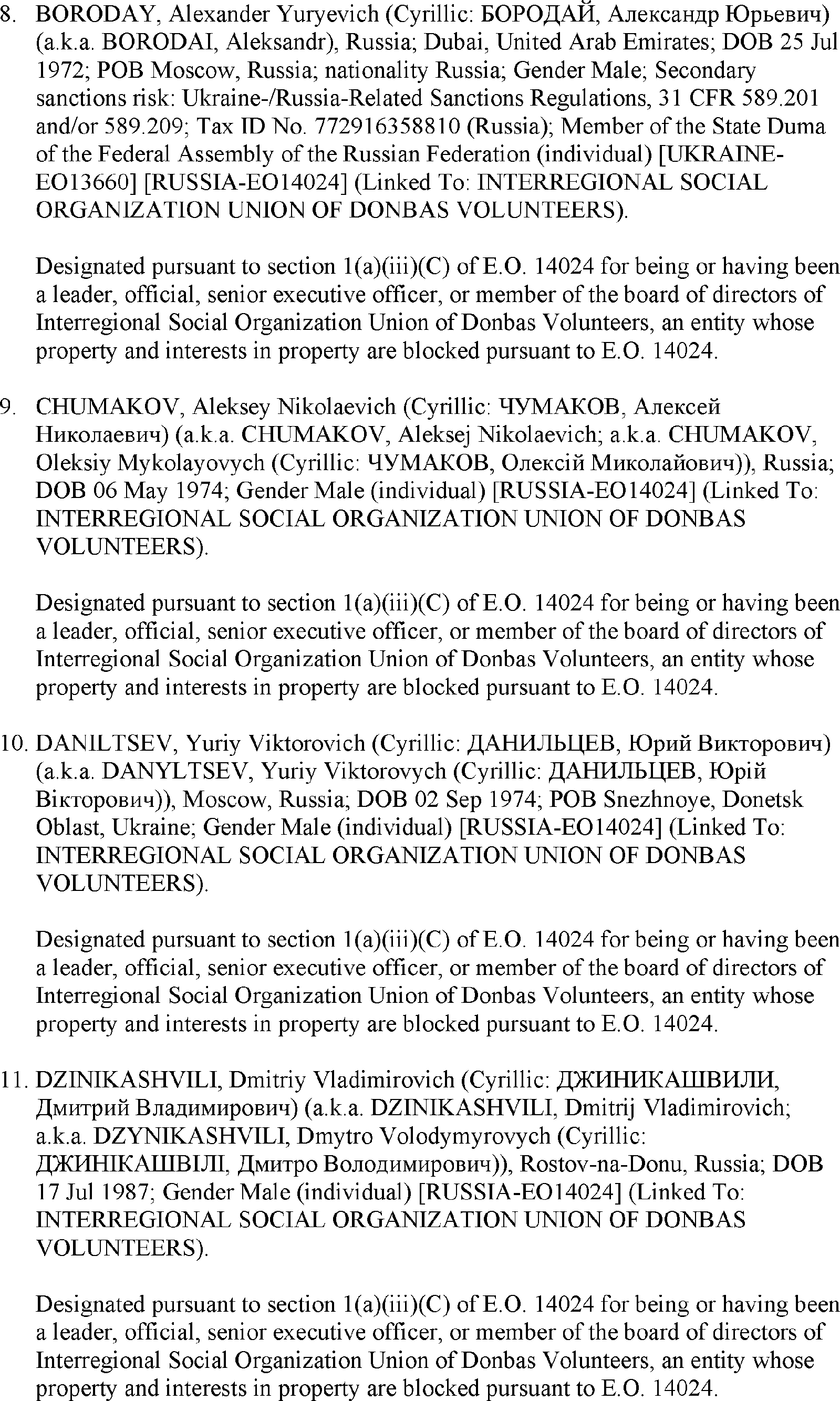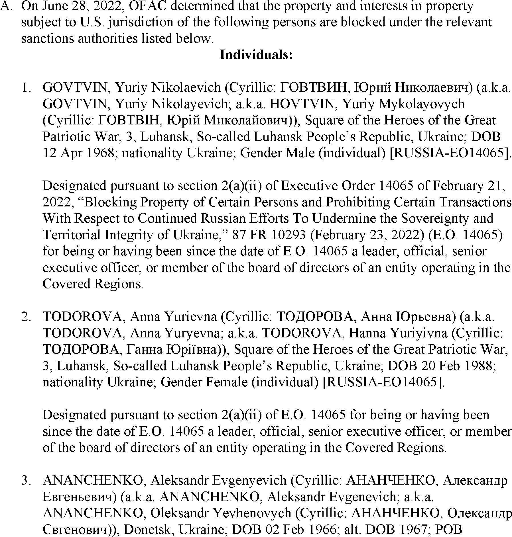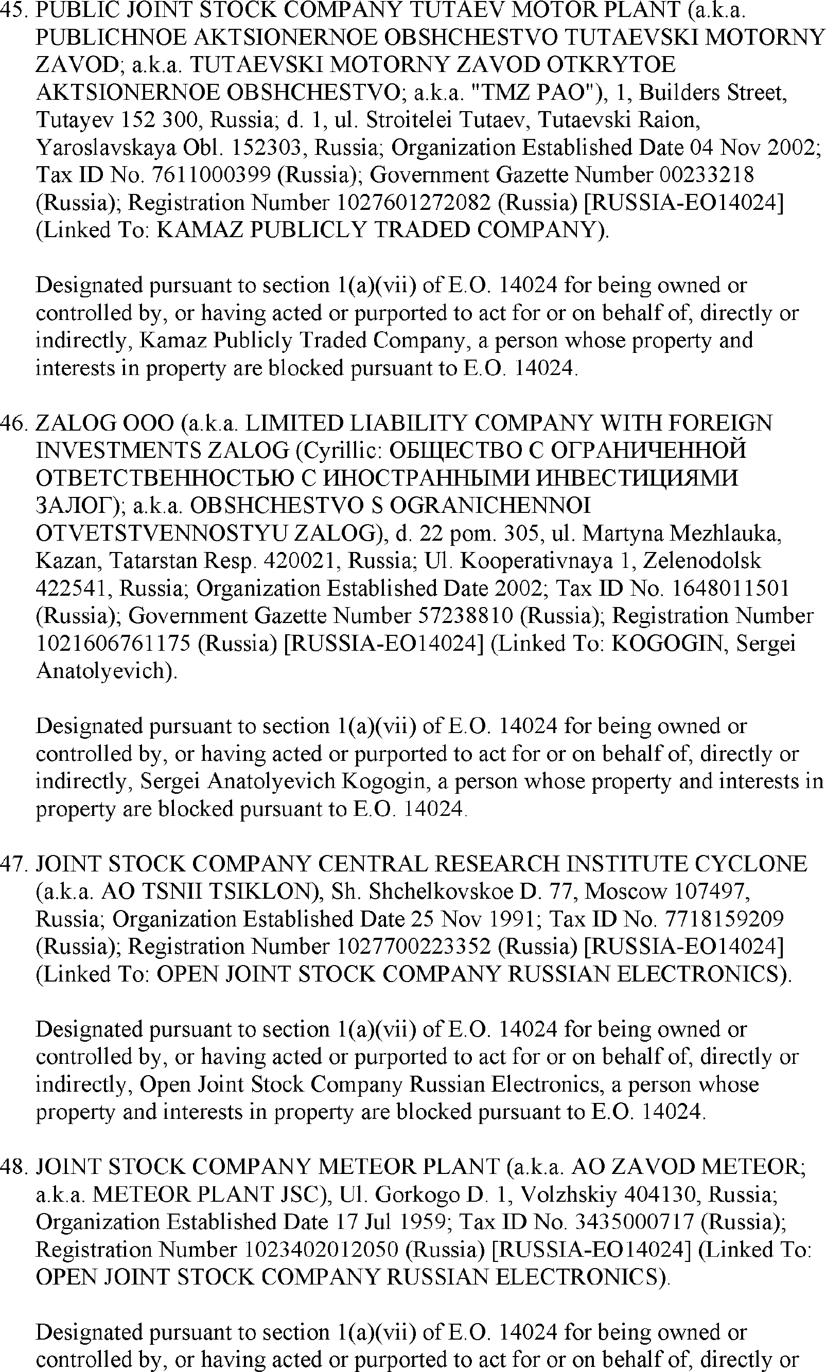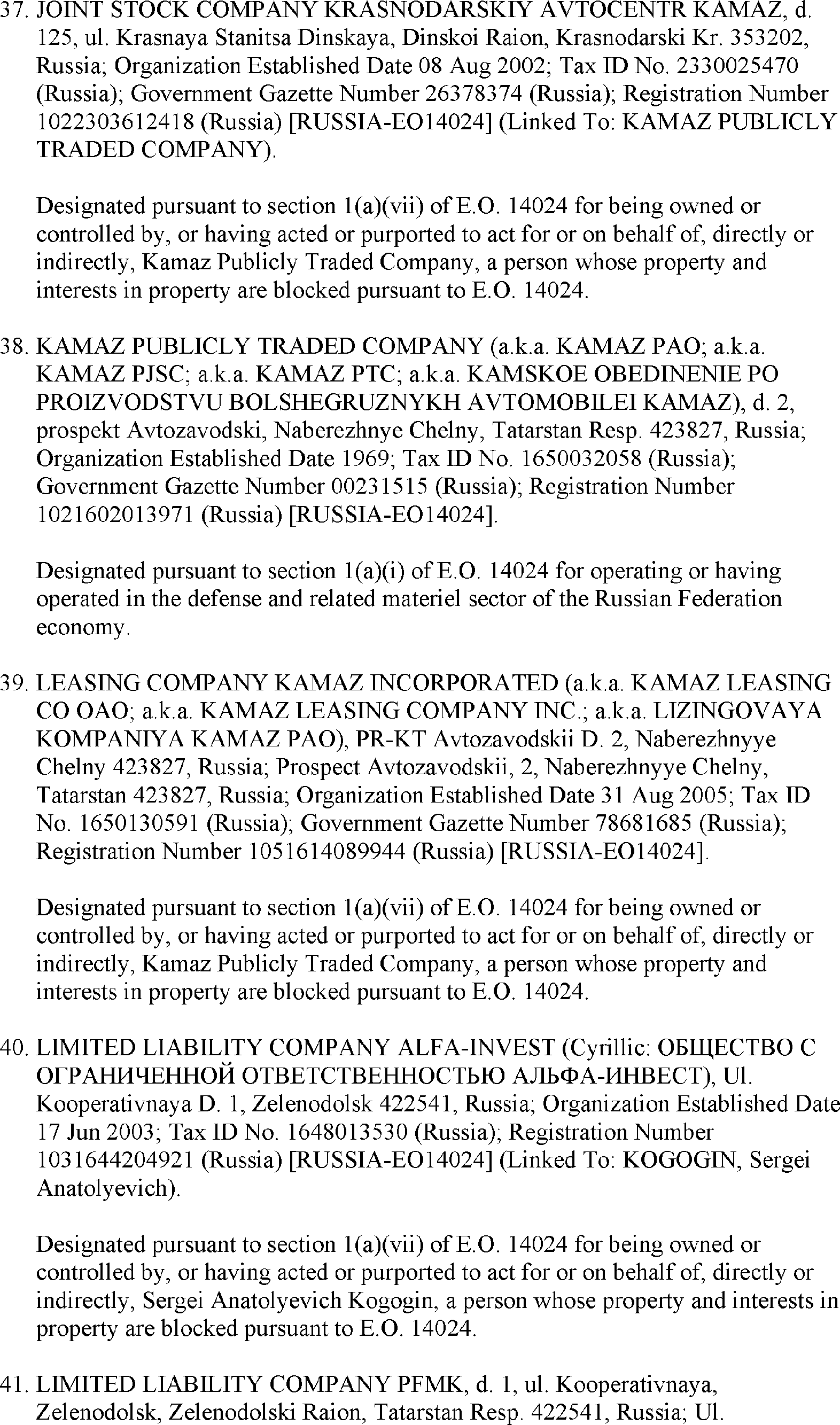 The U.S. Department of the Treasury's Office of Foreign Assets Control (OFAC) is publishing the names of one or more persons that have been placed on OFAC's Specially Designated Nationals and Blocked Persons List (SDN List) based on OFAC's determination that one or more ( printed page 39902) applicable legal criteria were satisfied. All property and interests in property subject to U.S. jurisdiction of these persons are blocked, and U.S. persons are generally prohibited from engaging in transactions with them. Additionally, OFAC is publishing updates to the identifying information of one or more persons currently included on the SDN List. OFAC is also publishing updates to the identifying information of one person currently included on the SDN List and the Sectoral Sanctions Identification List (SSI List); these updates will remove that person from the SDN List. OFAC is publishing updates to the identifying information of one person currently included on the SSI List; these updates will additionally add that person to the SDN List.