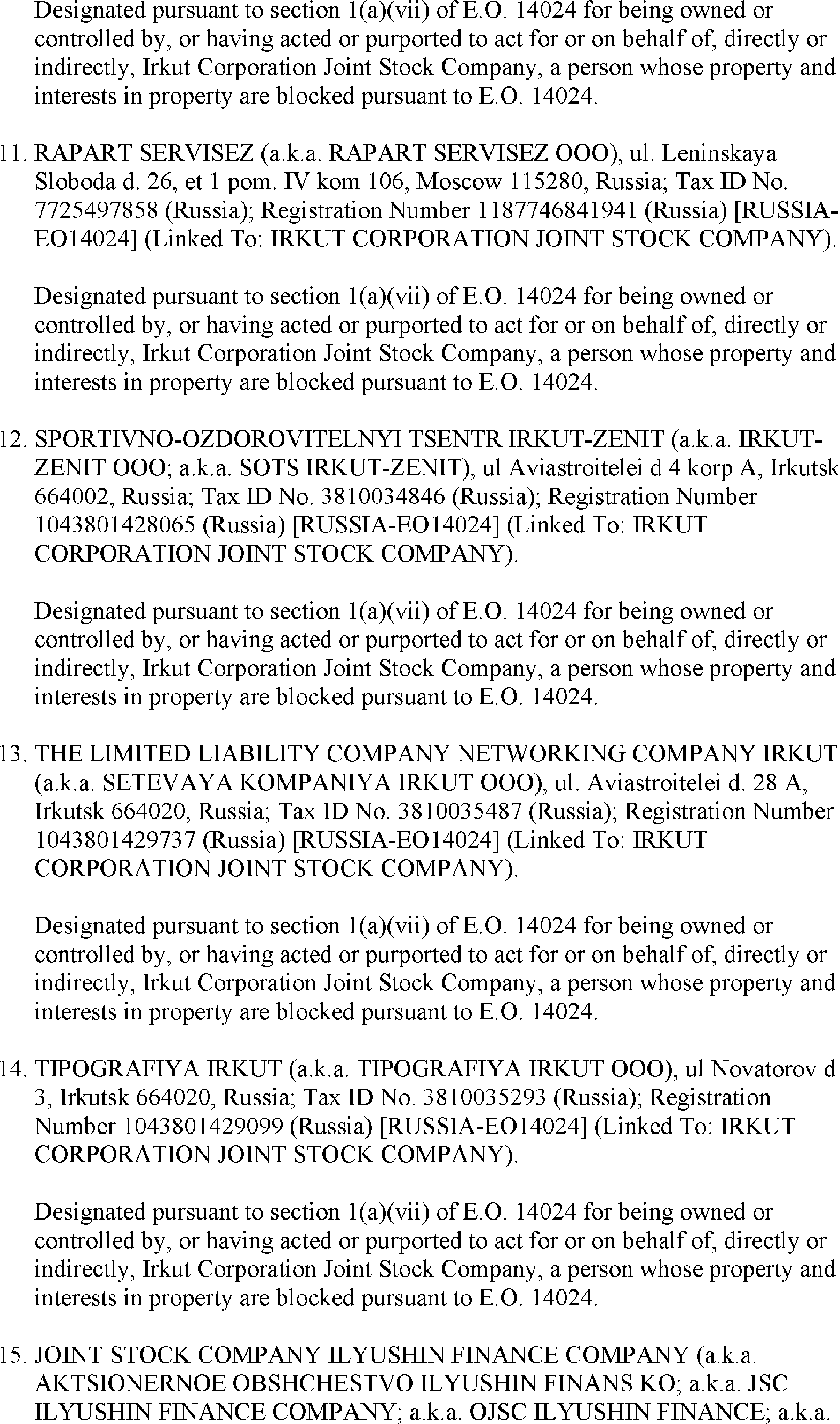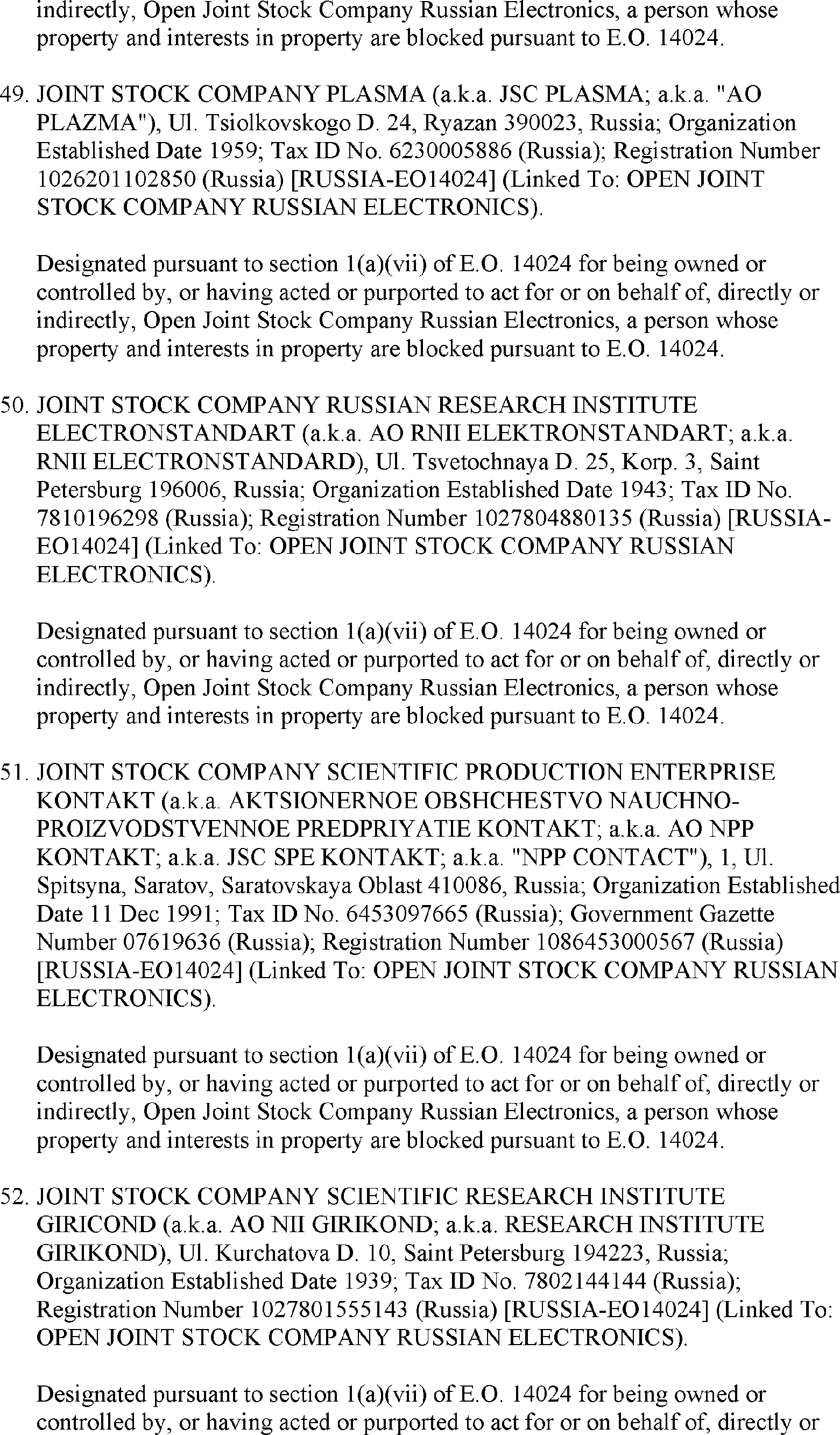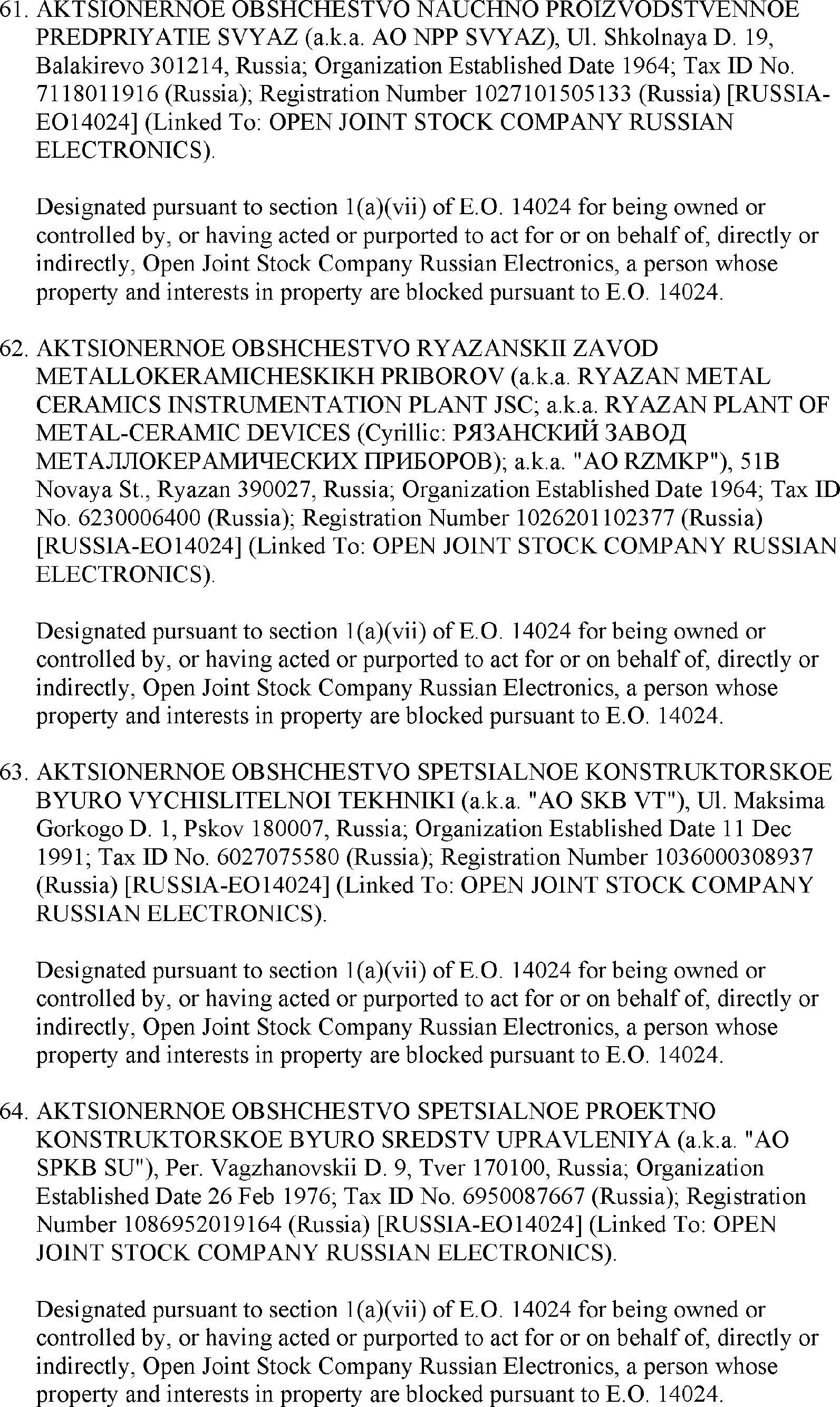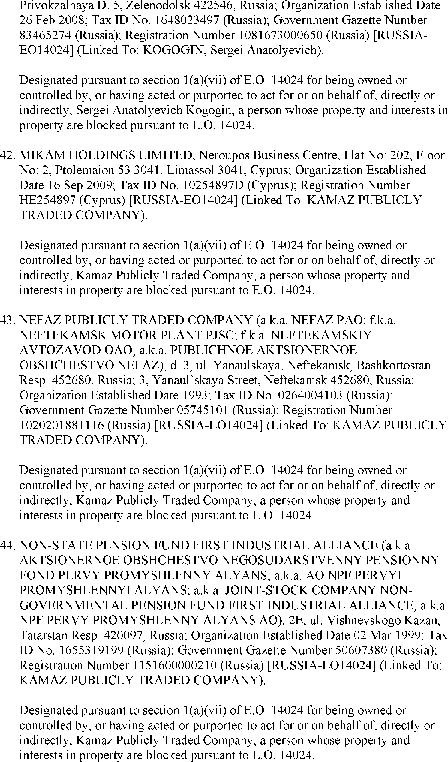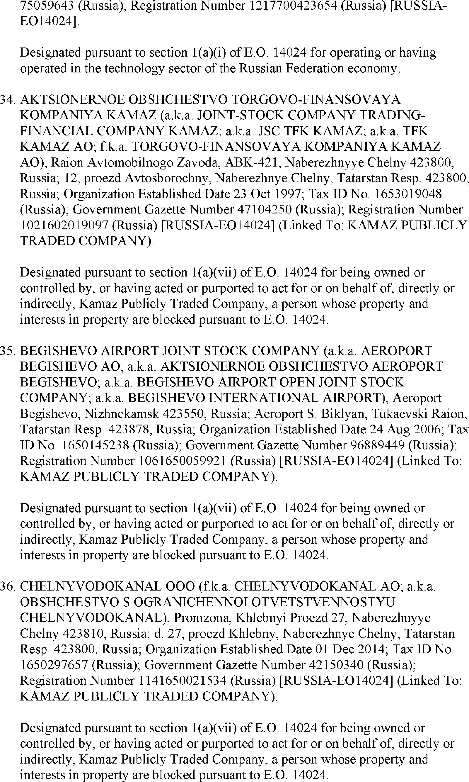 The U.S. Department of the Treasury's Office of Foreign Assets Control (OFAC) is publishing the names of one or more persons that have been placed on OFAC's Specially Designated Nationals and Blocked Persons List (SDN List) based on OFAC's determination that one or more ( printed page 39902) applicable legal criteria were satisfied. All property and interests in property subject to U.S. jurisdiction of these persons are blocked, and U.S. persons are generally prohibited from engaging in transactions with them. Additionally, OFAC is publishing updates to the identifying information of one or more persons currently included on the SDN List. OFAC is also publishing updates to the identifying information of one person currently included on the SDN List and the Sectoral Sanctions Identification List (SSI List); these updates will remove that person from the SDN List. OFAC is publishing updates to the identifying information of one person currently included on the SSI List; these updates will additionally add that person to the SDN List.