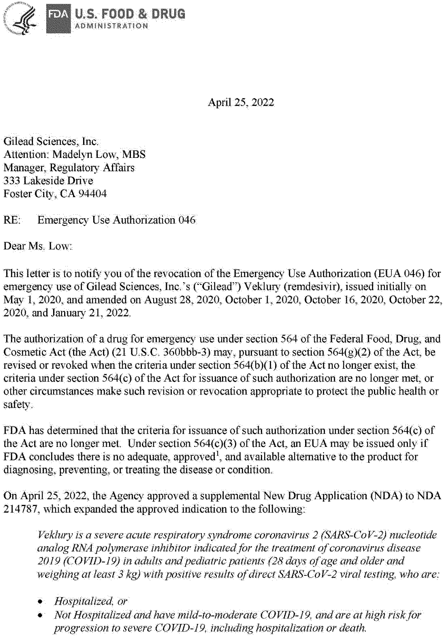 Under section 564(g)(2) of the FD&C Act, the Secretary of HHS may revoke an EUA if, among other things, the criteria for issuance are no longer met. On April 25, 2022, FDA revoked the EUA for VEKLURY because the criteria for issuance were no longer met. Under section 564(c)(3) of the FD&C Act, an EUA may be issued only if FDA concludes there is no adequate, approved,[1]