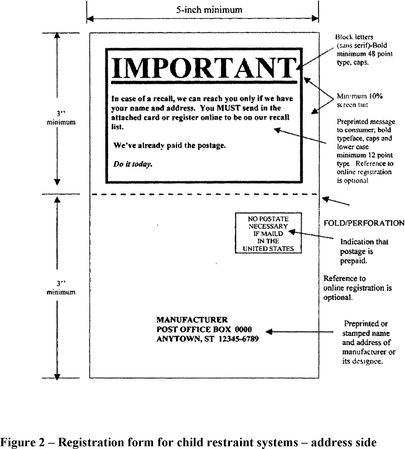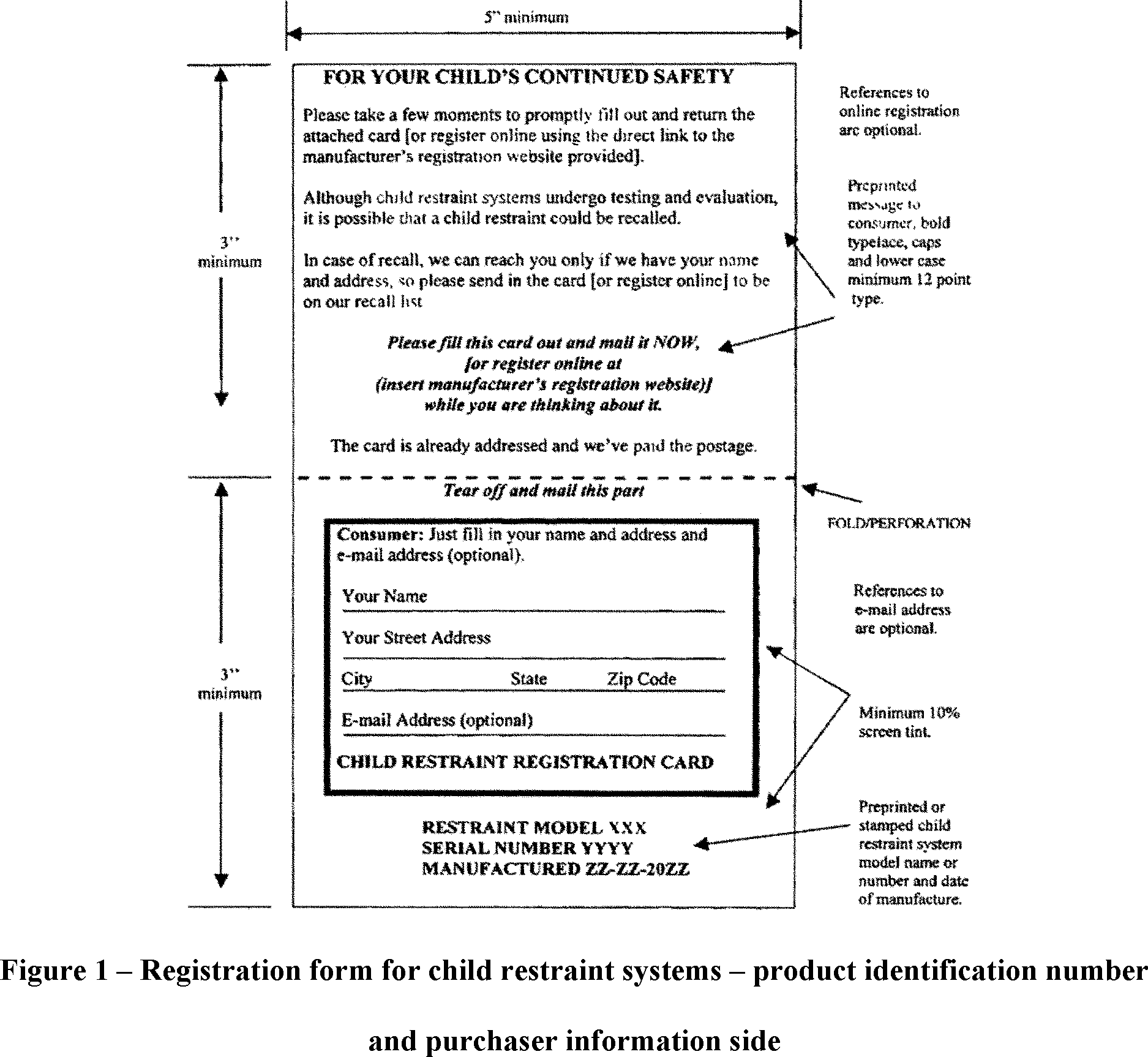 This information collection provides that manufacturers of child restraint systems (CRSs): (1) produce registration cards, labels and printed instructions (brochures), (2) collect CRS owner registration information, and (3) create and keep registration records so that, in the event of a safety recall, manufacturers can provide direct notification to owners. Child restraint manufacturers are required to provide an owner's registration card for purchasers of child safety seats in accordance with title 49 of the Code of Federal Regulations (CFR), part 571—section 213, “Child restraint systems.” The registration card is perforated into two-parts (see Figures 1 and 2). The top part contains a message and suitable instructions to be retained by the purchaser. The bottom part is to be returned to the manufacturer by the purchaser. The bottom part includes prepaid return postage, the pre-printed name/address of the manufacturer, the pre-printed model and date of manufacture, and spaces for purchasers to fill in their name and address. Optionally, child restraint manufacturers are permitted to add to the registration form: (a) Specified statements informing child restraint system (CRS) owners that they may register online; (b) the internet address for registering with the company; (c) revisions to statements reflecting use of the internet to register; and (d) a space for the consumer's email address. For those CRS owners with access to the internet, online registration may be a preferred method of registering a CRS.