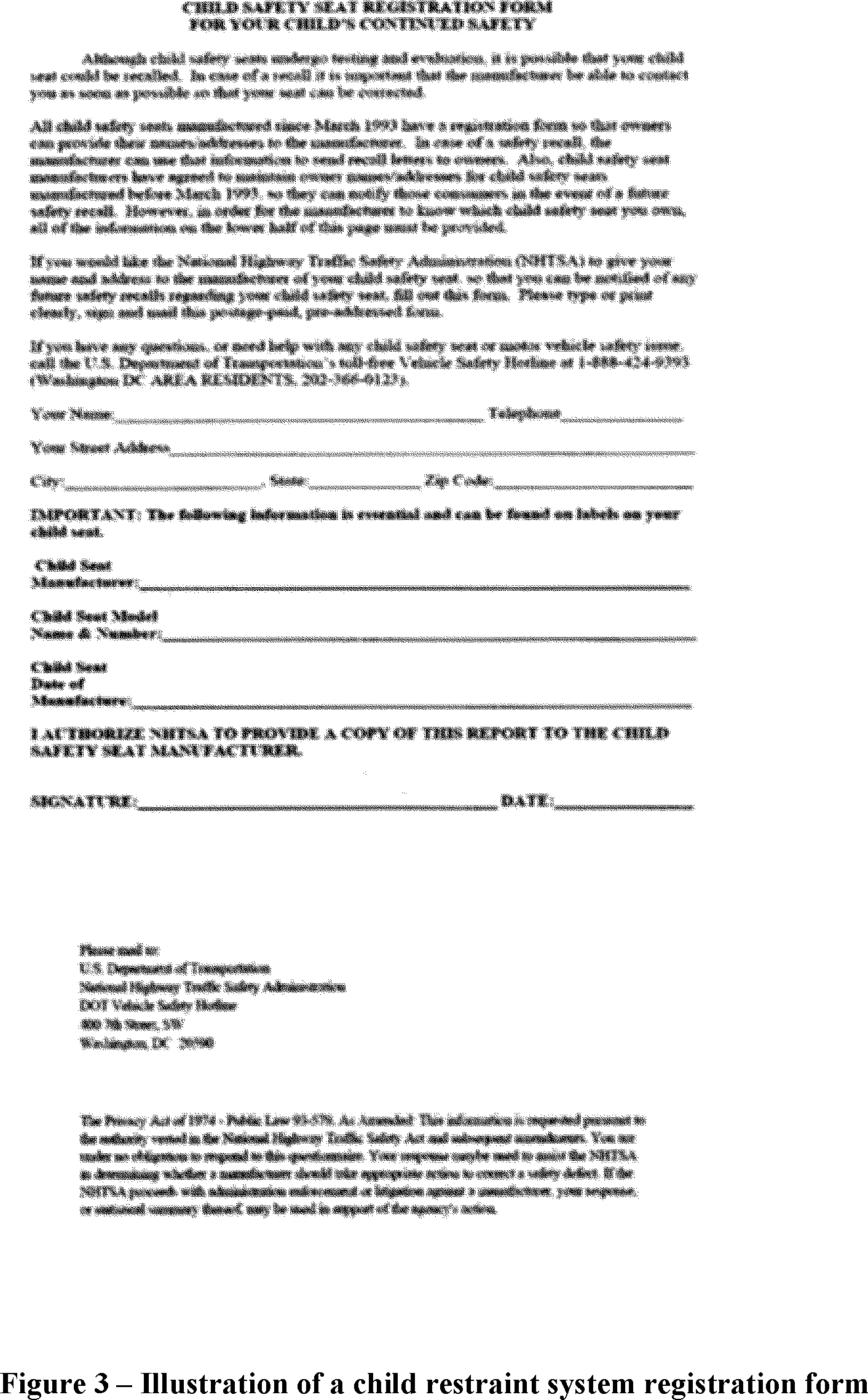 (see Figure 3). When the completed registration is returned to the agency, it is then submitted to the CRS manufacturer. In the absence of a substitute registration system, many owners of child passenger safety seats, especially any second-hand owners, might not be notified of safety defects and non-compliances, and would not have the defects and non-compliances remedied.