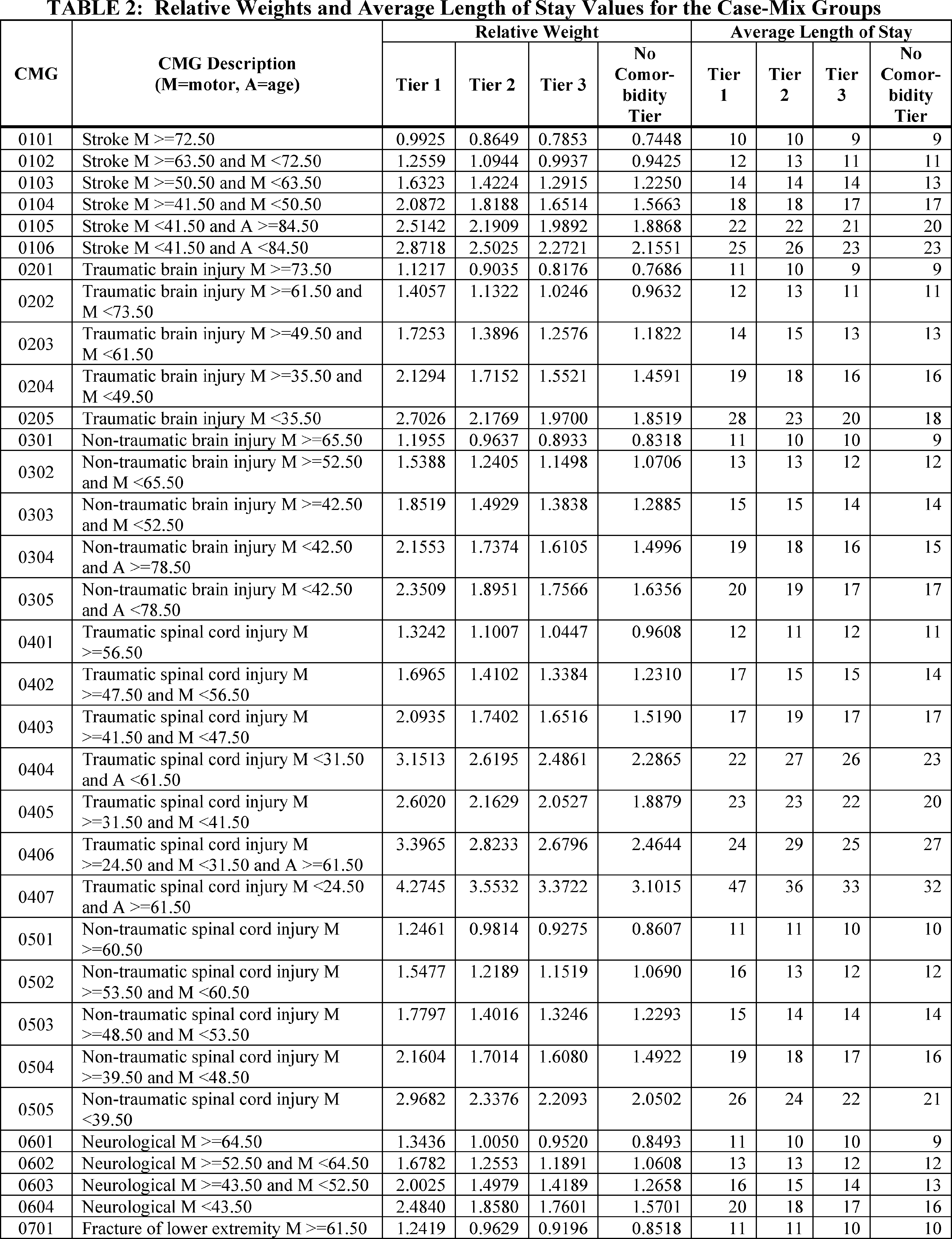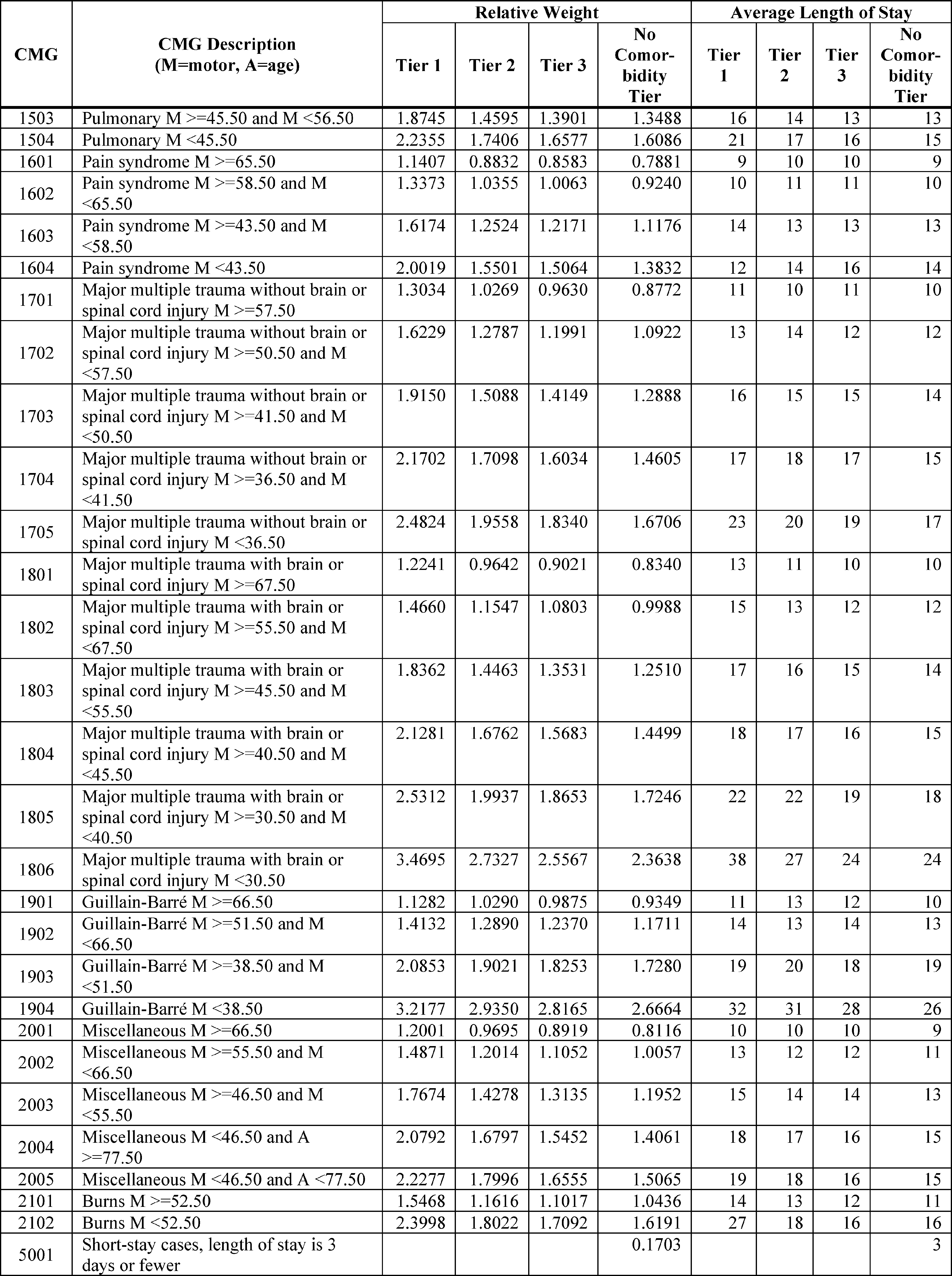 For each of the CMGs, we developed relative weighting factors to account for a patient's clinical characteristics and expected resource needs. Thus, the weighting factors accounted for the relative difference in resource use across all CMGs. Within each CMG, we created tiers based on the estimated effects that certain comorbidities would have on resource use.