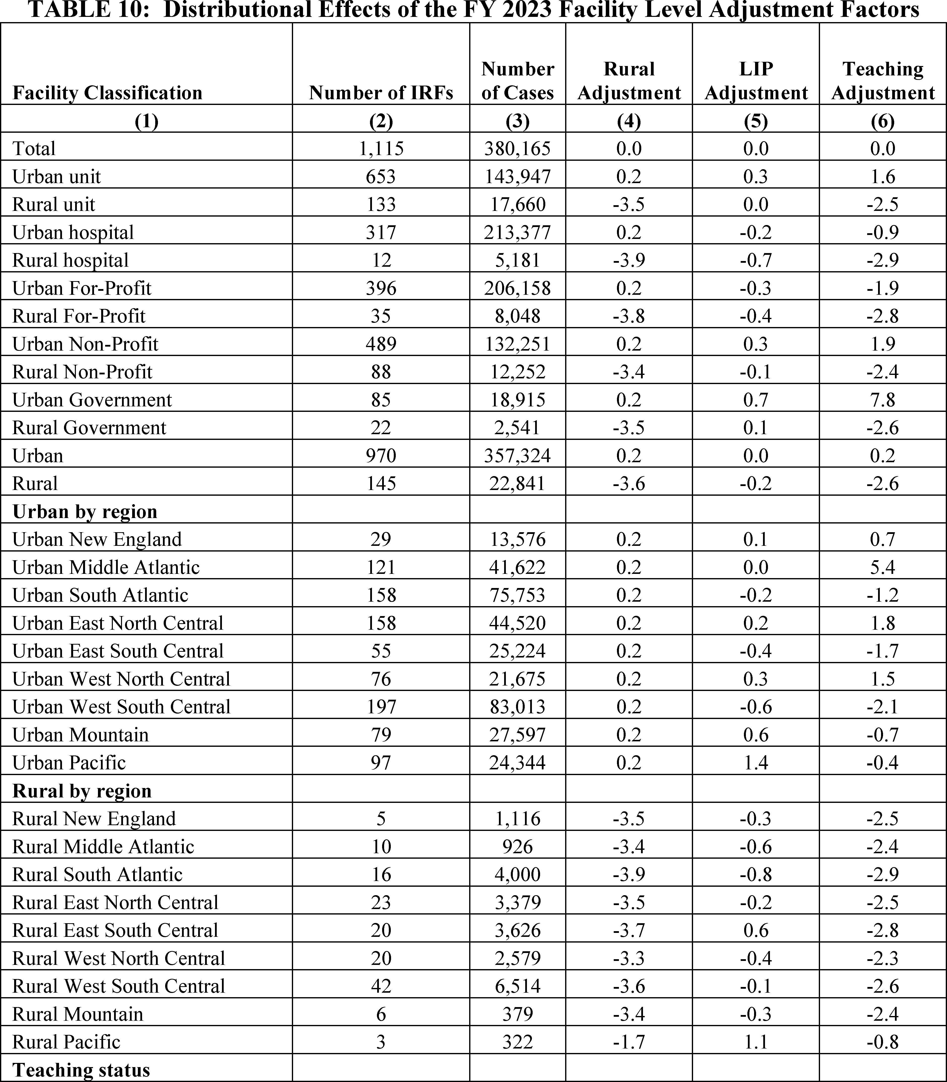 In this final rule, we use the methods described in the FY 2022 IRF PPS final rule (86 FR 42362) to update the prospective payment rates for FY 2023 using updated FY 2021 IRF claims and the most recent available IRF cost report data, which is FY 2020 IRF cost report data. This final rule codifies CMS' existing teaching status adjustment policy through amendments to the regulation text and updates and clarifies the IRF teaching status adjustment policy with respect to IRF hospital closures and displaced residents.