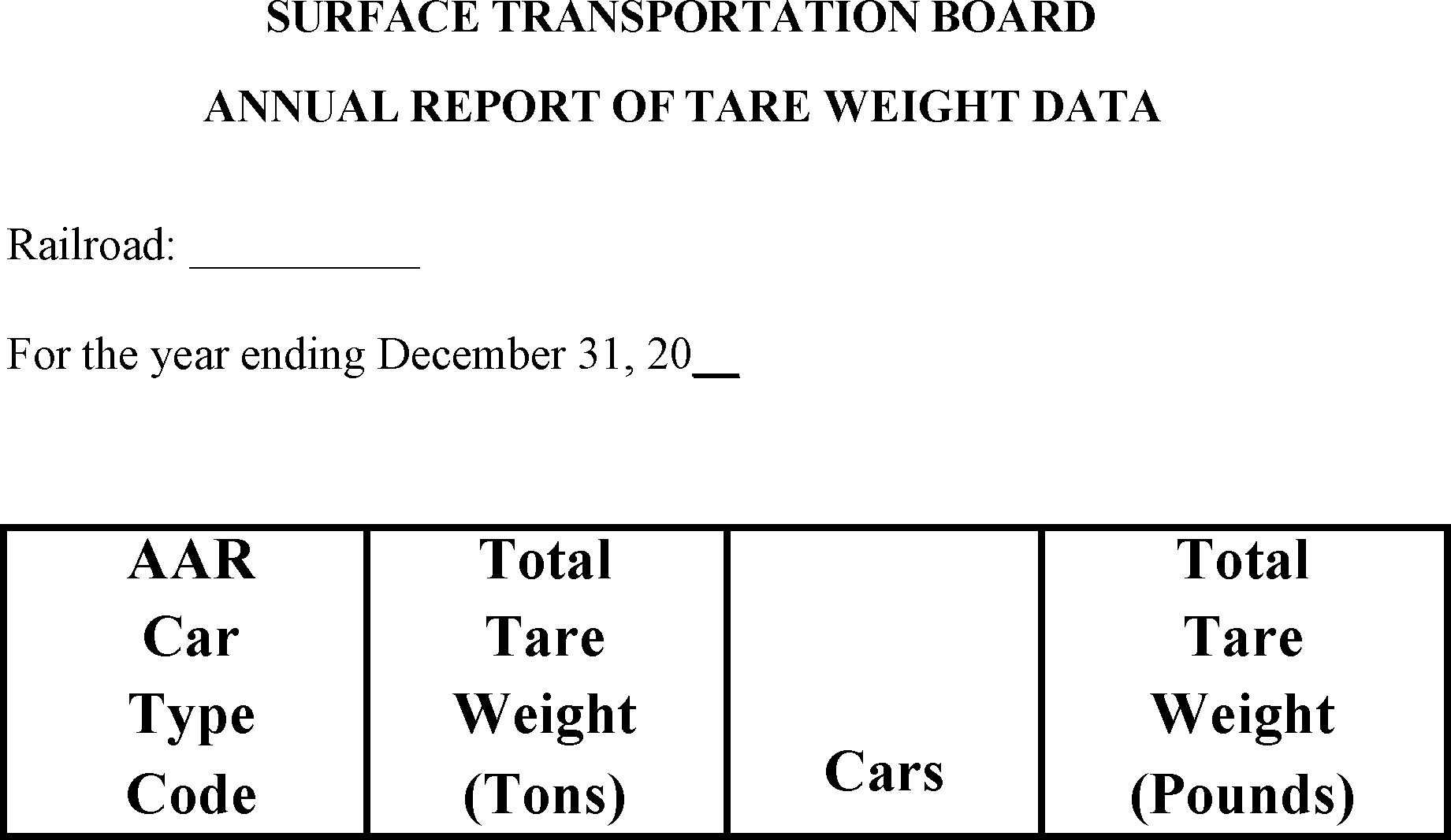 Class I carriers, either individually or through AAR, shall annually file tare weight data, as detailed in the Annual Report of Tare Weight Data, with the Surface Transportation Board's Office of Economics no later than May 31 of each year. Forms and instructions are available at