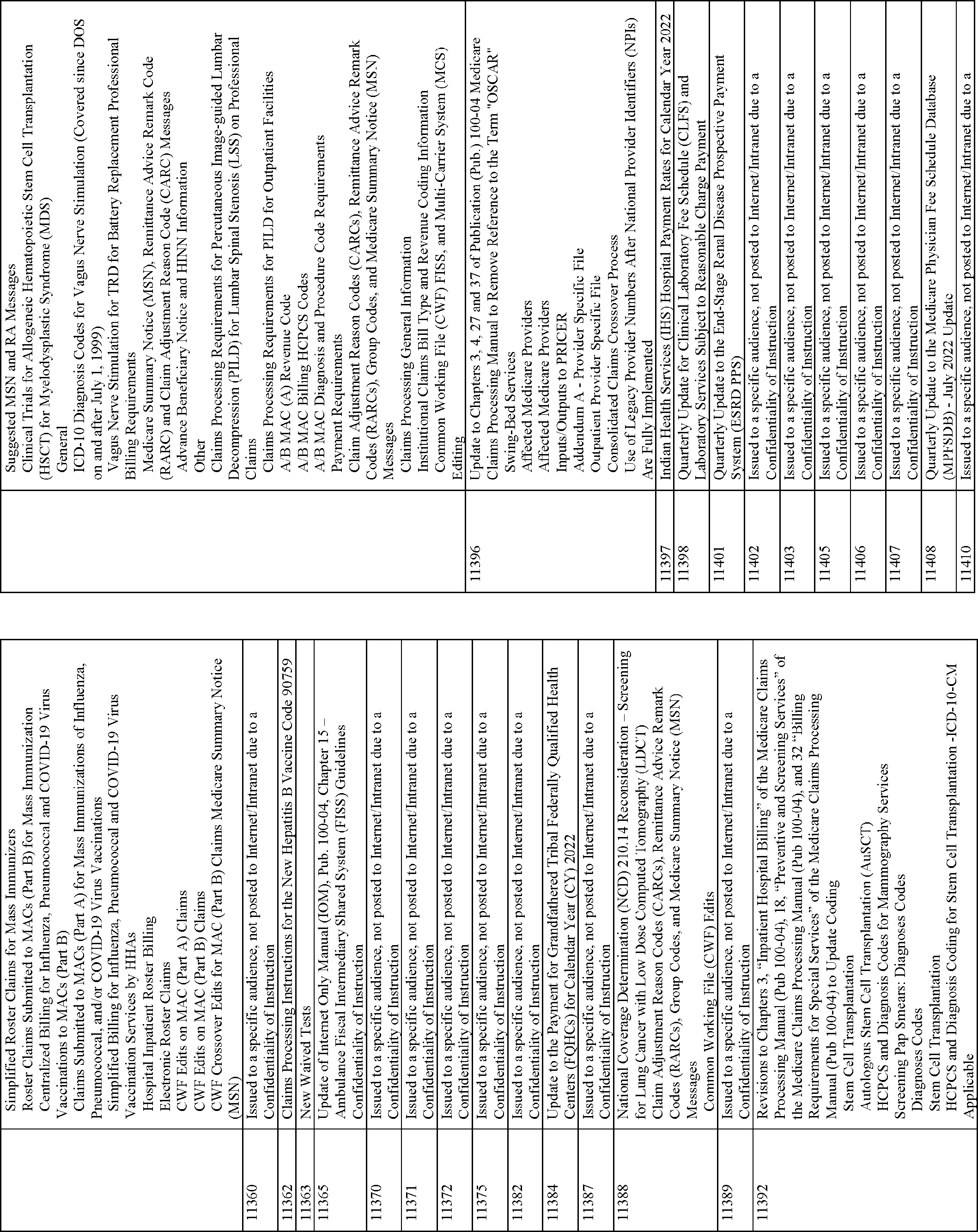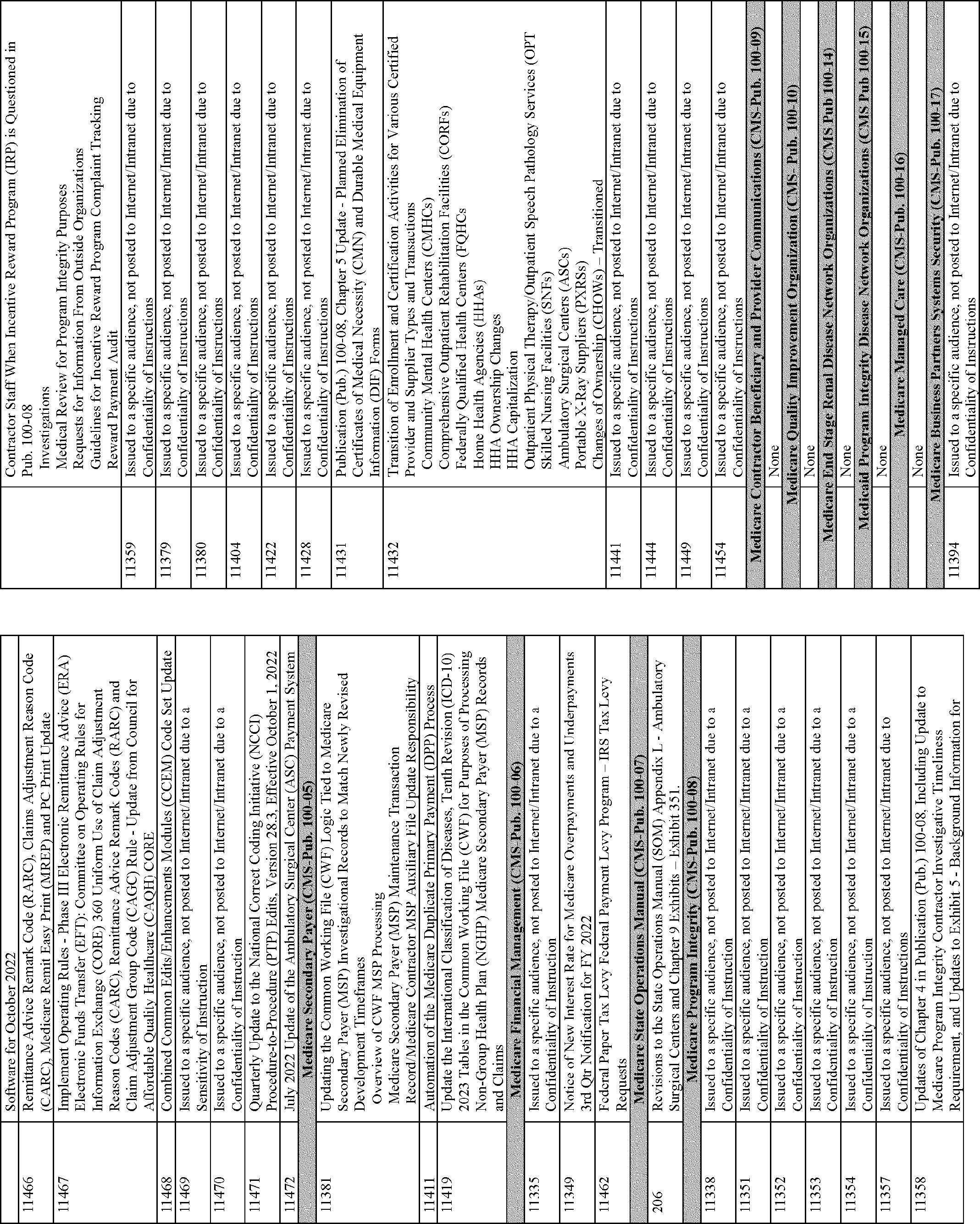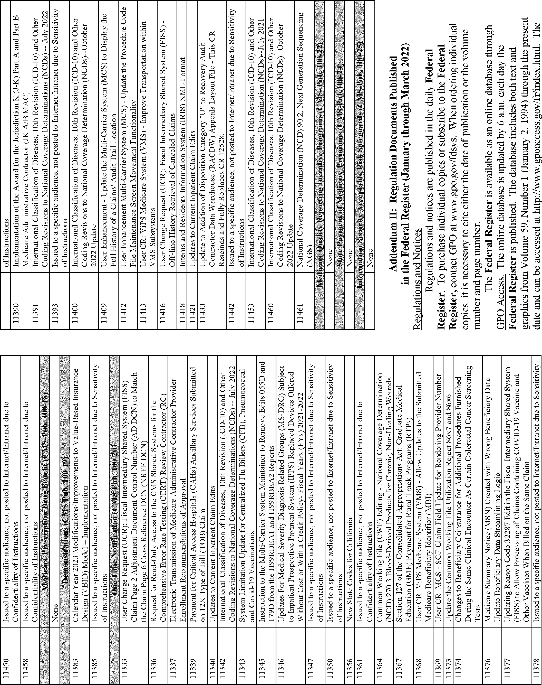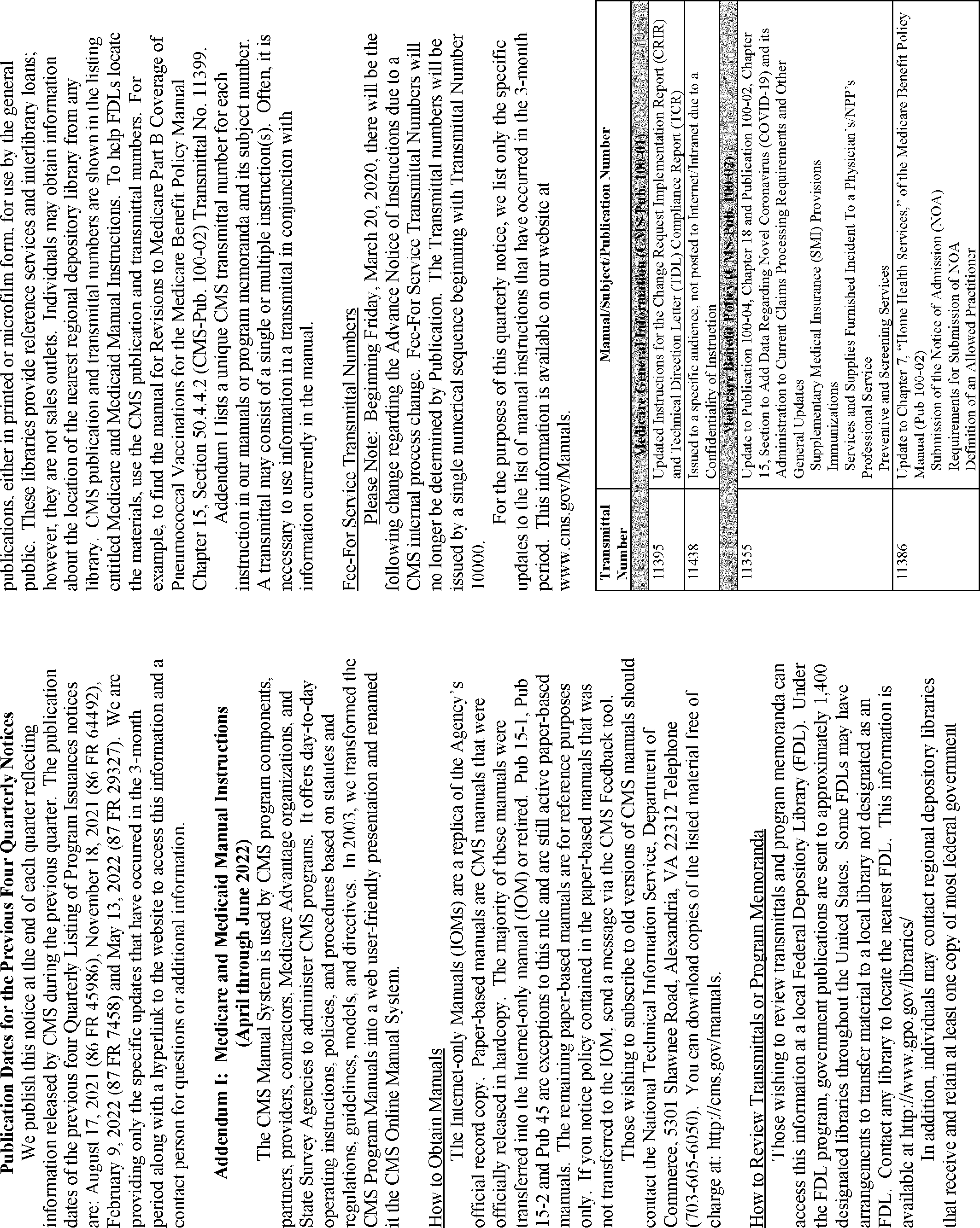 This quarterly notice lists CMS manual instructions, substantive and interpretive regulations, and other Federal Register notices that were published from April through June 2022, relating to the Medicare and Medicaid programs and other programs administered by CMS.