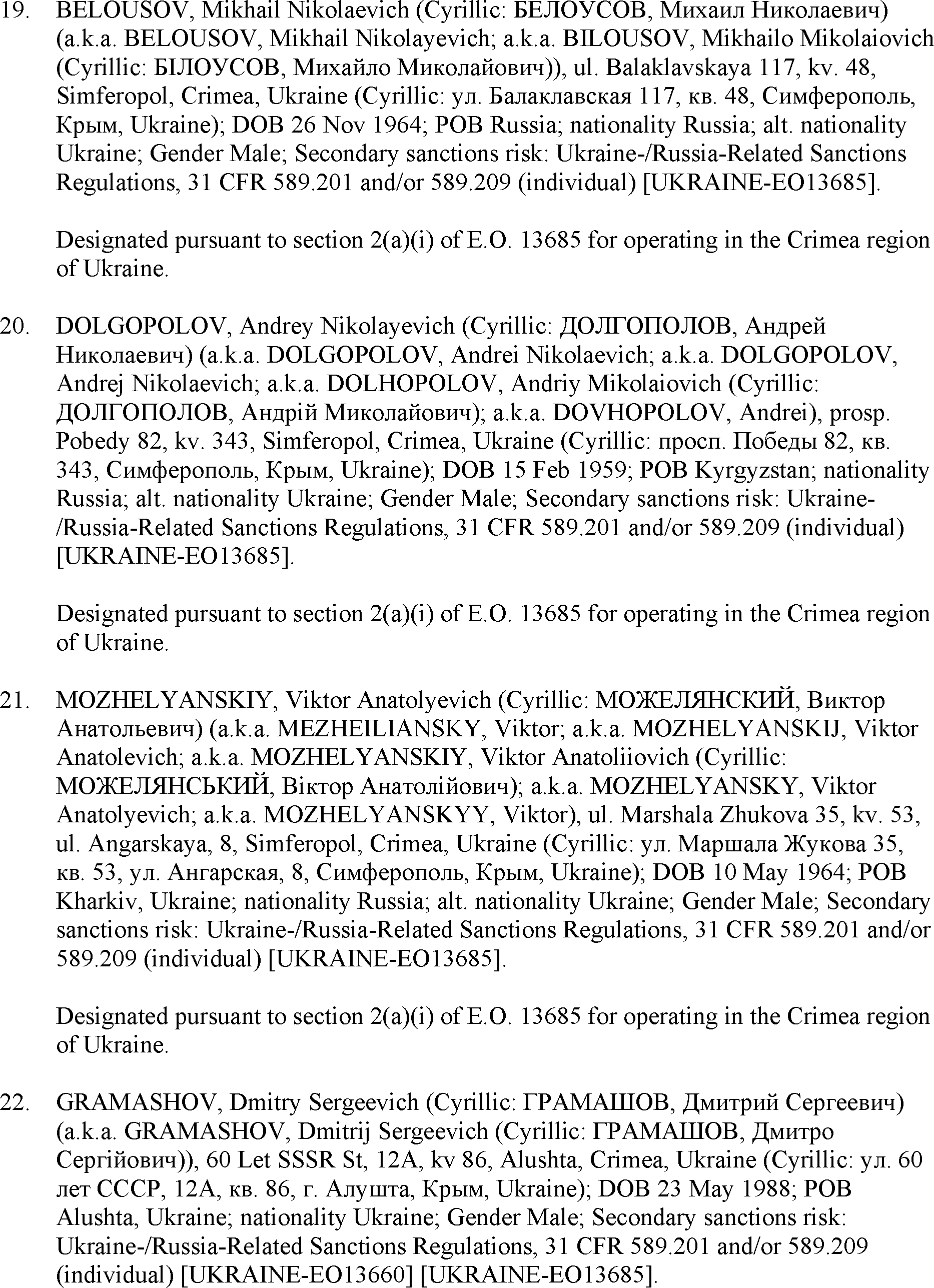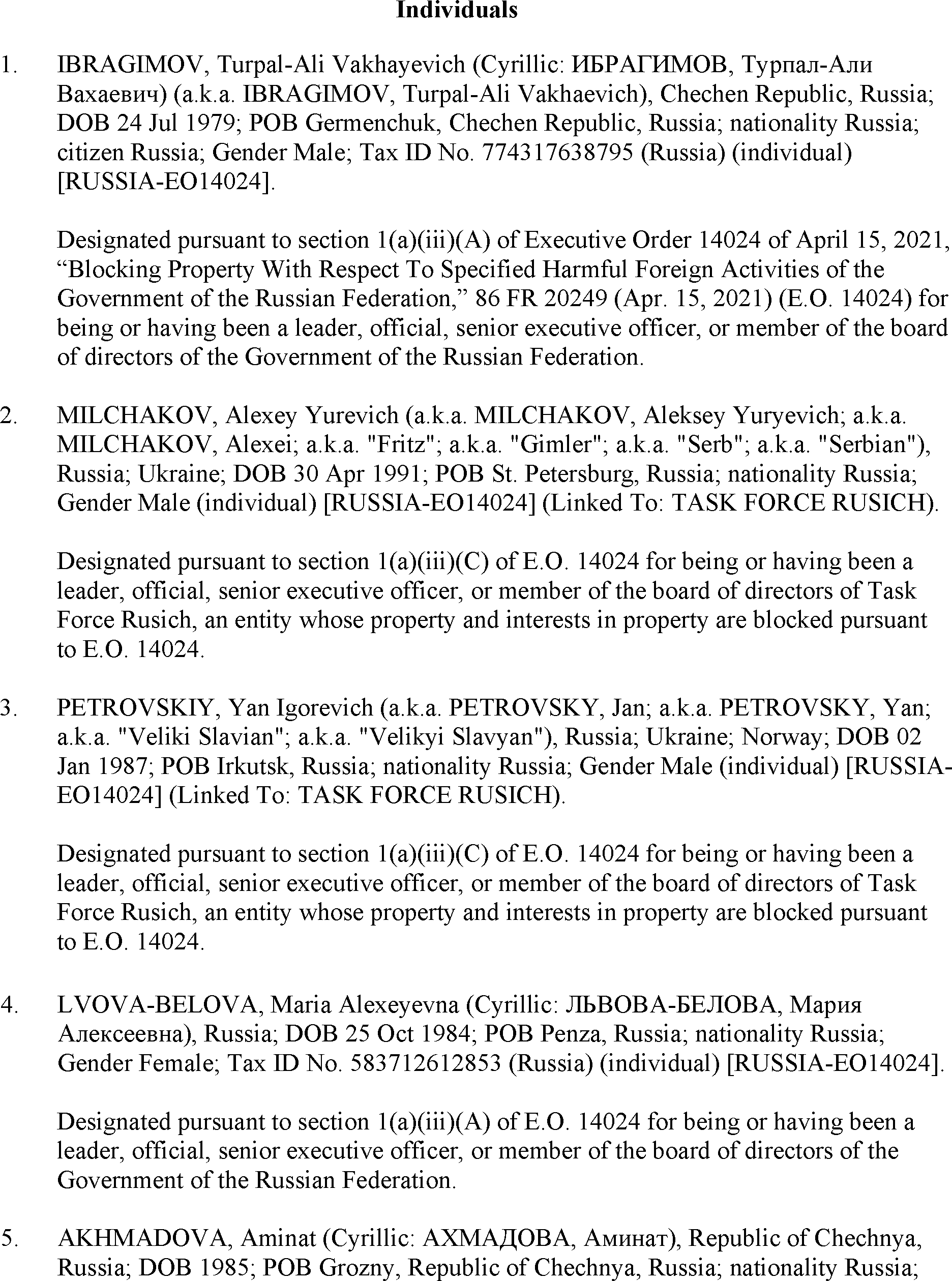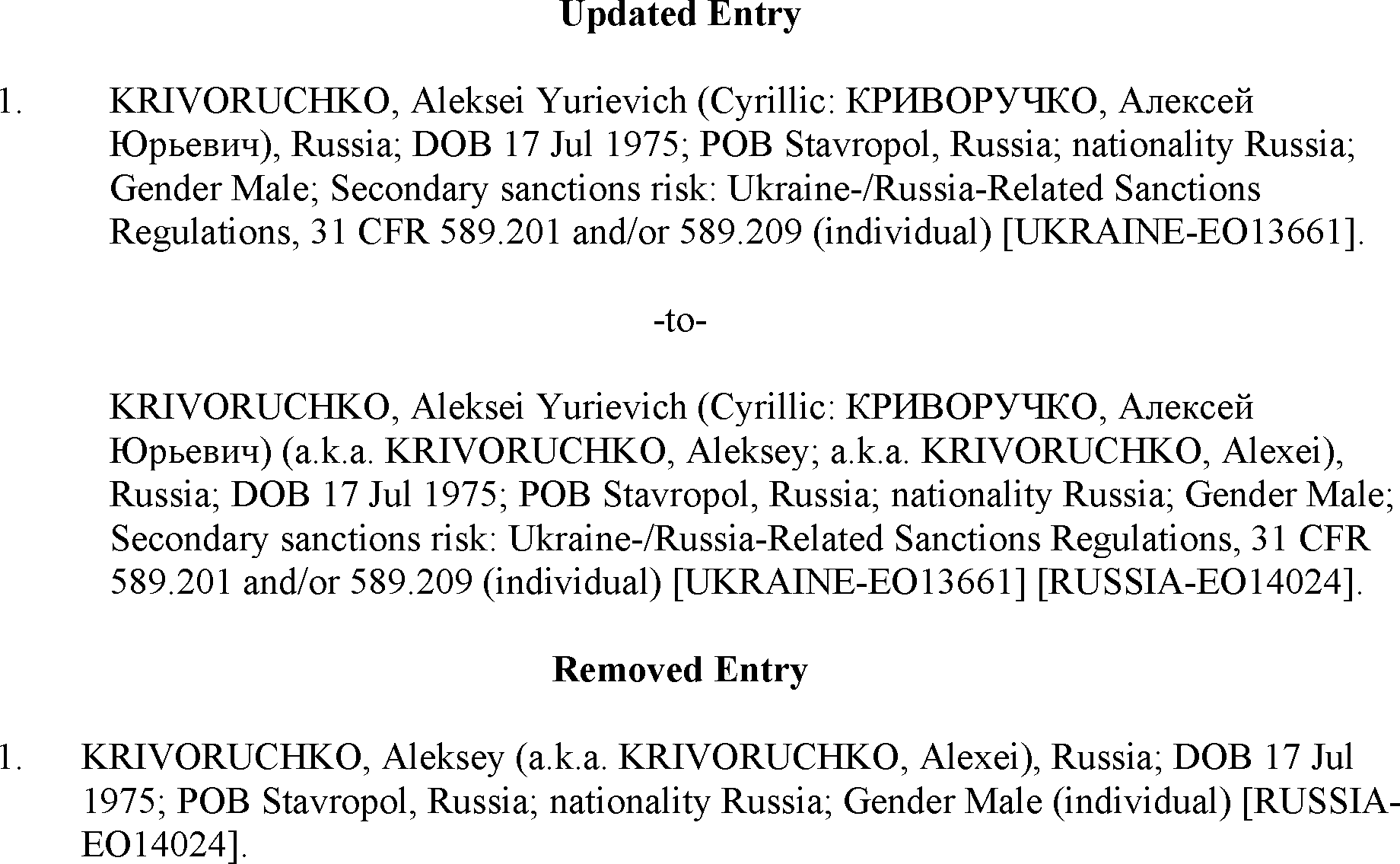 The U.S. Department of the Treasury's Office of Foreign Assets Control (OFAC) is publishing the names of one or more persons that have been placed on OFAC's Specially Designated Nationals and Blocked Persons List (SDN List) based on OFAC's determination that one or more applicable legal criteria were satisfied. All property and interests in property subject to U.S. jurisdiction of these persons are blocked, and U.S. persons are generally prohibited from engaging in transactions with them. Additionally, OFAC is publishing updates to the identifying information of one person currently included on the SDN List. OFAC is further publishing the name of one person that has been removed from the SDN List.