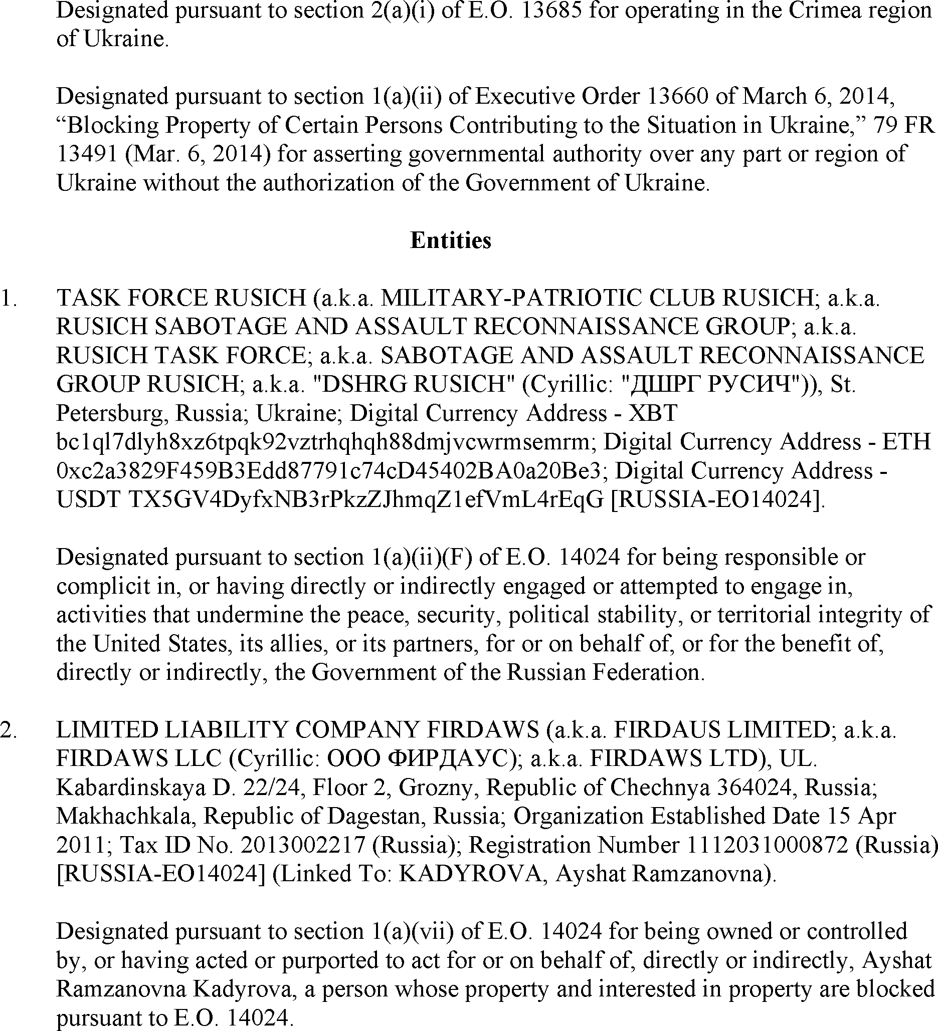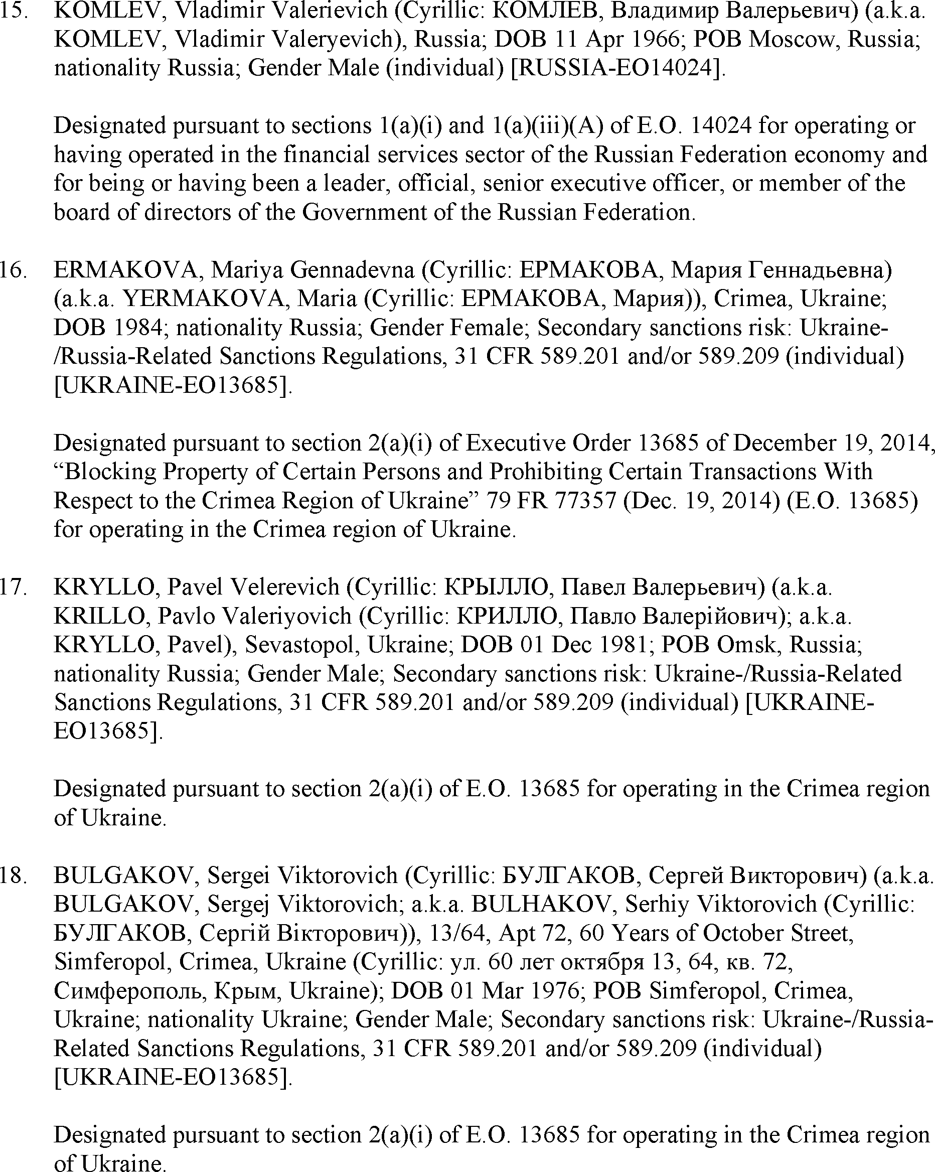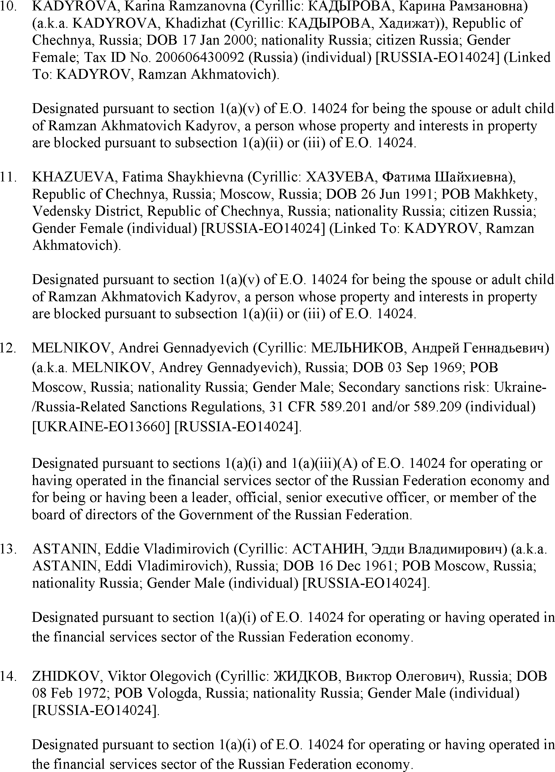 The U.S. Department of the Treasury's Office of Foreign Assets Control (OFAC) is publishing the names of one or more persons that have been placed on OFAC's Specially Designated Nationals and Blocked Persons List (SDN List) based on OFAC's determination that one or more applicable legal criteria were satisfied. All property and interests in property subject to U.S. jurisdiction of these persons are blocked, and U.S. persons are generally prohibited from engaging in transactions with them. Additionally, OFAC is publishing updates to the identifying information of one person currently included on the SDN List. OFAC is further publishing the name of one person that has been removed from the SDN List.