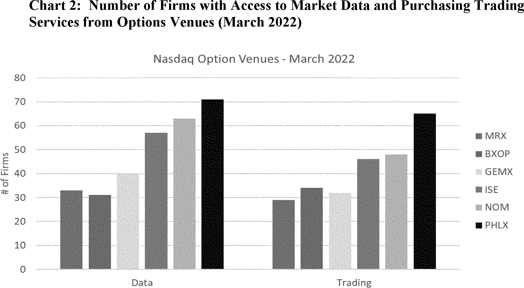 The second step in this analysis—demonstrating that only a small number of firms purchase market data relative to affiliated options exchanges—is shown in Chart 2, which compares the number of firms with access to market data from MRX to the number of firms purchasing market data from the four MRX-affiliated options exchanges, GEMX, ISE, The Nasdaq Stock Market LLC (“NOM”) and Nasdaq PHLX, LLC (“Phlx”).