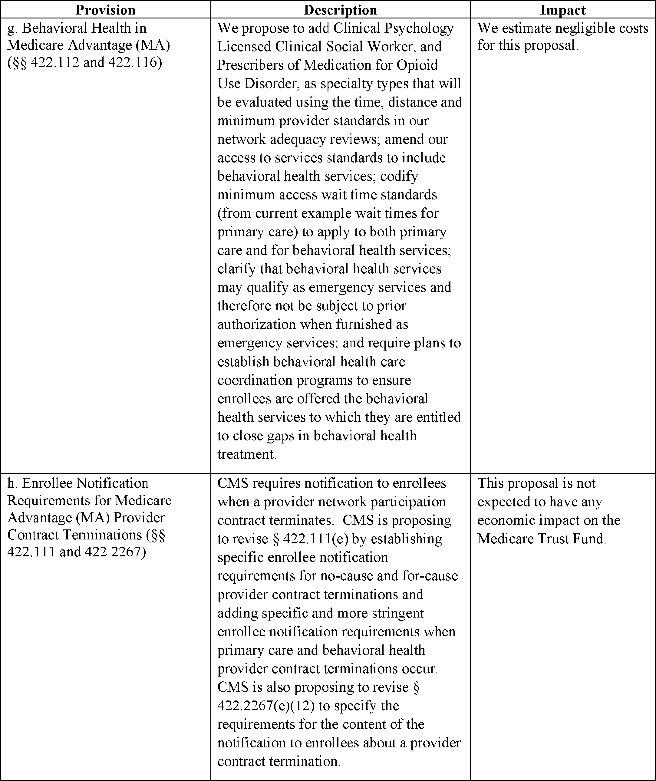 CMS requires notification to MA enrollees when a provider network participation contract terminates. CMS is proposing to revise § 422.111(e) by establishing specific enrollee notification requirements for no-cause and for-cause provider contract terminations and adding specific and more stringent enrollee notification requirements when primary care and behavioral health provider contract terminations occur. CMS is also proposing to revise § 422.2267(e)(12) to specify the requirements for the content of the notification to enrollees about a provider contract termination.