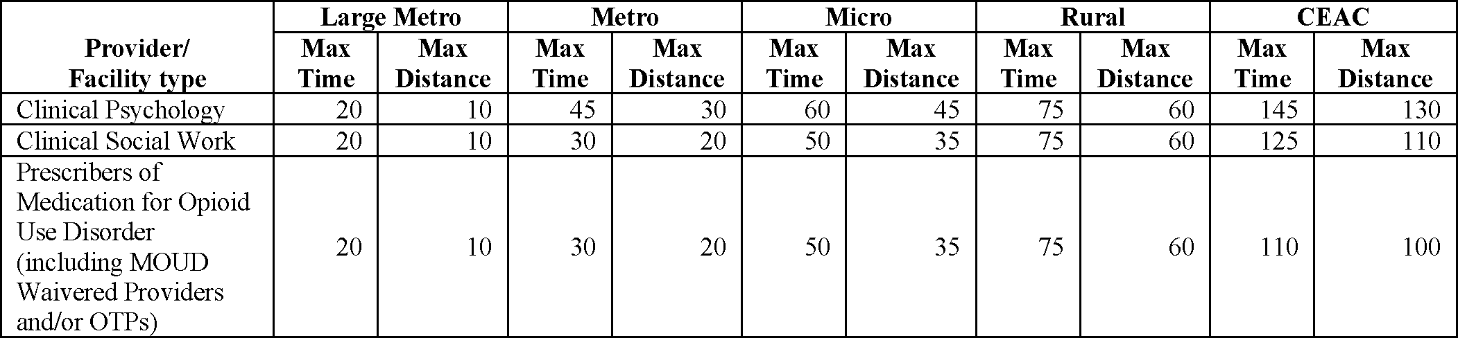 To strengthen our network adequacy requirements and reaffirm MA organizations' responsibilities to provide behavioral health services, we propose to: (1) add Clinical Psychology Licensed Clinical Social Worker, and Prescribers of Medication for Opioid Use Disorder as specialty types that will be evaluated as part of the network adequacy reviews under § 422.116, and make these new specialty types eligible for the 10-percentage point telehealth credit as allowed under § 422.116(d)(5); (2) amend our general access to services standards in § 422.112 to include explicitly behavioral health services; (3) codify, from existing guidance on reasonable wait times for primary care visits, standards for wait times that apply to both primary care and behavioral health services; (4) clarify that some behavioral health services may qualify as emergency services and, therefore, must not be subject to prior authorization; and (5) extend current requirements for MA organizations to establish programs to coordinate covered services with community and social services to behavioral health services programs to close equity gaps in treatment between physical health and behavioral health.
