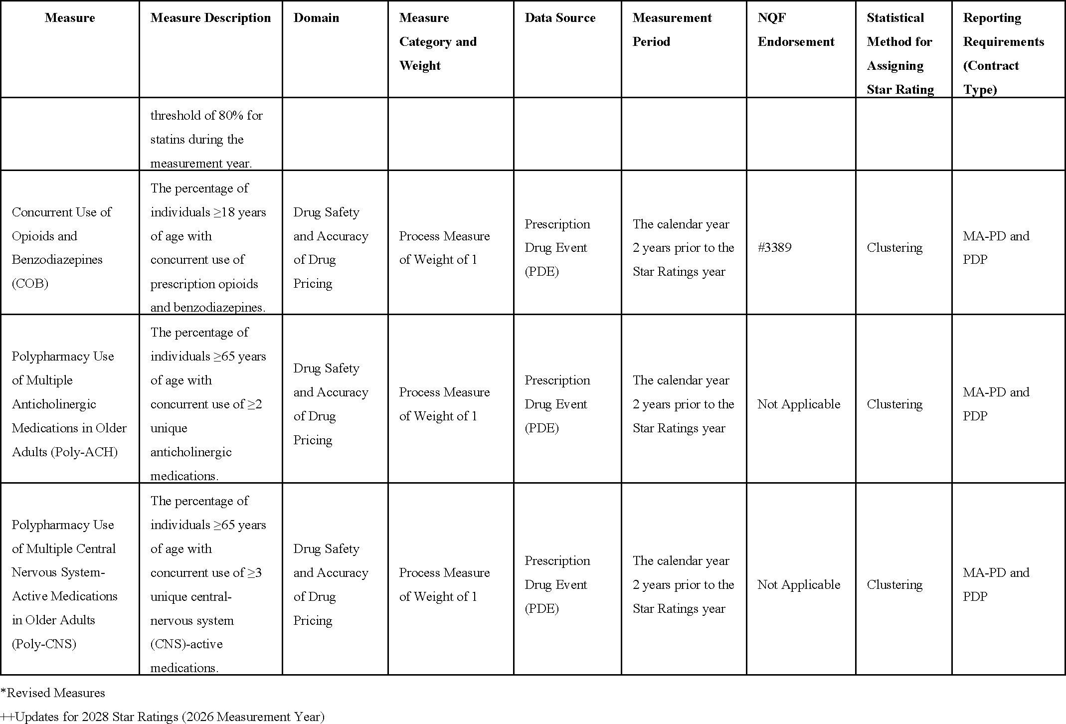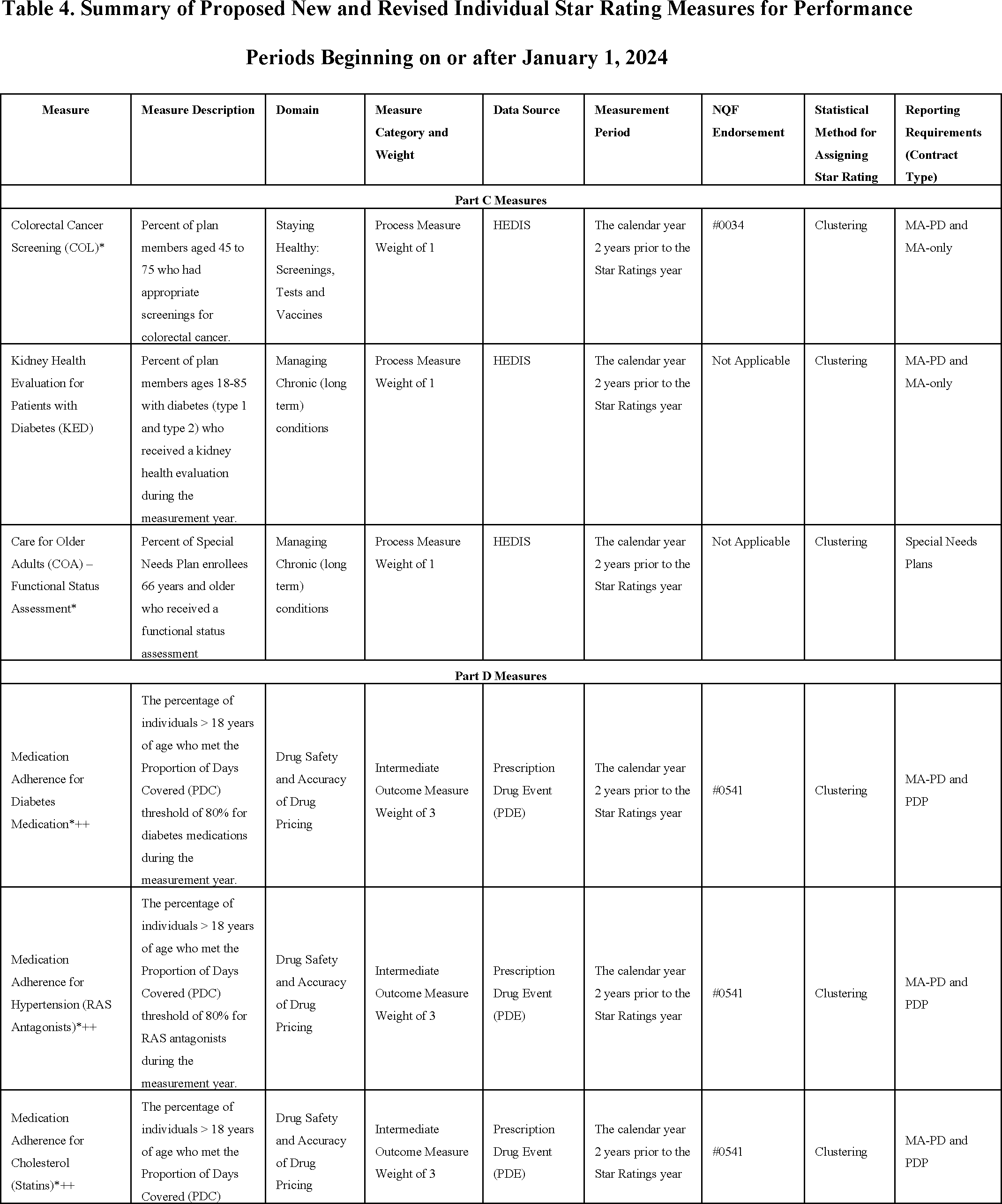 patient experience/complaints and access measures to further align efforts with other CMS quality programs and the current CMS Quality Strategy, as well as to better balance the contribution of the different types of measures in the Star Ratings program. We are also proposing to remove the Part C Diabetes Care—Kidney Disease Monitoring and the stand-alone Medication Reconciliation Post-discharge measures; add the Part C Kidney Health Evaluation for Patients with Diabetes and the updated Colorectal Cancer Screening and Care for Older Adults—Functional Status Assessment measures; add the Part D Concurrent Use of Opioids and Benzodiazepines, Polypharmacy Use of Multiple Anticholinergic Medications in Older Adults, and Polypharmacy Use of Multiple Central Nervous System Active Medications in Older Adults measures; and update the Part D Medication Adherence for Diabetes Medications, Medication Adherence for Hypertension (RAS Antagonists), and Medication Adherence for Cholesterol (Statins) measures. We are proposing to remove guardrails (that is, bi-directional caps that restrict upward and downward movement of a measure's cut points for the current year's measure-level Star Ratings compared to the prior year's measure-threshold specific cut points) when determining measure-specific-thresholds for non-Consumer Assessment of Healthcare Providers and Systems (CAHPS) measures; modify the Improvement Measure hold harmless policy; add a rule for the removal of Star Ratings measures; and remove the 60 percent rule that is part of the adjustment for extreme and uncontrollable circumstances (also called the disaster adjustment). We are also proposing a series of technical clarifications related to the disaster adjustment, Quality Bonus Payment (QBP) appeals processes, treatment of ratings for contracts after consolidation, weighting of measures with a substantive specification change, and addressing the codification error related to use of Tukey outlier deletion. These changes would apply (that is, data would be collected and performance measured) for the 2024 measurement period and the 2026 Star Ratings, except for the removal of the Part C Diabetes Care—Kidney Disease Monitoring measure, which would apply for the 2022 measurement period and the 2024 Star Ratings; the HEI reward, which would include data from the 2024 and 2025 measurement periods and apply for the 2027 Star Ratings; and the risk adjustment based on sociodemographic status characteristics to the three adherence measures, which would be implemented for the 2026 measurement period and the 2028 Star Ratings.