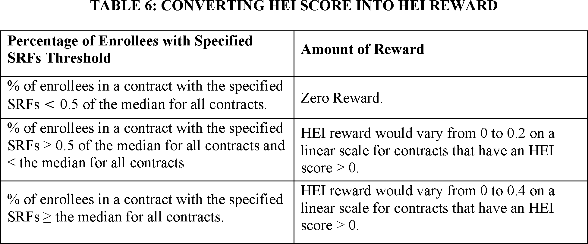 In this rule, we are proposing a health equity index (HEI) reward for the 2027 Star Ratings to further incentivize Parts C and D plans to focus on improving care for enrollees with social risk factors (SRFs); as part of this change, we are also proposing to remove the current reward factor. This proposal supports CMS efforts to ensure attainment of the highest level of health for all people. We are proposing to reduce the weight of