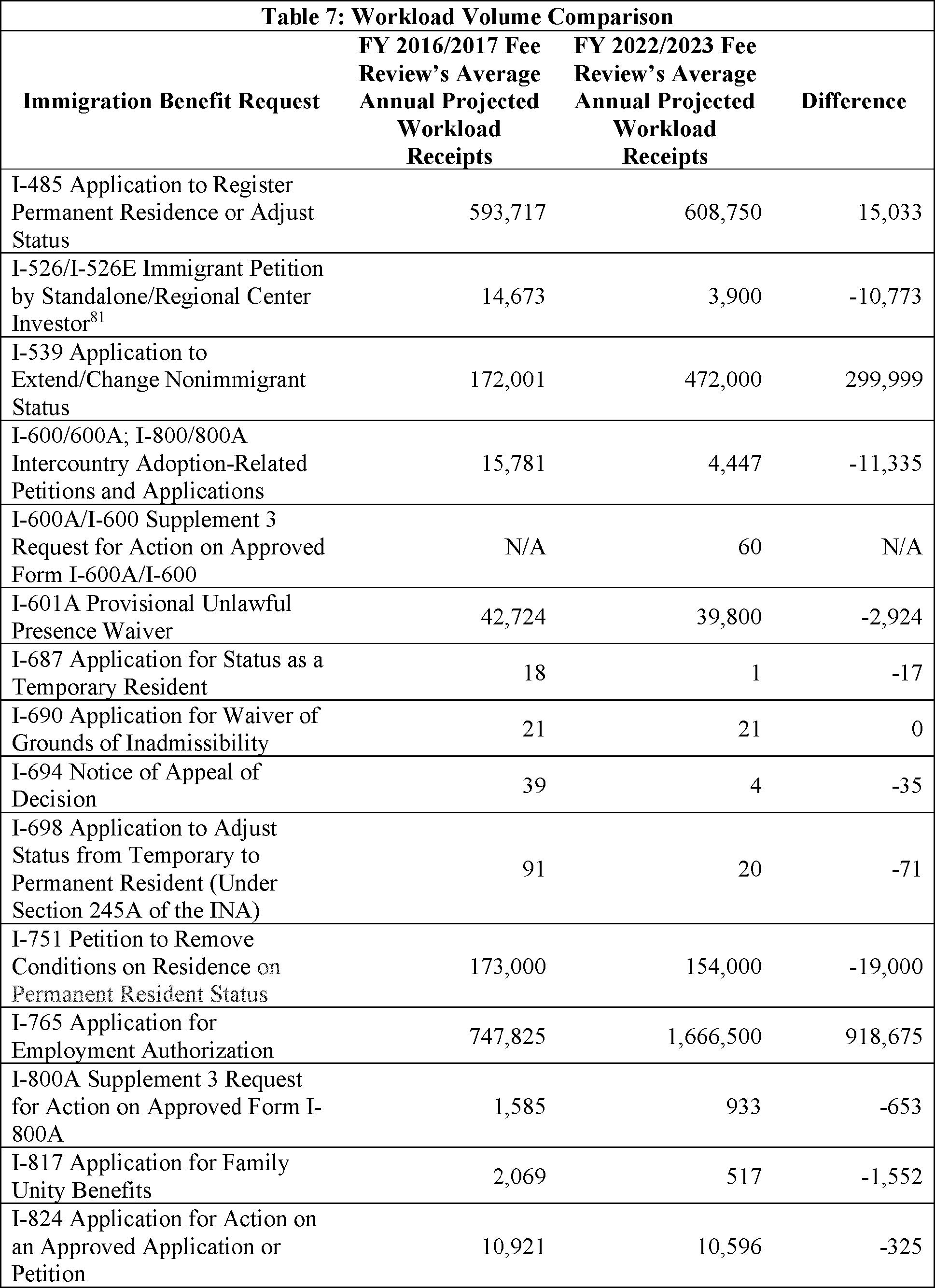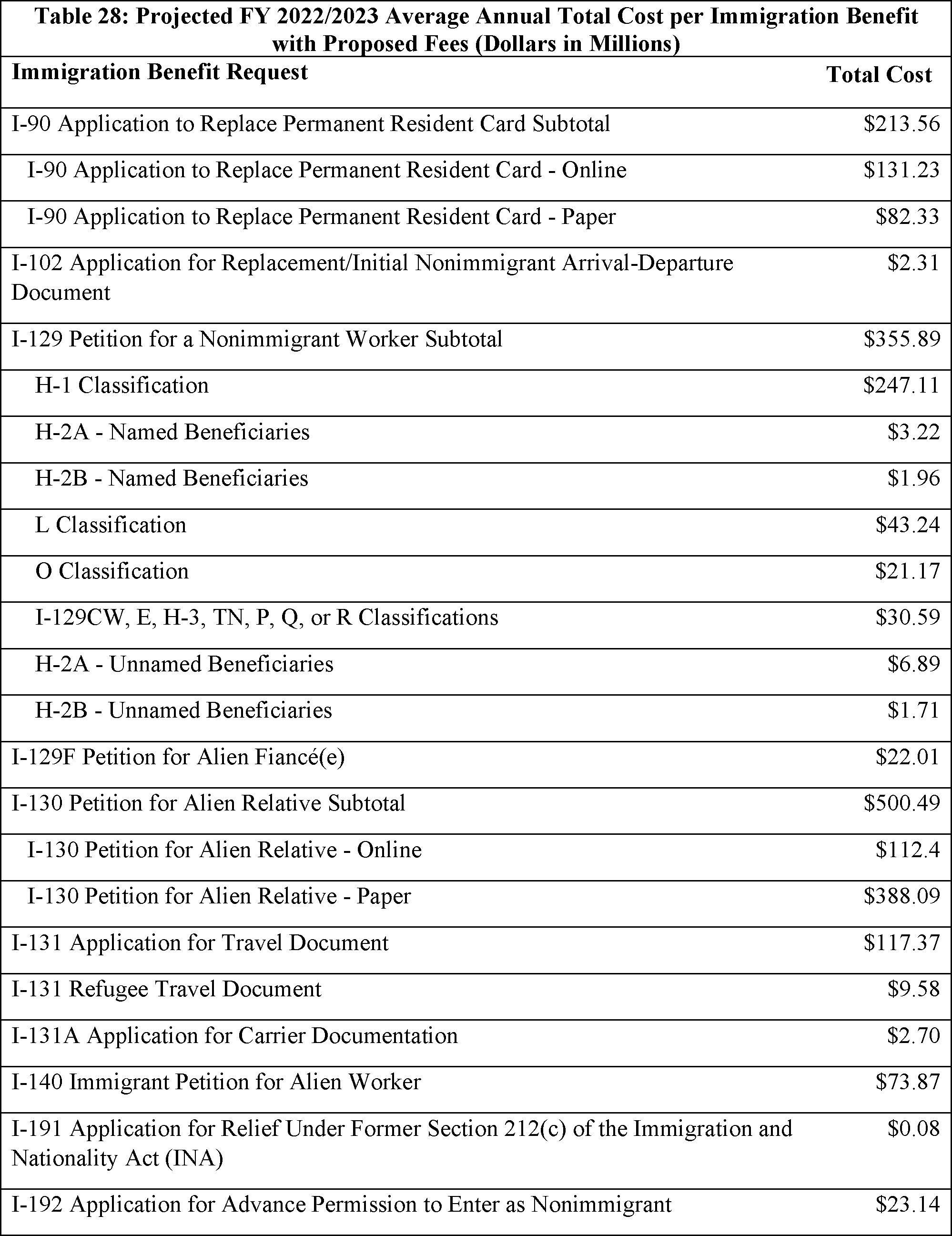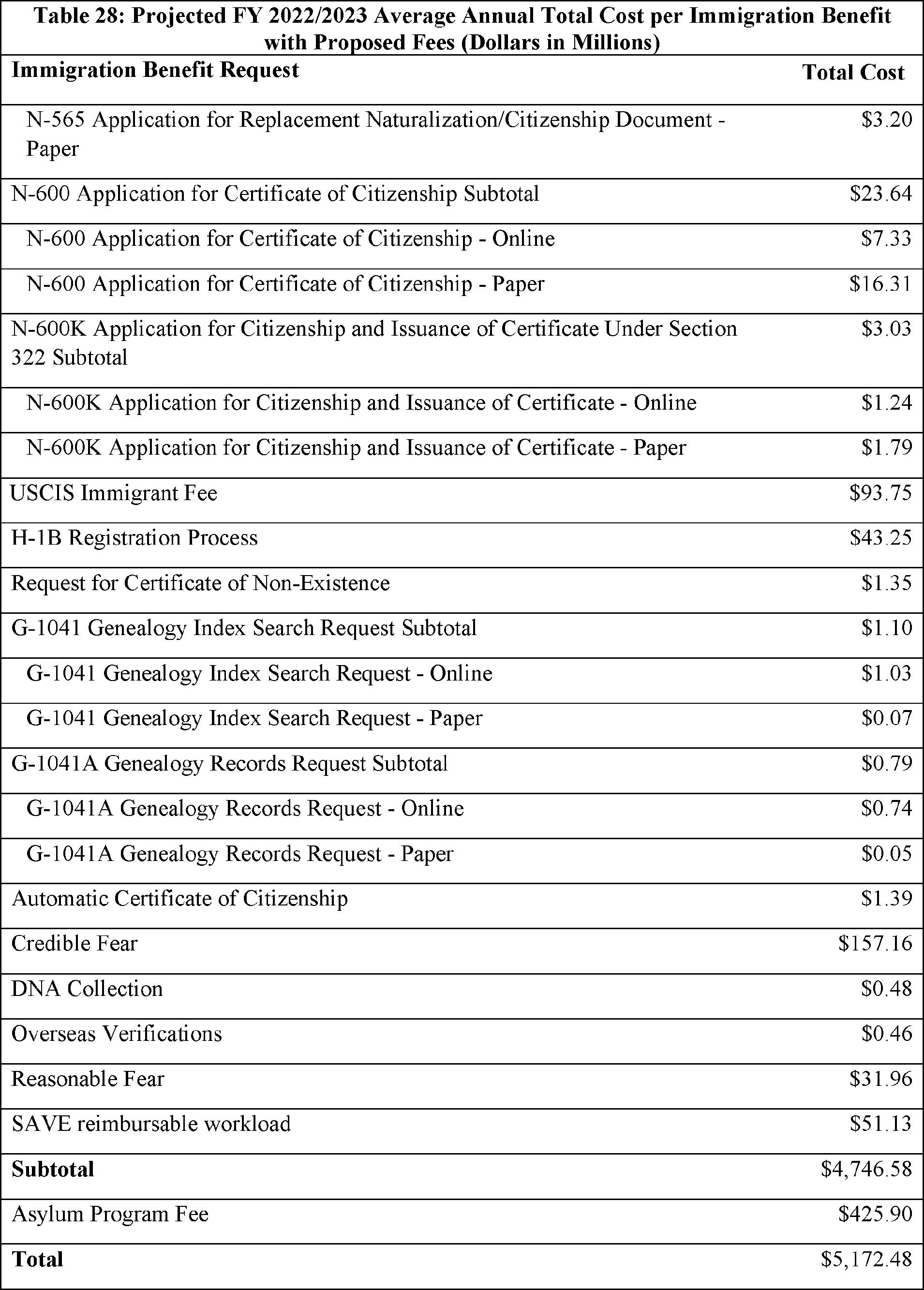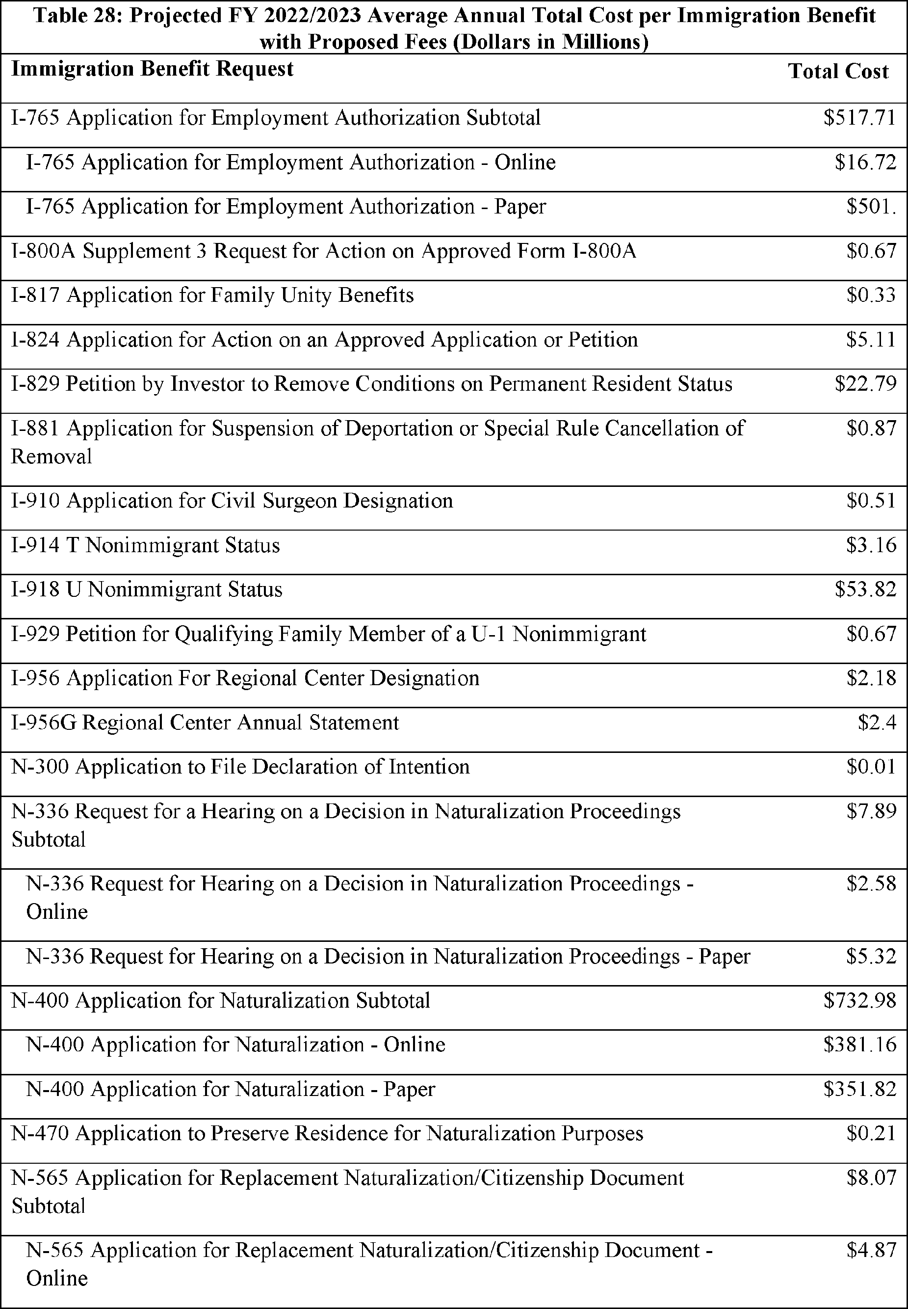 Model output from Appendix Table 4 in the FY 2022/2023 Immigration Examinations Fee Account Fee Review Supporting Documentation (supporting documentation) in the docket.