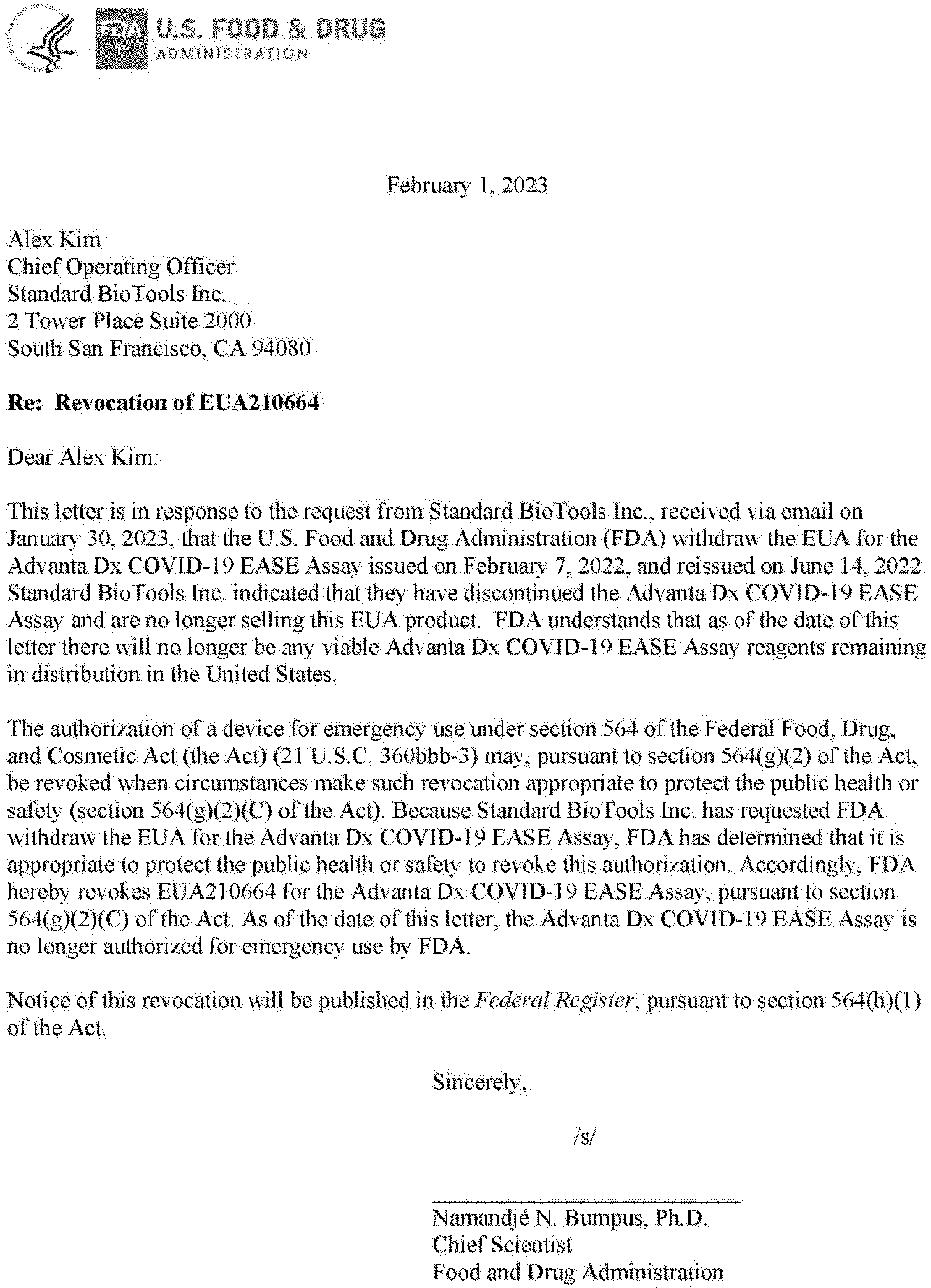 Authorization. On January 30, 2023, FDA received a request from Standard for the withdrawal of, and on February 1, 2023, FDA revoked, the Authorizations for the Advanta Dx SARS-CoV-2 RT-PCR Assay and Advanta Dx COVID-19 EASE Assay. Because Standard requested FDA withdraw the EUAs for the Advanta Dx SARS-CoV-2 RT-PCR Assay and Advanta Dx COVID-19 EASE Assay, FDA has determined that it is appropriate to protect the public health or safety to revoke these Authorizations.