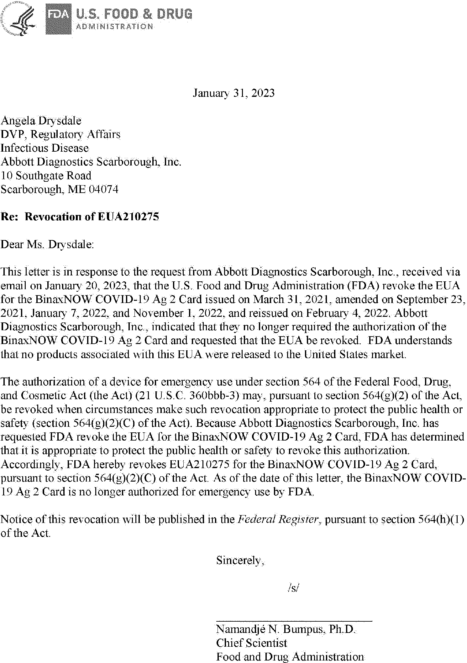 On January 20, 2023, FDA received a request from Abbott for the revocation of, and on January 31, 2023, FDA revoked, the Authorization for the BinaxNOW COVID-19 Ag 2 Card. Because Abbott requested FDA revoke the EUA for the BinaxNOW COVID-19 Ag 2 Card, FDA has determined that it is appropriate to protect the public health or safety to revoke this