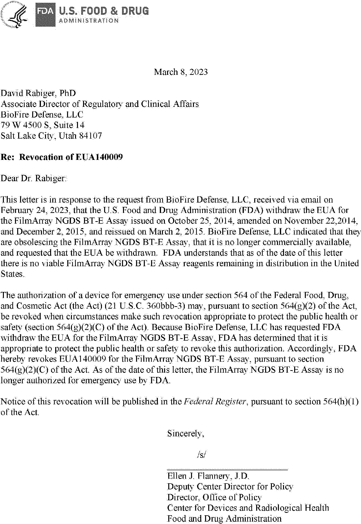 The revocation of the Authorization for the BioFire Defense, LLC's FilmArray NGDS BT-E Assay is effective as of March 8, 2023. The revocation of the Authorization for the Biocartis NV's Idylla Rapid Ebola Virus Triage Test is effective as of March 9, 2023.