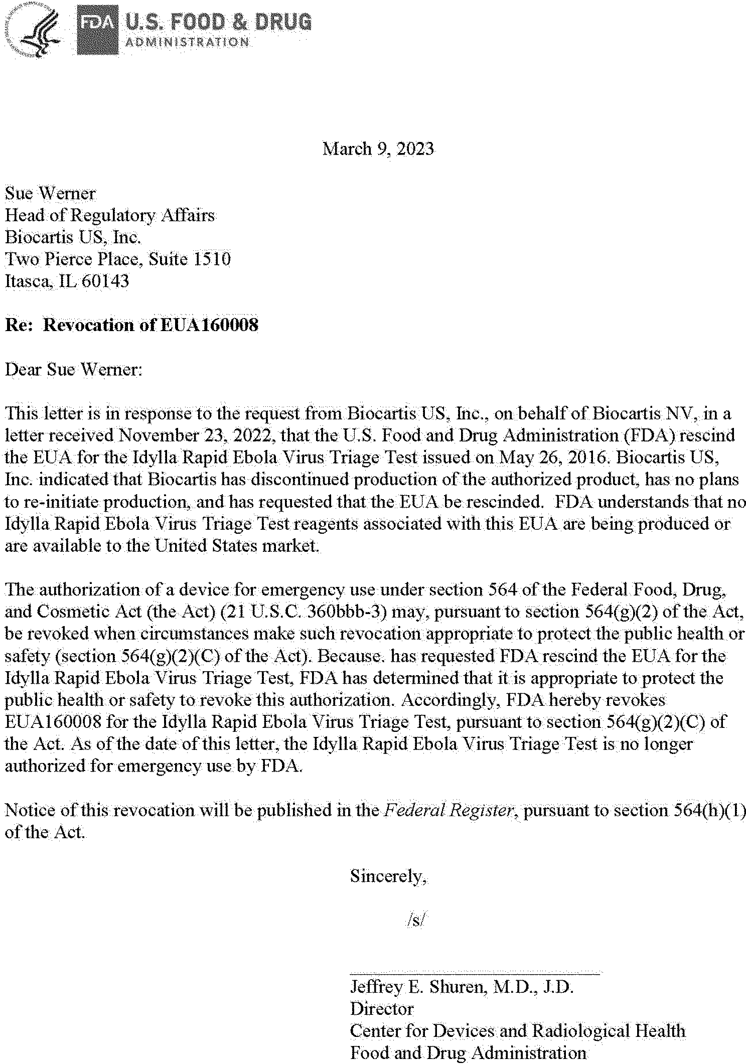 In a request received by FDA on November 23, 2022, Biocartis US, Inc., on behalf of Biocartis NV, requested rescission of, and on March 9, 2023, FDA revoked, the Authorization for the Idylla Rapid Ebola Virus Triage Test. Because Biocartis US, Inc., on behalf of Biocartis NV, notified FDA that it has discontinued the production of Idylla Rapid Ebola Virus Triage Test and requested FDA rescind the Authorization for the Idylla Rapid Ebola Virus Triage Test, FDA has determined that it is appropriate to protect the public health or safety to revoke this Authorization.