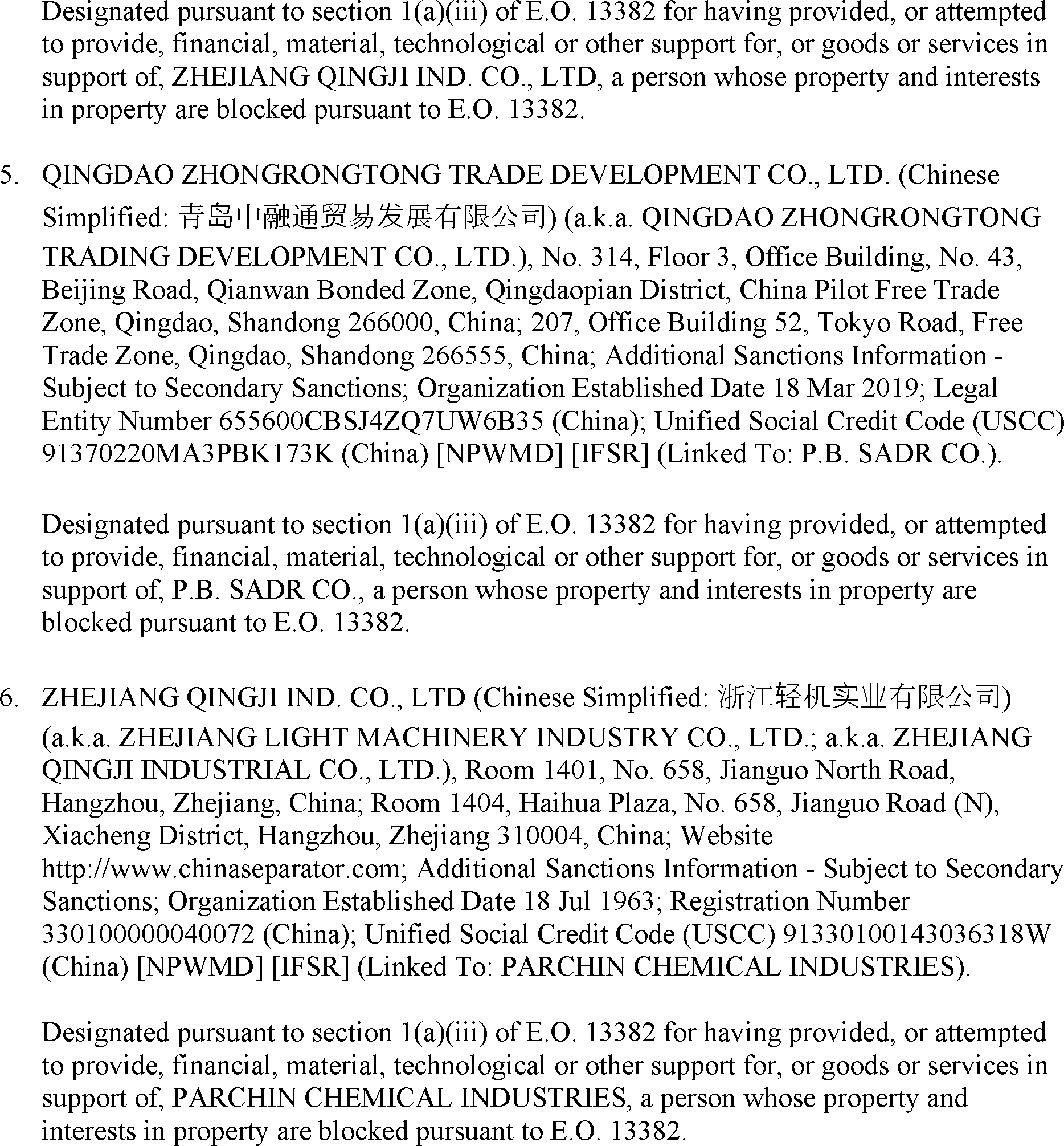 6. SHEN, Weisheng, Zhejiang, China; DOB 01 Nov 1957; POB Haimen, China; nationality China; Additional Sanctions Information—Subject to Secondary Sanctions; Gender Male; Passport G23381737 (China) issued 13 Jun 2007 expires 12 Jun 2017; National ID No. 330103195711011317 (China) (individual) [NPWMD] [IFSR] (Linked To: ZHEJIANG QINGJI IND. CO., LTD).