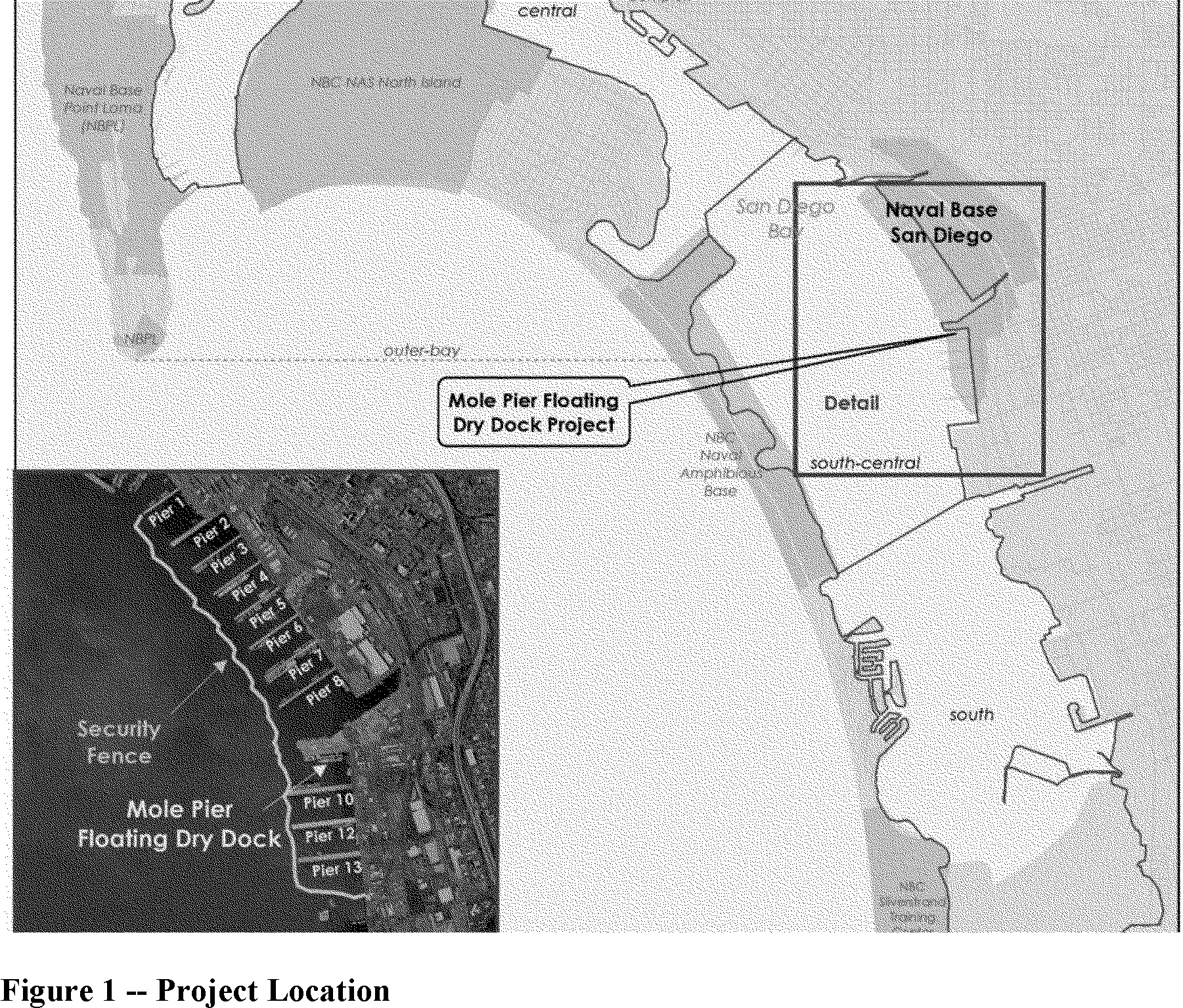 The proposed FDD installation and associated dredging activities would occur within San Diego Bay at the south berth of the Mole Pier, which is located approximately 1.6 kilometers (km; 1 mile) south of the main entrance gate to Navy Base San Diego (NBSD), immediately south of Pier 8 and the Paleta Creek Channel, and north of Pier 10.