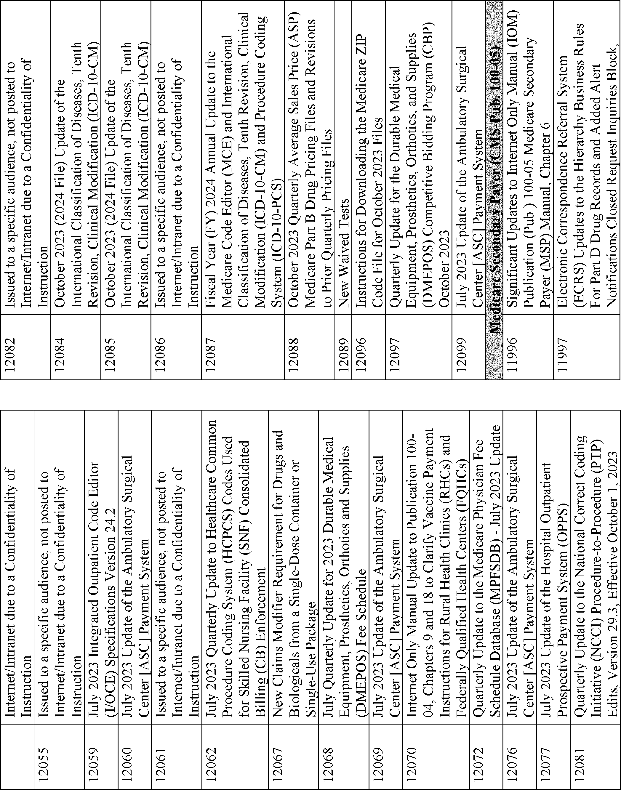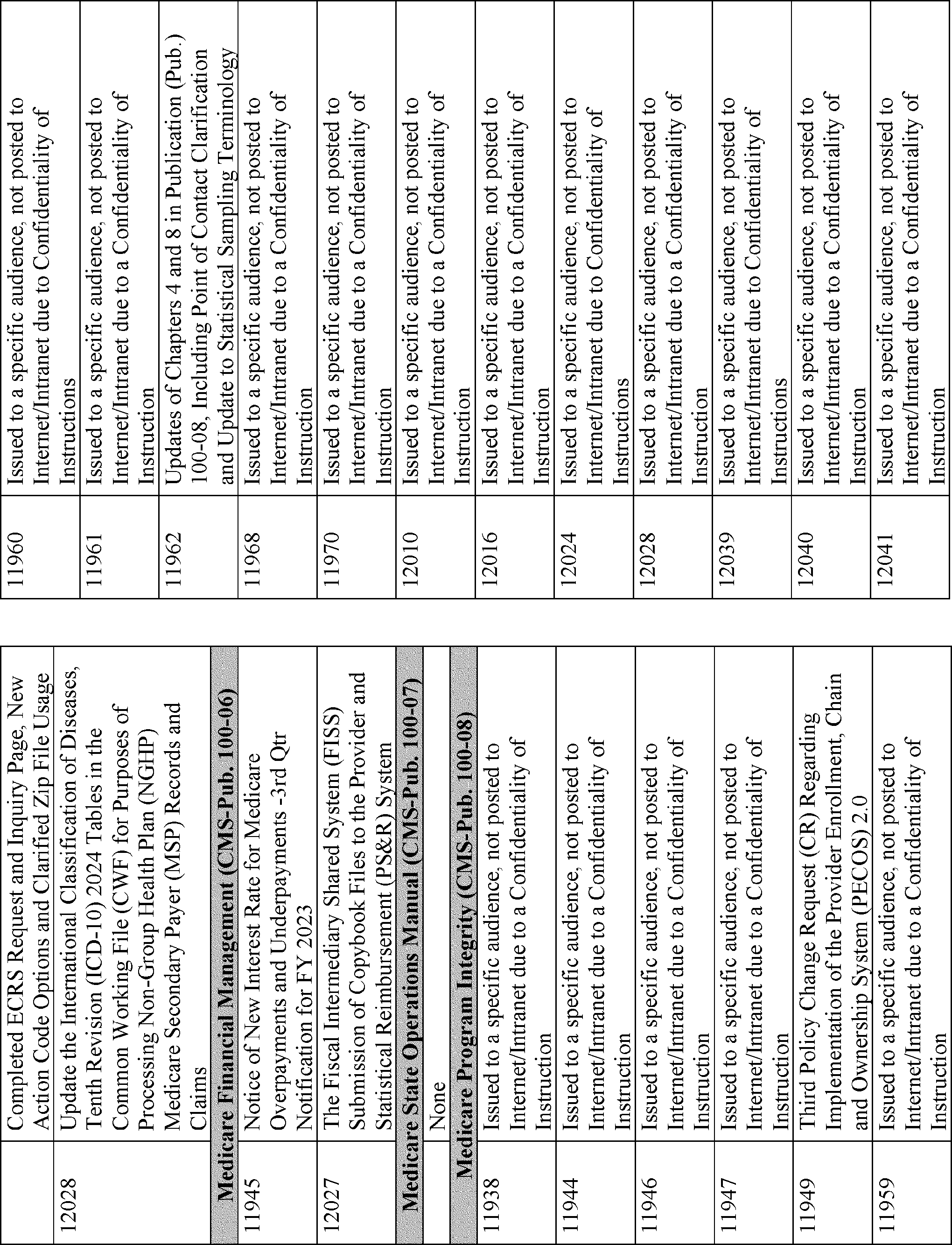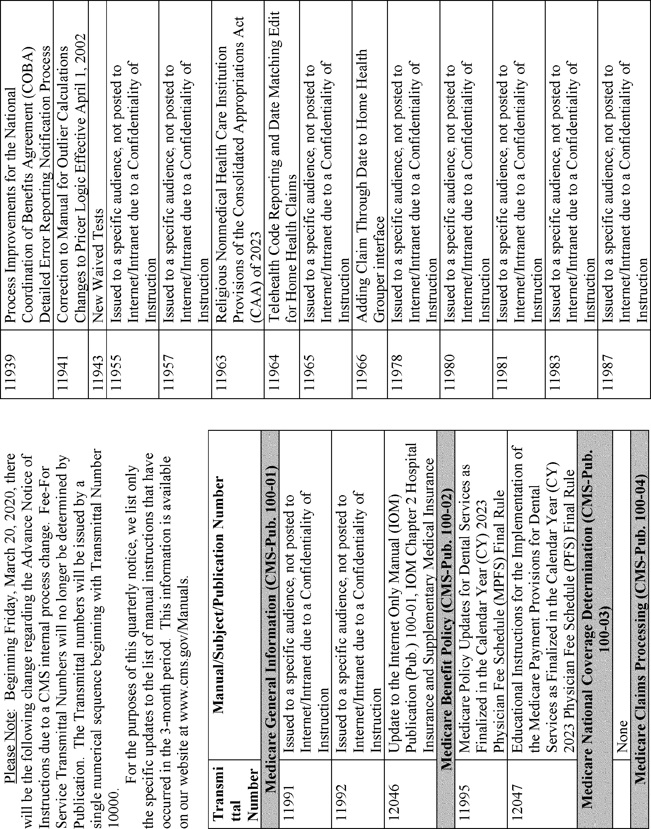 This quarterly notice lists CMS manual instructions, substantive and interpretive regulations, and other Federal Register notices that were published in the 3-month period, relating to the Medicare and Medicaid programs and other programs administered by CMS.