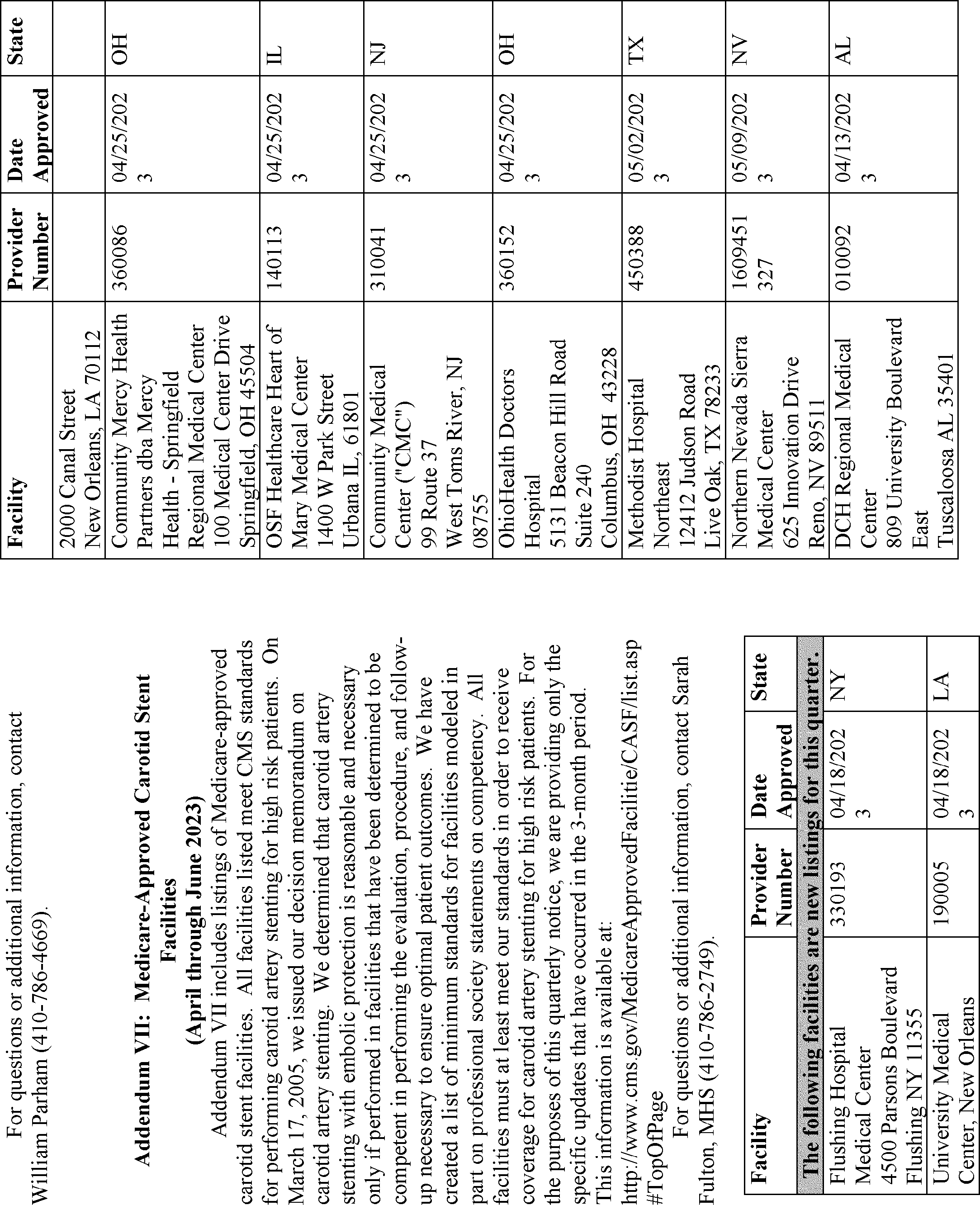 | VII Medicare-Approved Carotid Stent Facilities | Sarah Fulton, MHS | (410) 786-2749 |