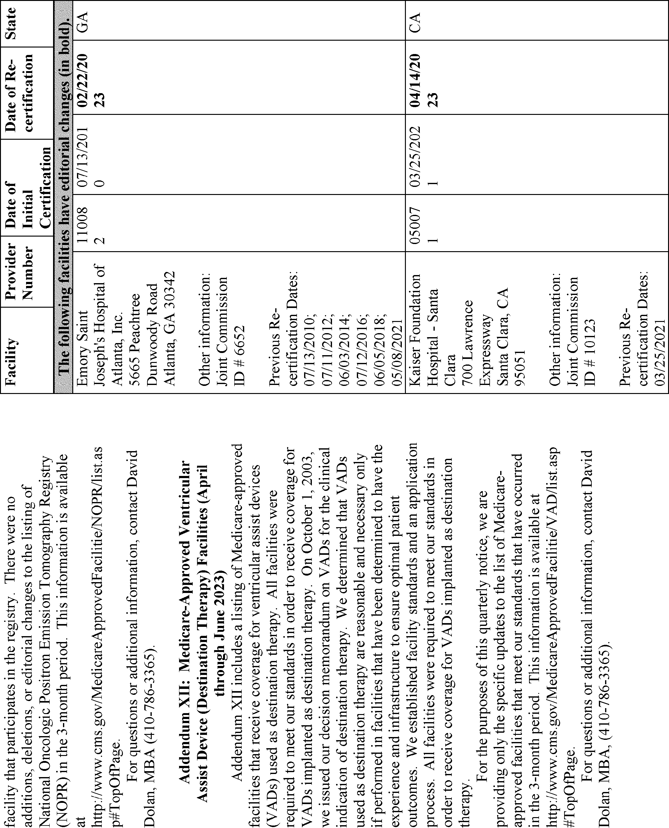 | XII Medicare-Approved Ventricular Assist Device (Destination Therapy) Facilities | David Dolan, MBA | (410) 786-3365 |