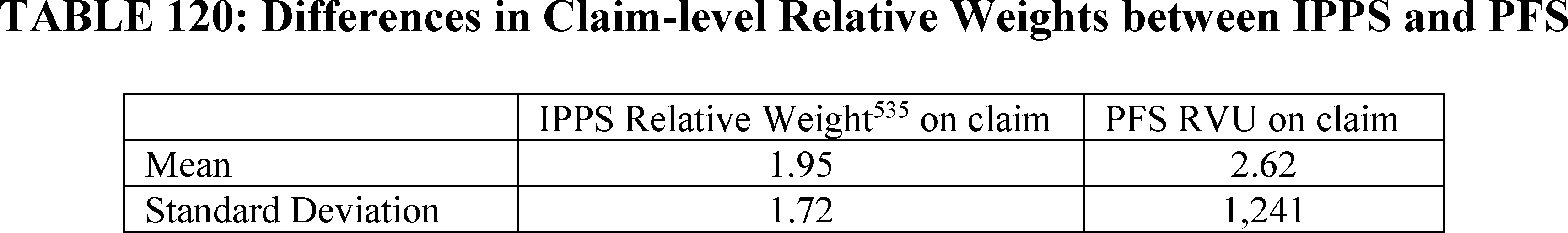 The IPPS relative weights are not fully comparable to PFS RVUs because IPPS payments may include outliers. Even considering outliers, however, the standard deviation on IPPS payments is only slightly higher relative to the mean($17,104+/−$21,825).