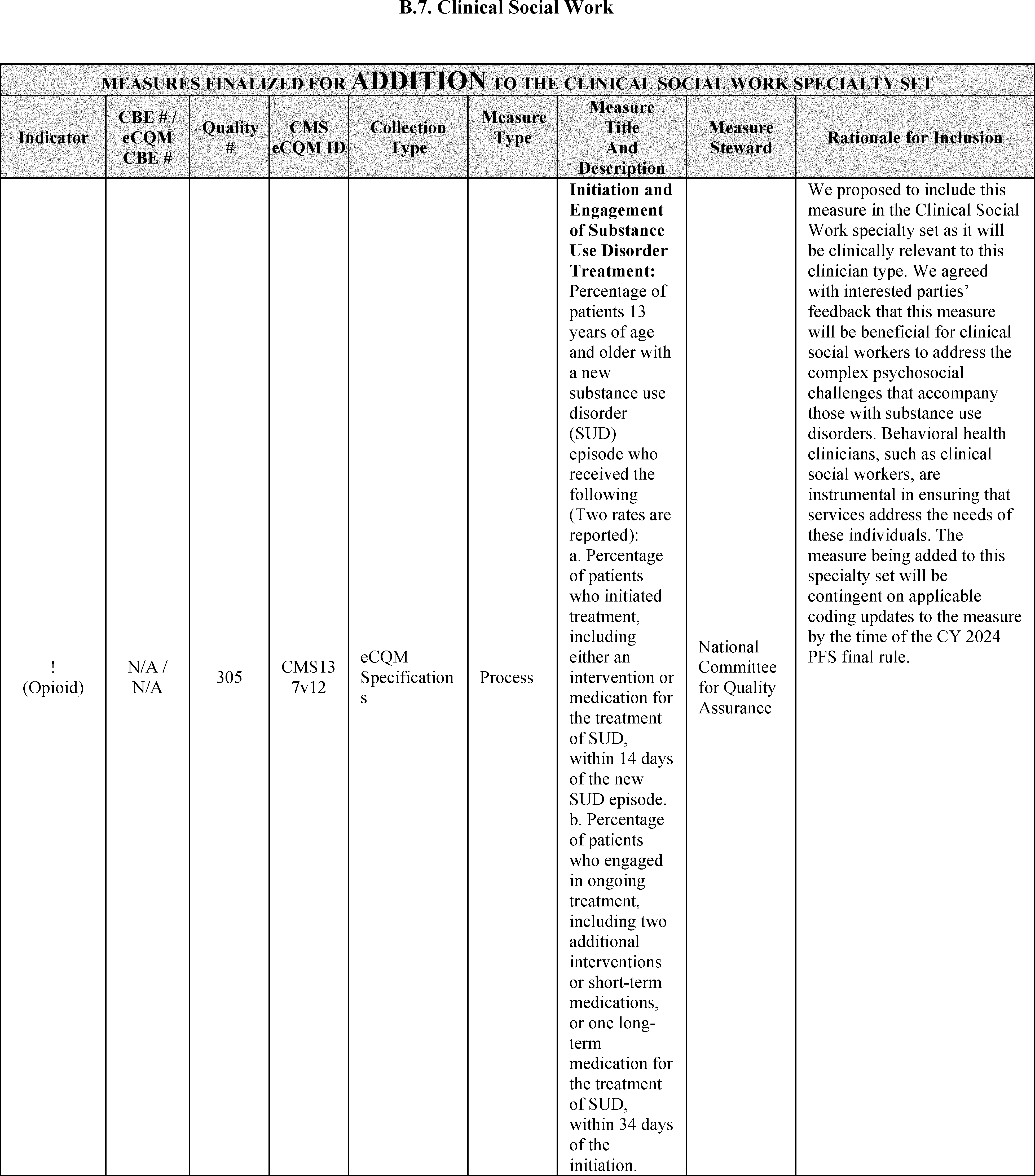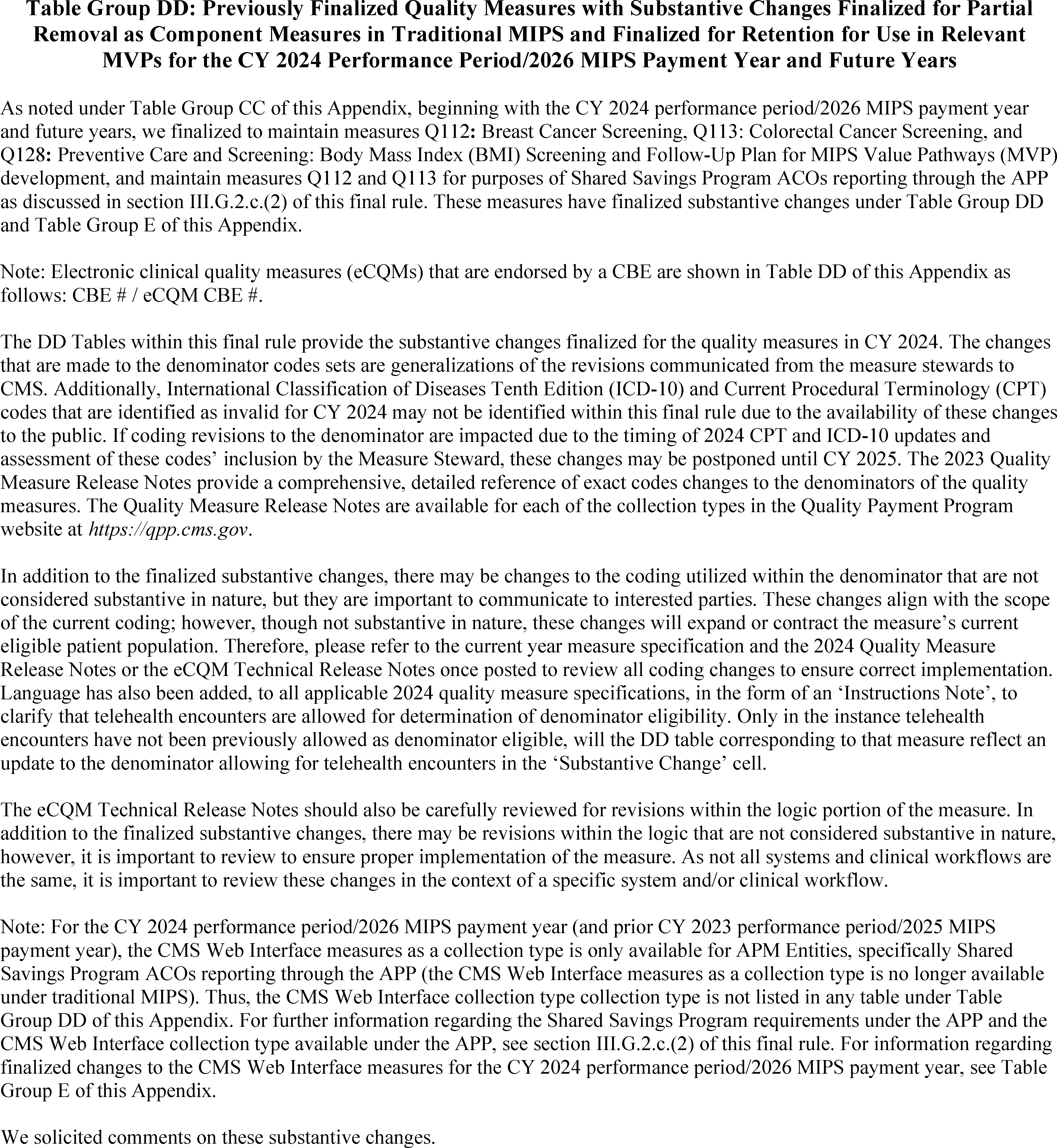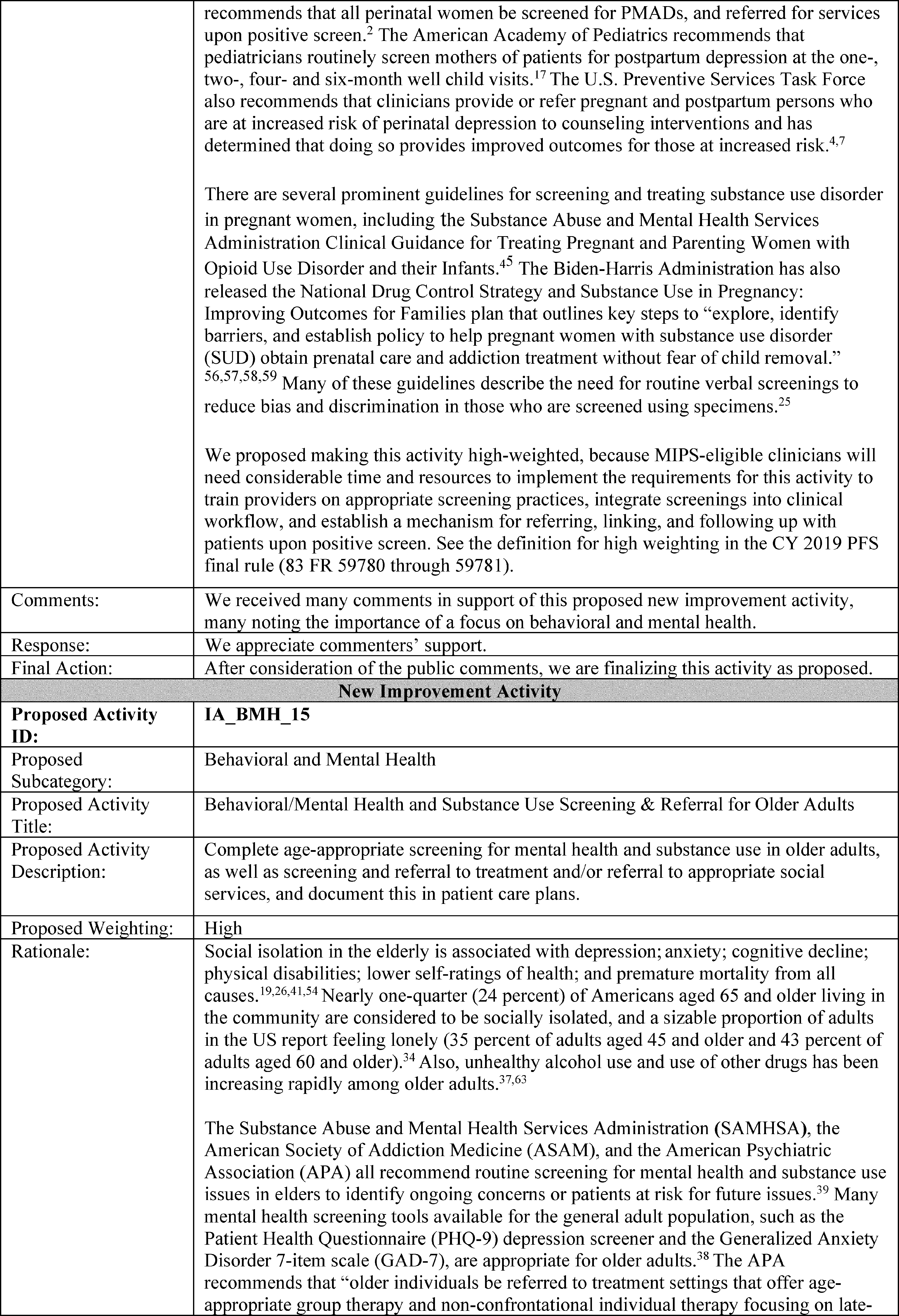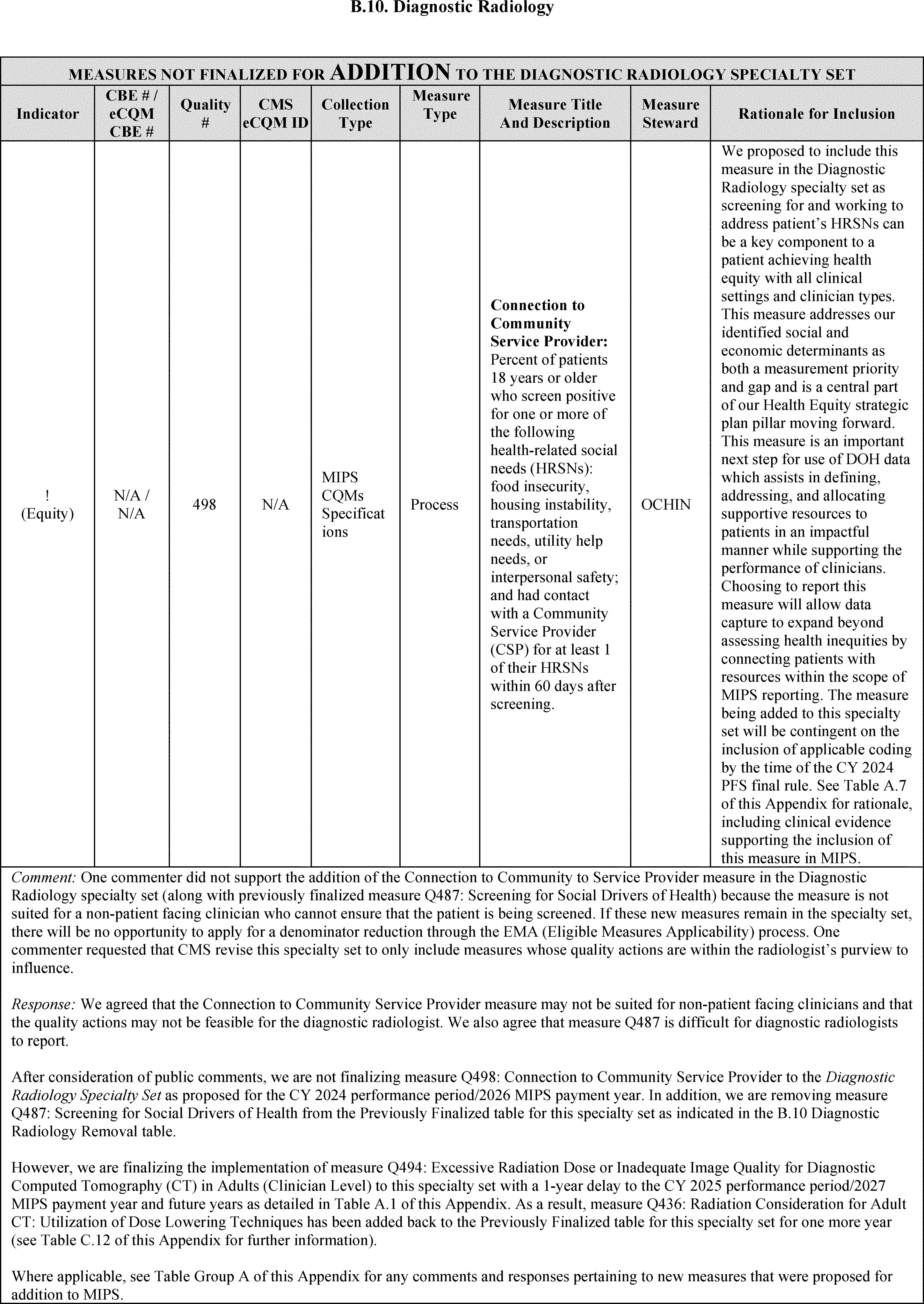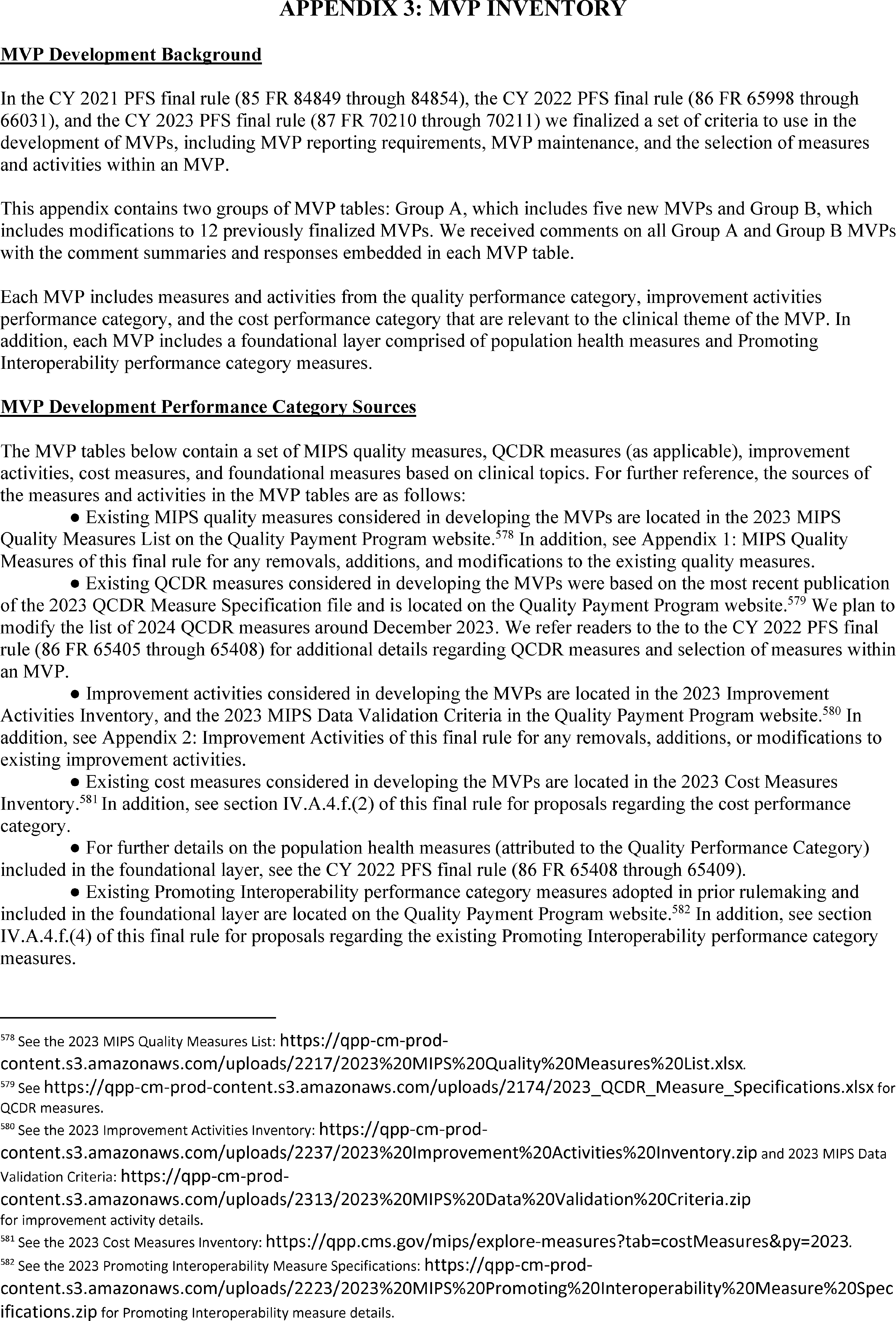 This major final rule addresses: changes to the physician fee schedule (PFS); other changes to Medicare Part B payment policies to ensure that payment systems are updated to reflect changes in medical practice, relative value of services, and changes in the statute; payment for dental services inextricably linked to specific covered medical services; Medicare Shared Savings Program requirements; updates to the Quality Payment Program; Medicare coverage of opioid use disorder services furnished by opioid treatment programs; updates to certain Medicare and Medicaid provider and supplier enrollment policies, electronic prescribing for controlled substances for a covered Part D drug under a prescription drug plan or an MA-PD plan under the Substance Use-Disorder Prevention that Promotes Opioid Recovery and Treatment for Patients and Communities Act (SUPPORT Act); updates to the Ambulance Fee Schedule regulations and the Medicare Ground Ambulance Data Collection System; codification of the Inflation Reduction Act and Consolidated Appropriations Act, 2023 provisions; expansion of the diabetes screening and diabetes definitions; pulmonary rehabilitation, cardiac rehabilitation and intensive cardiac rehabilitation expansion of supervising practitioners; appropriate use criteria for advanced diagnostic imaging; early release of Medicare Advantage risk adjustment data; a social determinants of health risk assessment in the annual wellness visit and Basic Health Program.