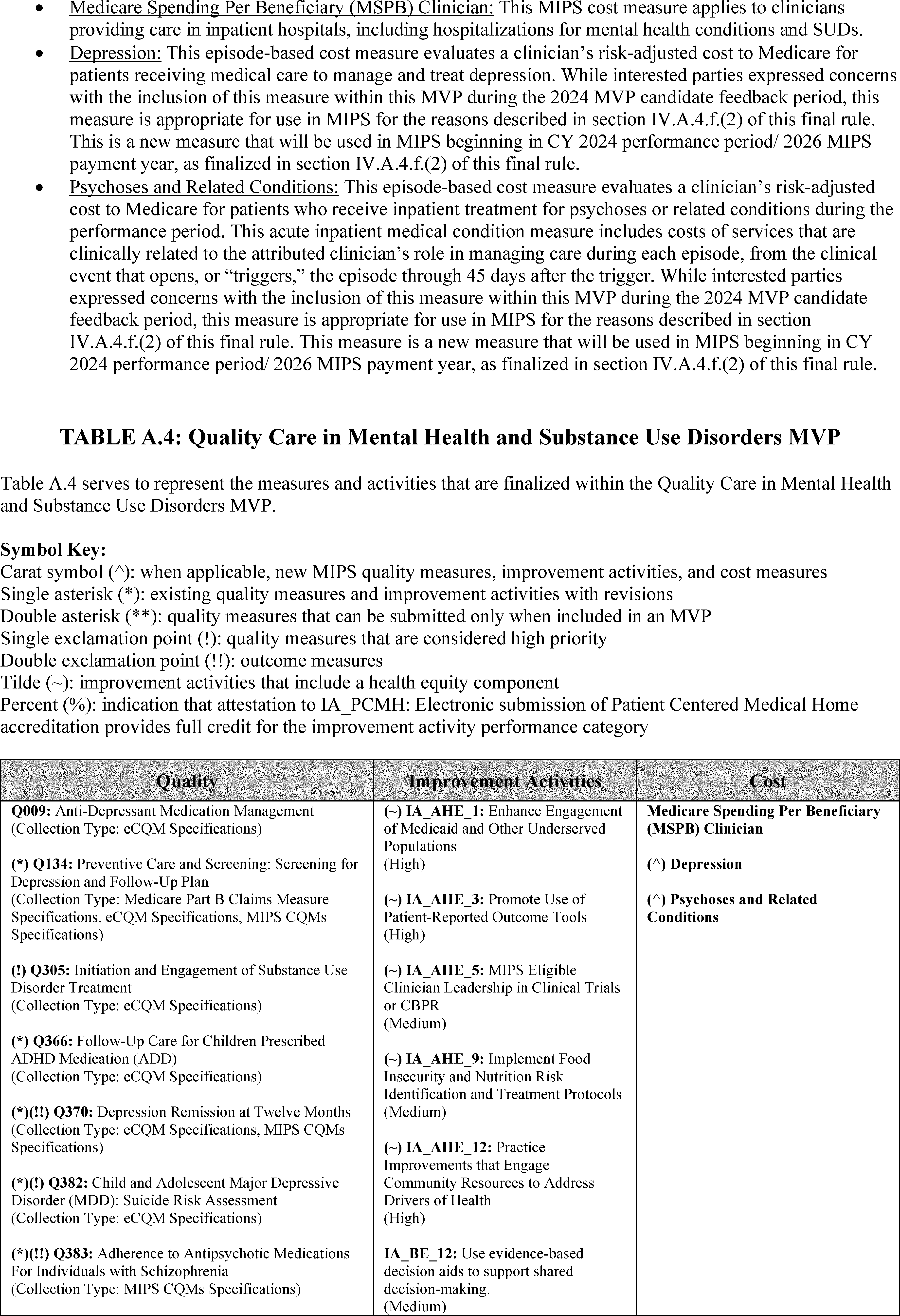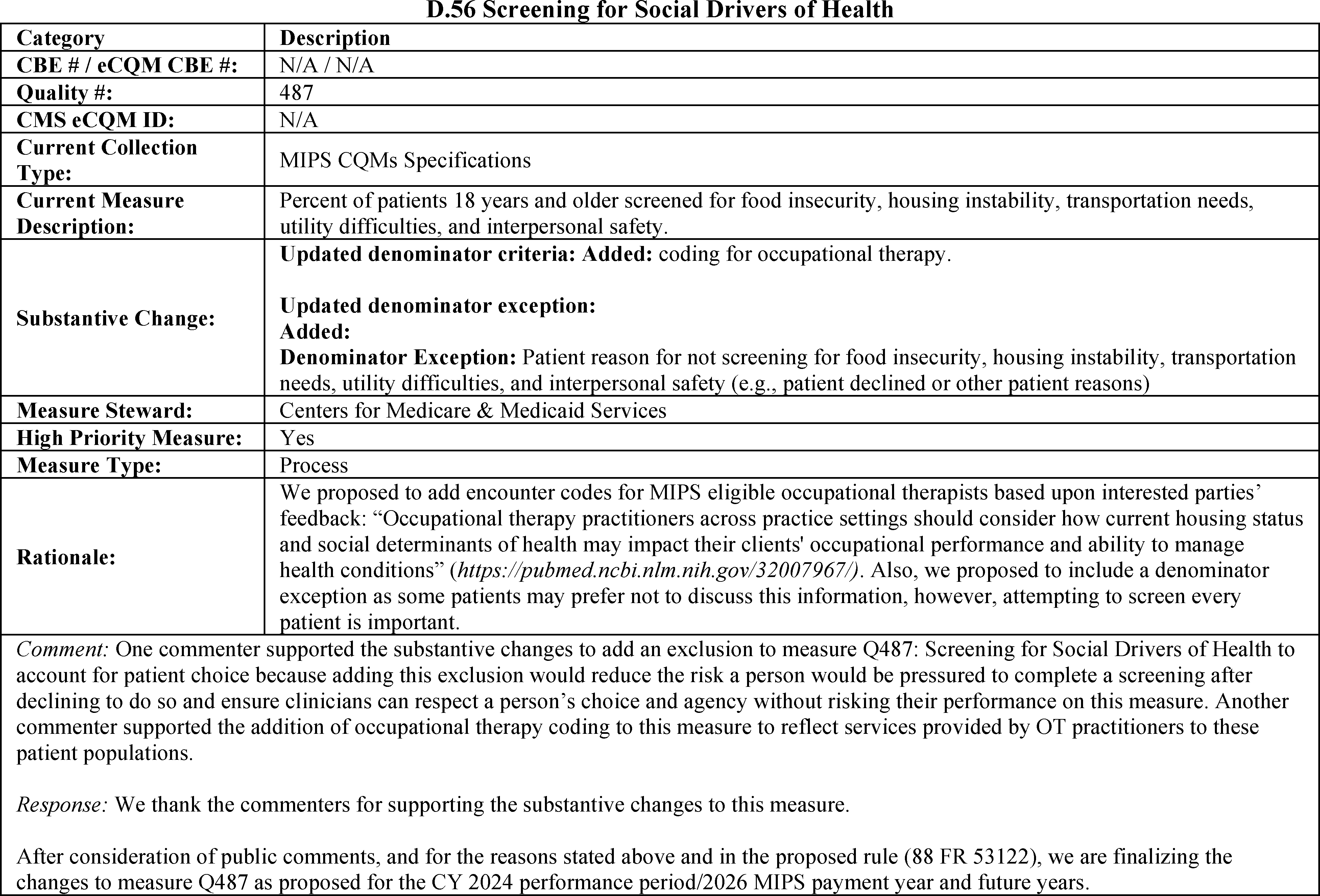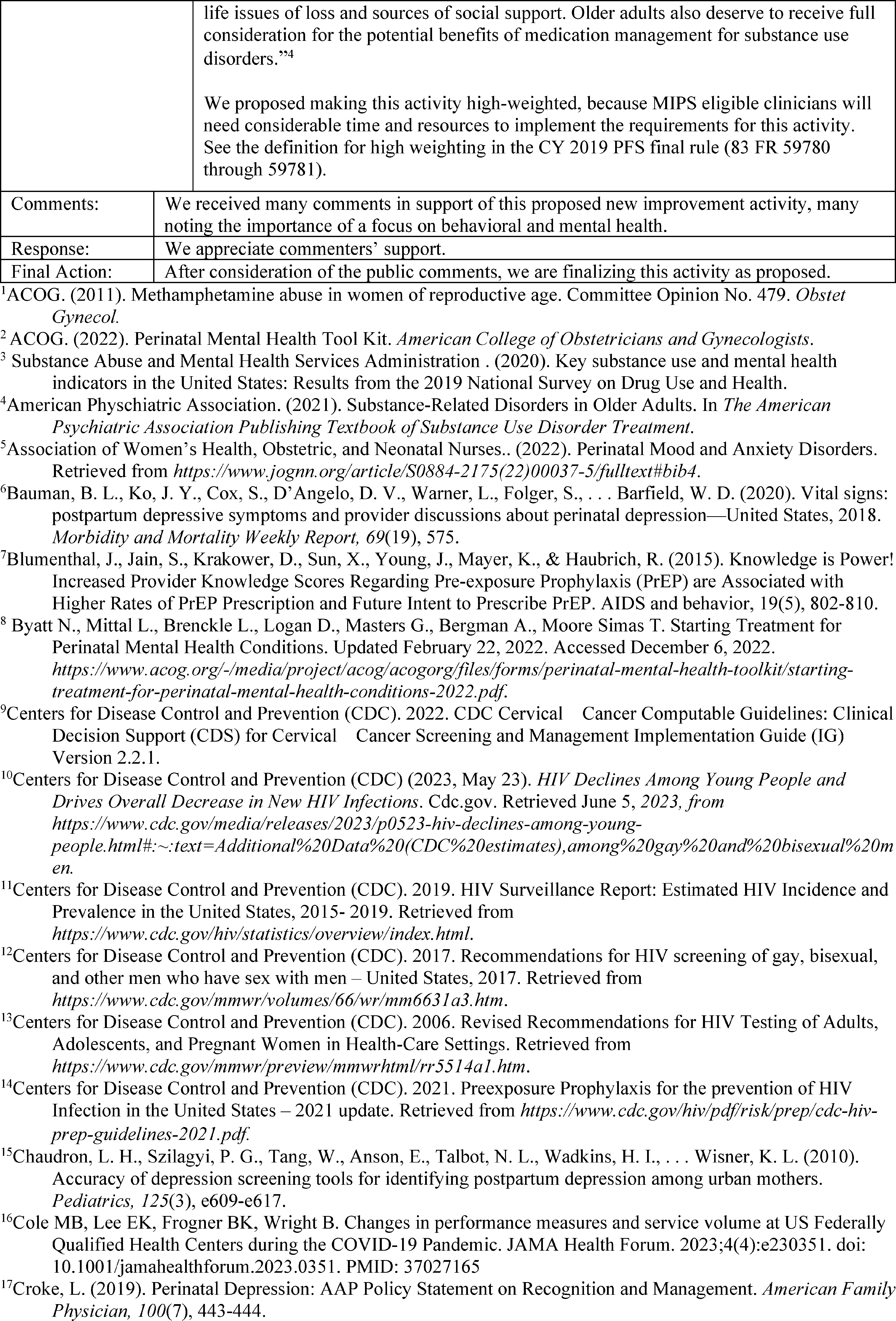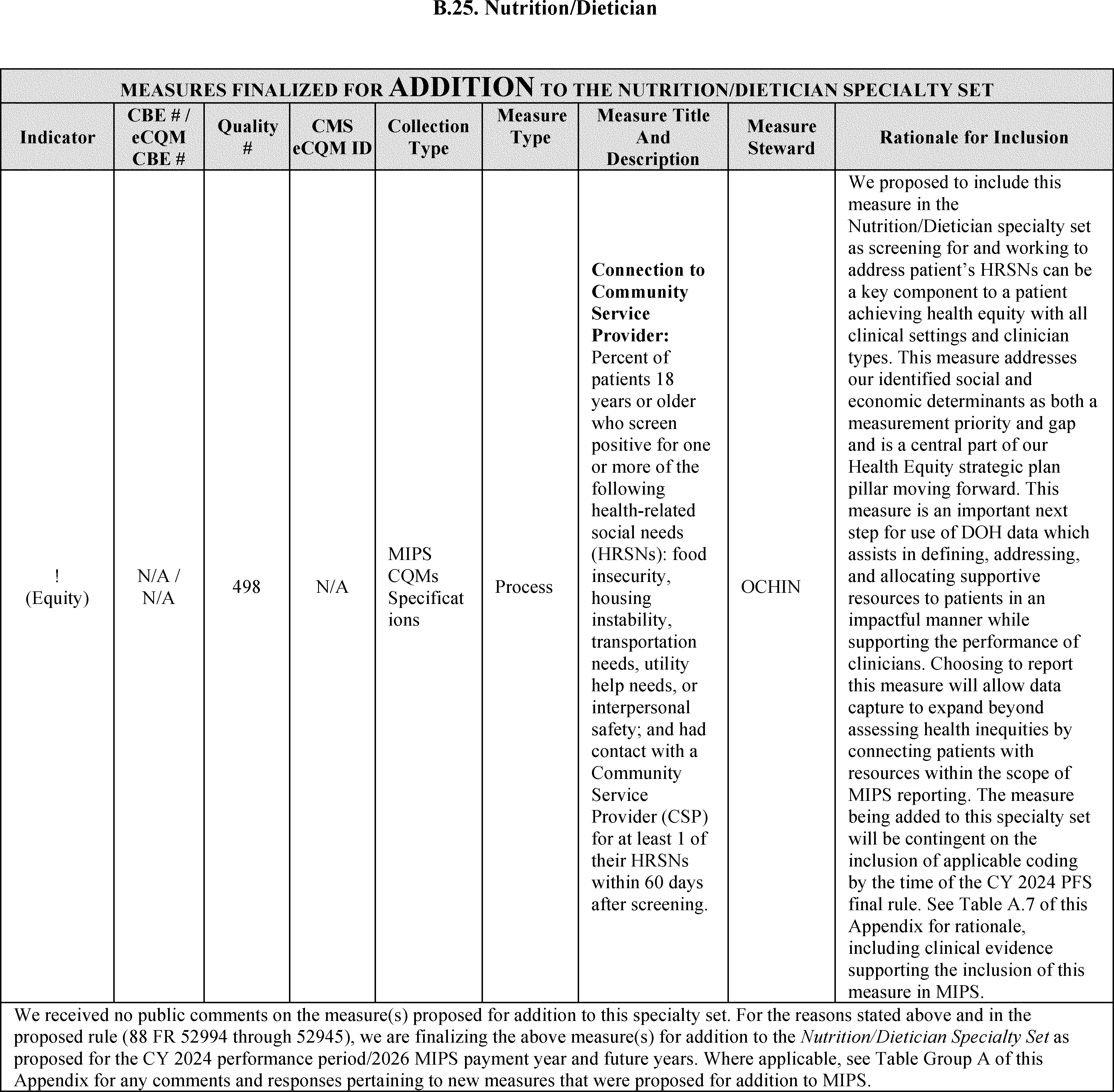 This major final rule addresses: changes to the physician fee schedule (PFS); other changes to Medicare Part B payment policies to ensure that payment systems are updated to reflect changes in medical practice, relative value of services, and changes in the statute; payment for dental services inextricably linked to specific covered medical services; Medicare Shared Savings Program requirements; updates to the Quality Payment Program; Medicare coverage of opioid use disorder services furnished by opioid treatment programs; updates to certain Medicare and Medicaid provider and supplier enrollment policies, electronic prescribing for controlled substances for a covered Part D drug under a prescription drug plan or an MA-PD plan under the Substance Use-Disorder Prevention that Promotes Opioid Recovery and Treatment for Patients and Communities Act (SUPPORT Act); updates to the Ambulance Fee Schedule regulations and the Medicare Ground Ambulance Data Collection System; codification of the Inflation Reduction Act and Consolidated Appropriations Act, 2023 provisions; expansion of the diabetes screening and diabetes definitions; pulmonary rehabilitation, cardiac rehabilitation and intensive cardiac rehabilitation expansion of supervising practitioners; appropriate use criteria for advanced diagnostic imaging; early release of Medicare Advantage risk adjustment data; a social determinants of health risk assessment in the annual wellness visit and Basic Health Program.