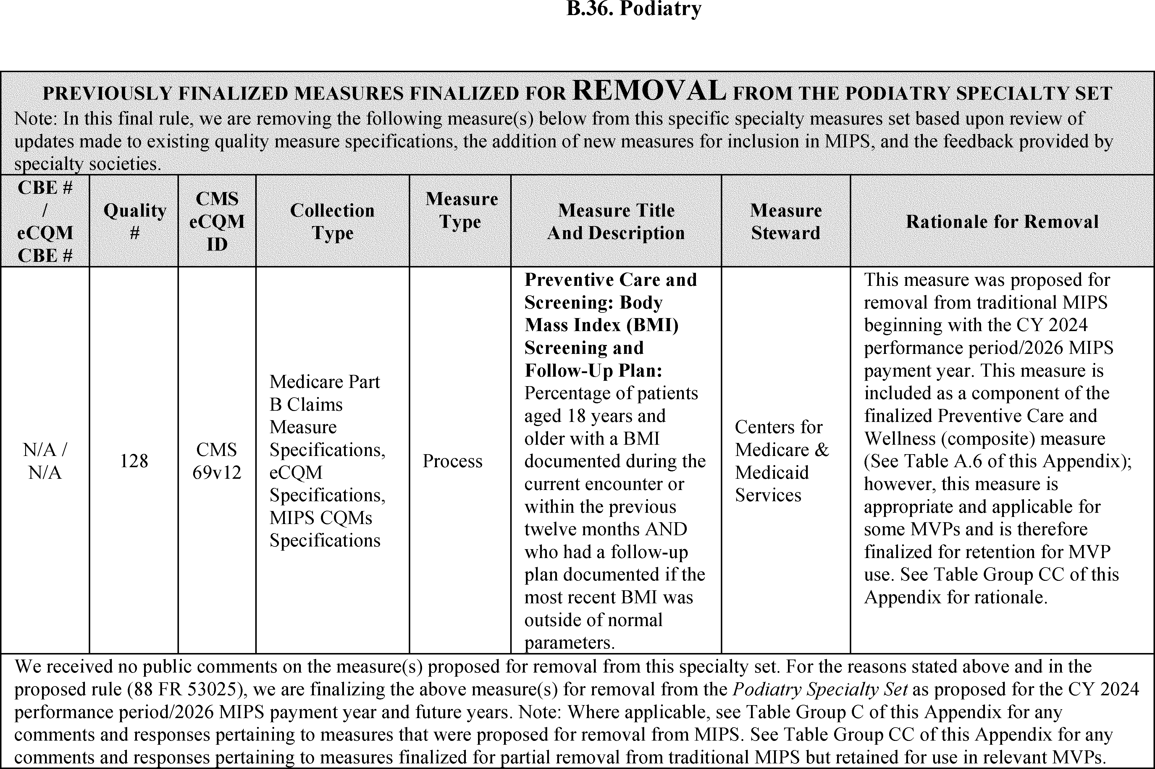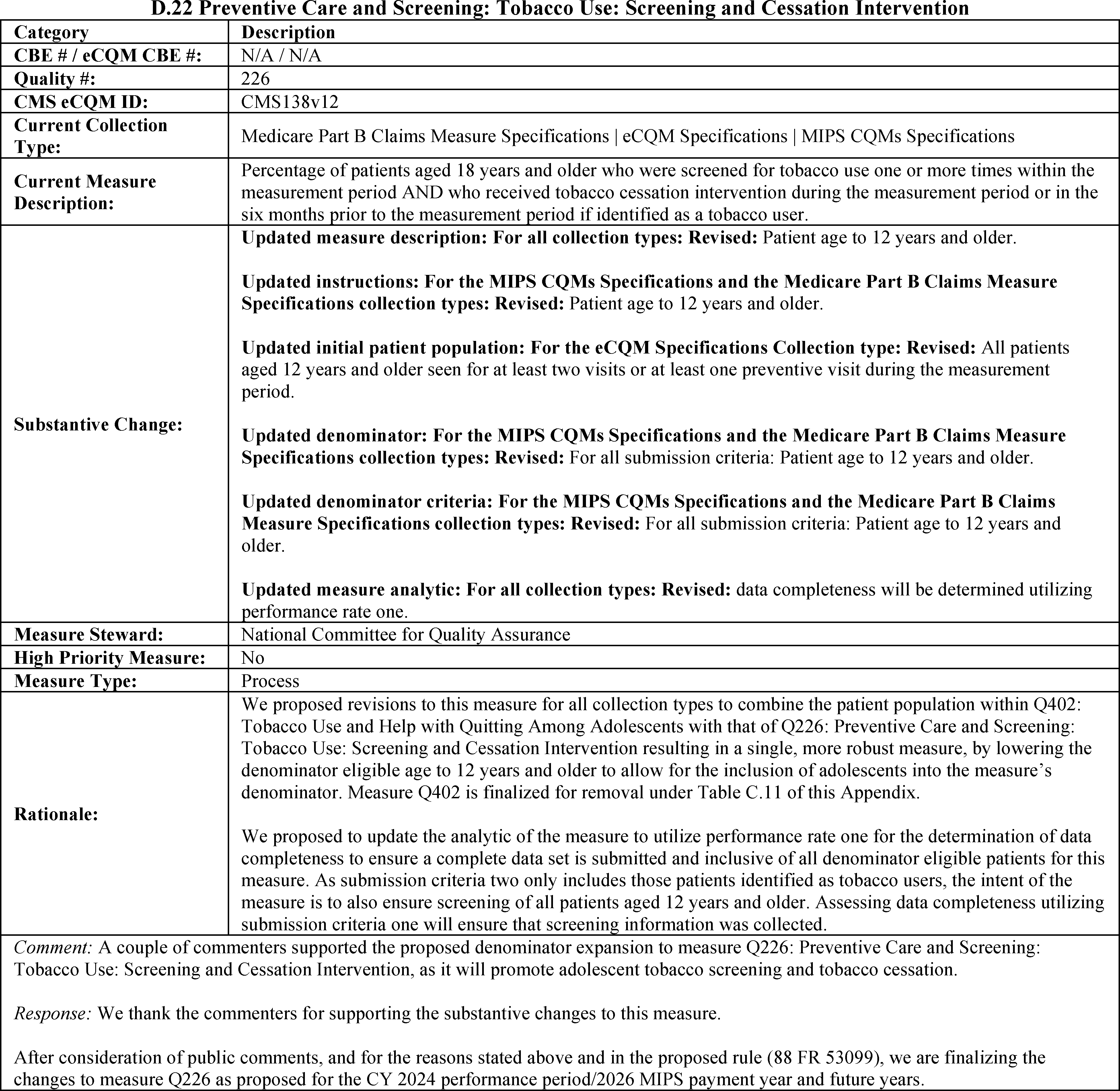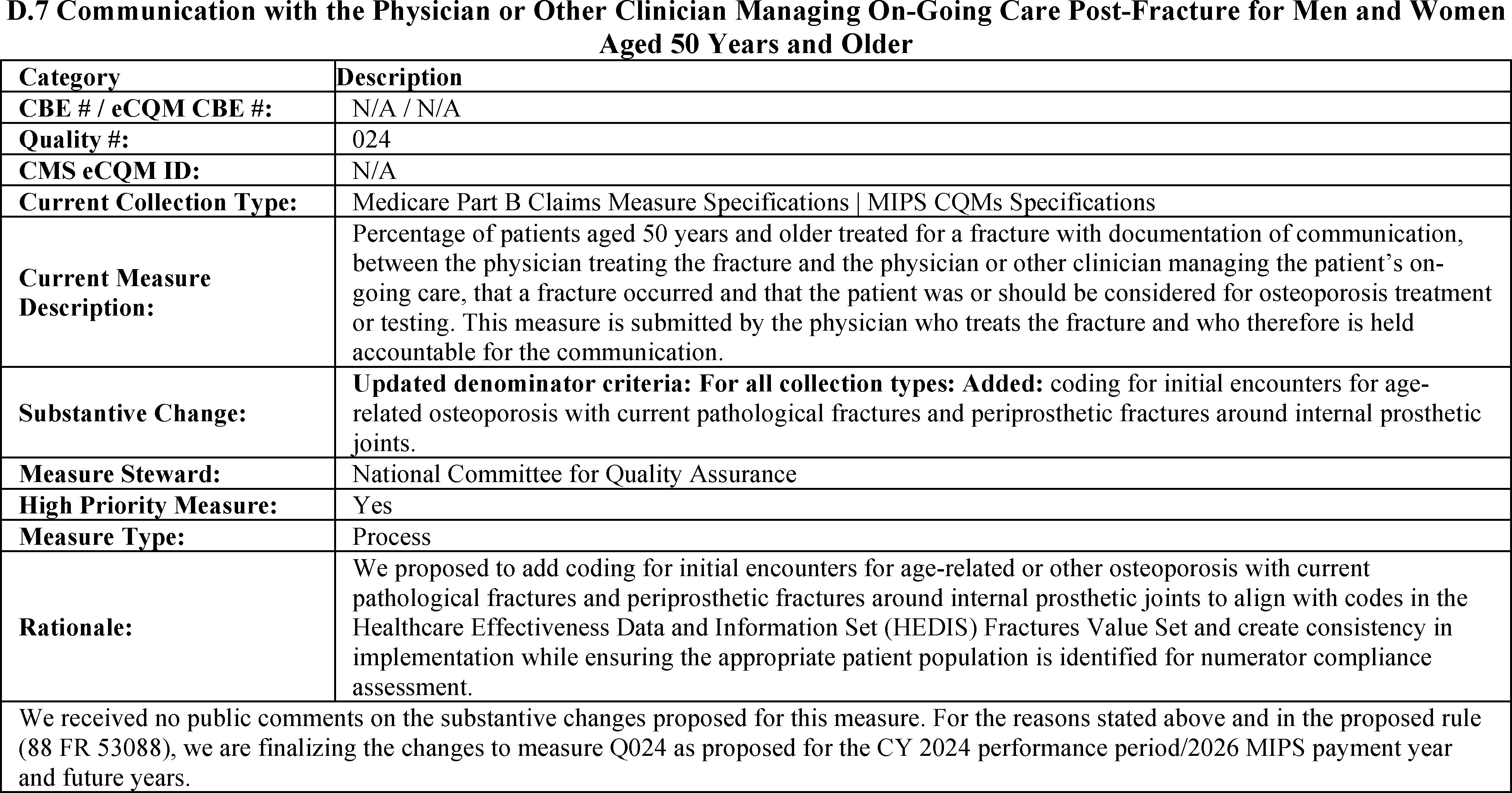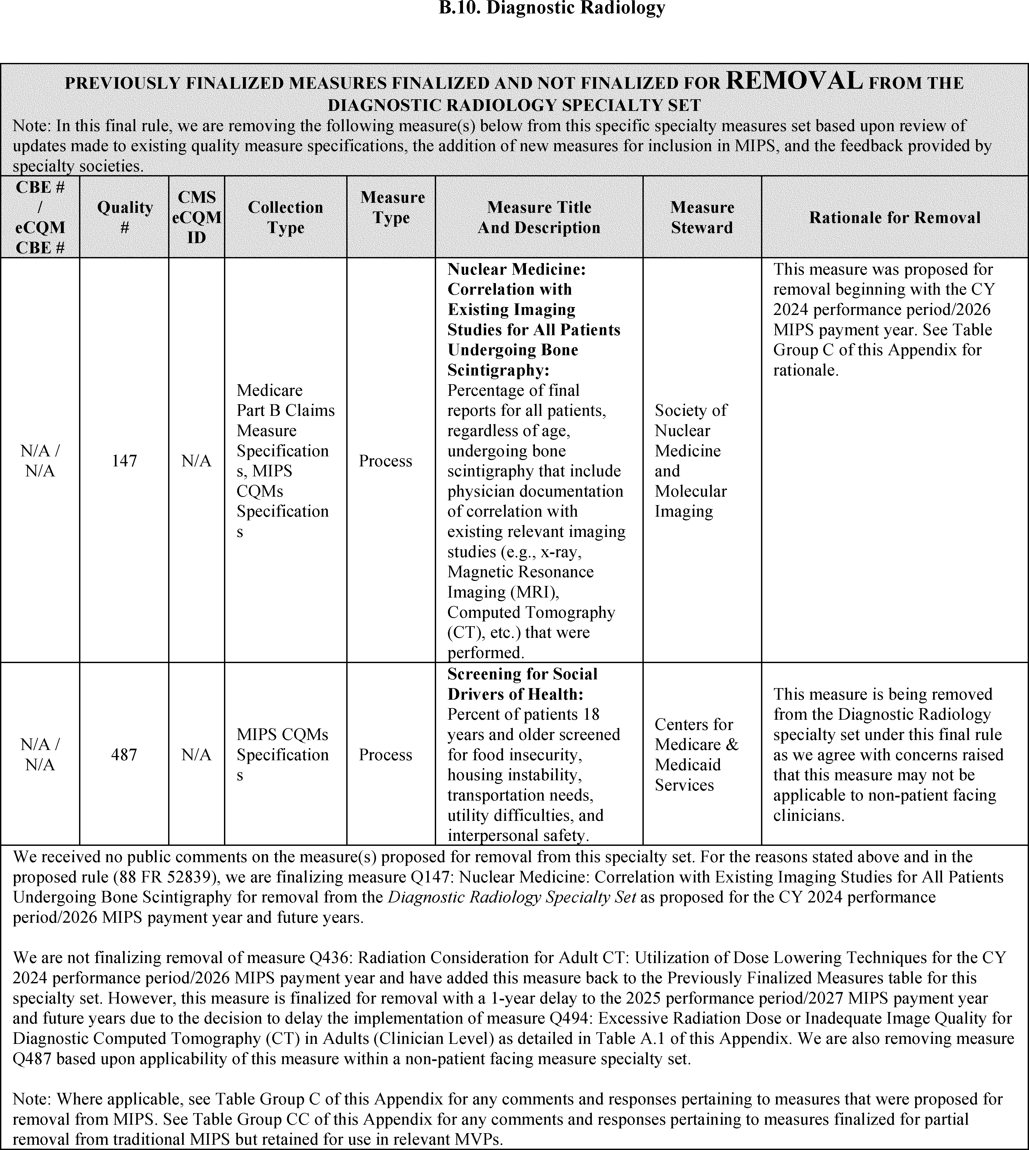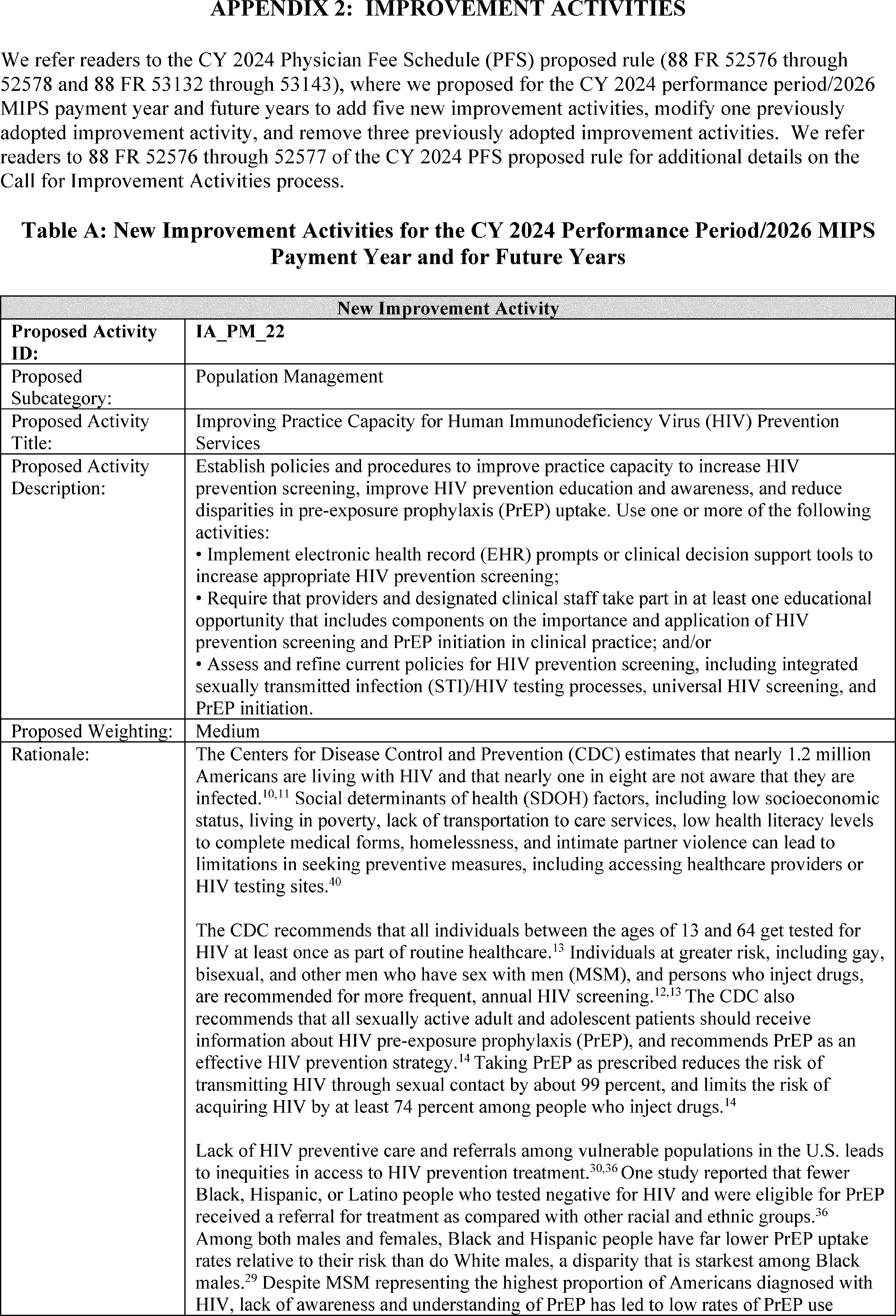 This major final rule addresses: changes to the physician fee schedule (PFS); other changes to Medicare Part B payment policies to ensure that payment systems are updated to reflect changes in medical practice, relative value of services, and changes in the statute; payment for dental services inextricably linked to specific covered medical services; Medicare Shared Savings Program requirements; updates to the Quality Payment Program; Medicare coverage of opioid use disorder services furnished by opioid treatment programs; updates to certain Medicare and Medicaid provider and supplier enrollment policies, electronic prescribing for controlled substances for a covered Part D drug under a prescription drug plan or an MA-PD plan under the Substance Use-Disorder Prevention that Promotes Opioid Recovery and Treatment for Patients and Communities Act (SUPPORT Act); updates to the Ambulance Fee Schedule regulations and the Medicare Ground Ambulance Data Collection System; codification of the Inflation Reduction Act and Consolidated Appropriations Act, 2023 provisions; expansion of the diabetes screening and diabetes definitions; pulmonary rehabilitation, cardiac rehabilitation and intensive cardiac rehabilitation expansion of supervising practitioners; appropriate use criteria for advanced diagnostic imaging; early release of Medicare Advantage risk adjustment data; a social determinants of health risk assessment in the annual wellness visit and Basic Health Program.