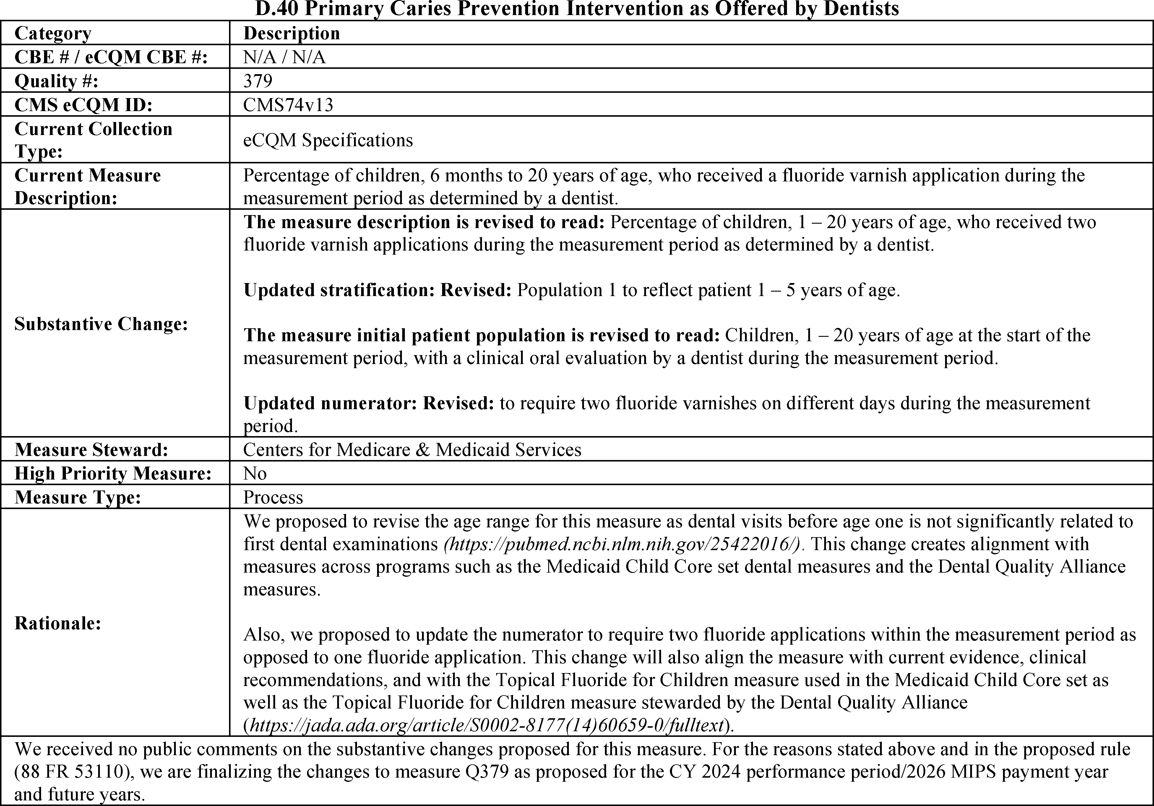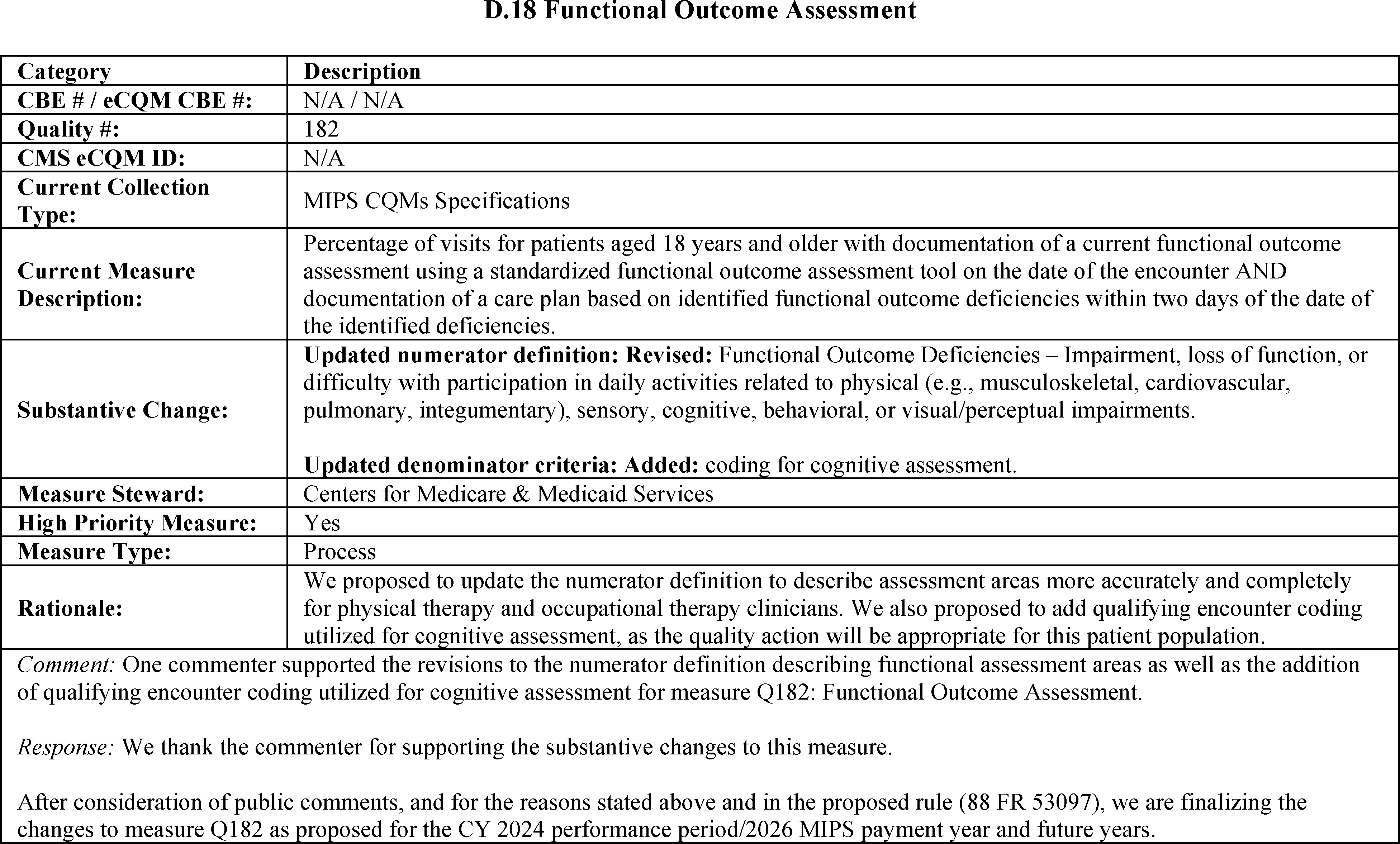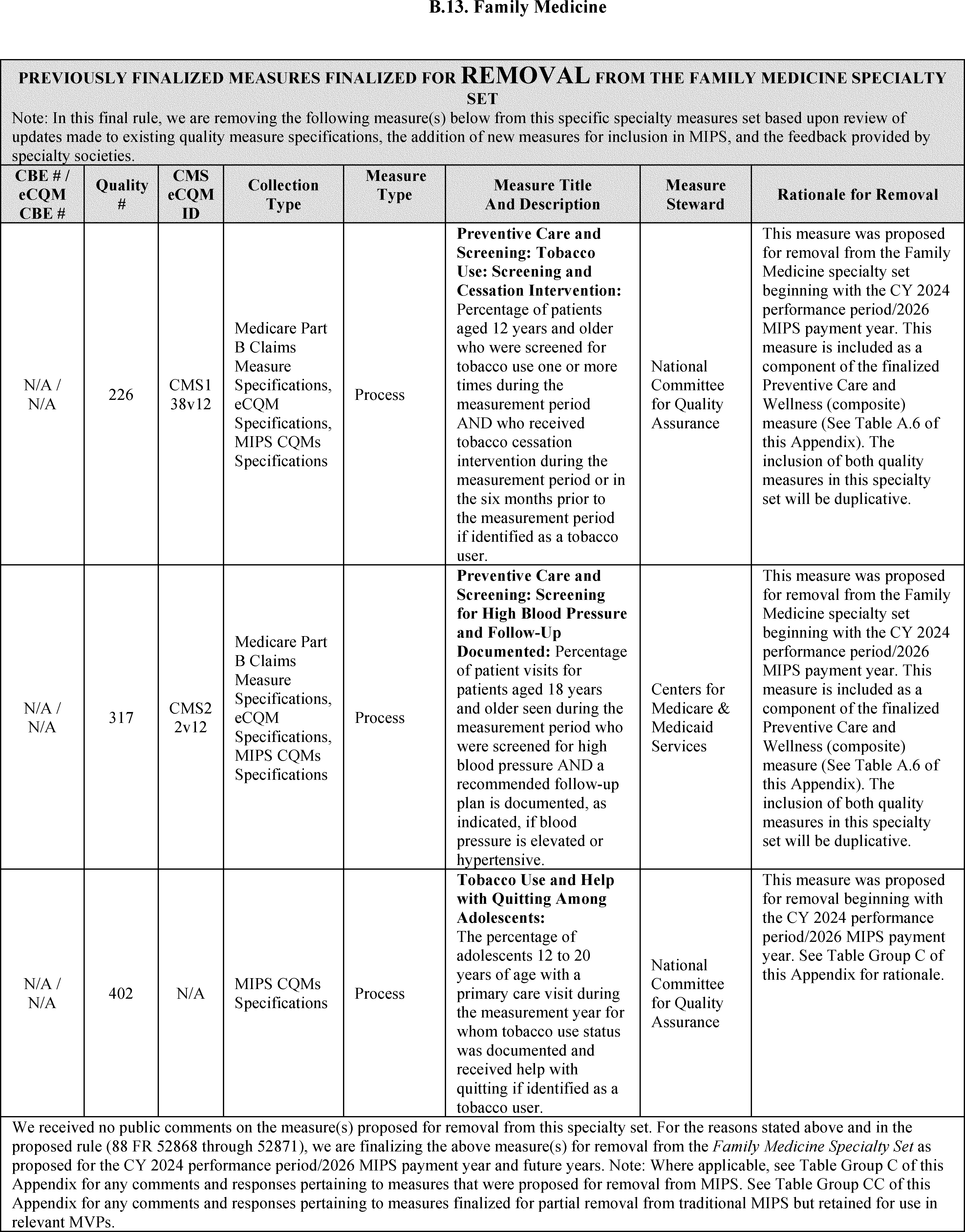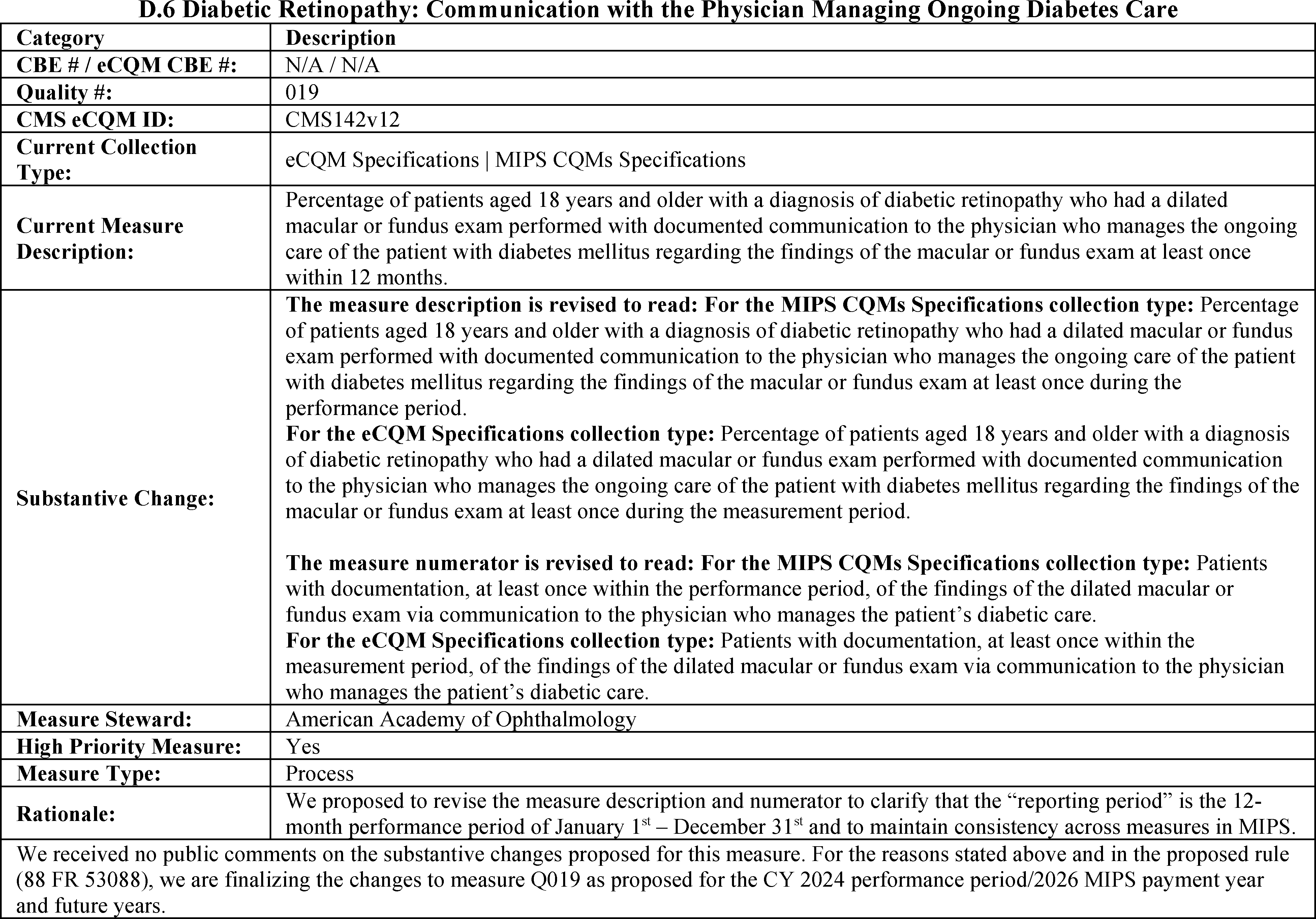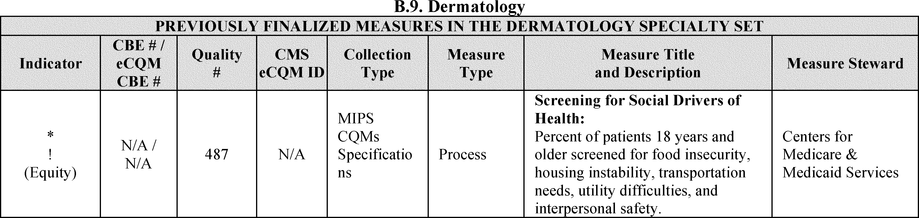 This major final rule addresses: changes to the physician fee schedule (PFS); other changes to Medicare Part B payment policies to ensure that payment systems are updated to reflect changes in medical practice, relative value of services, and changes in the statute; payment for dental services inextricably linked to specific covered medical services; Medicare Shared Savings Program requirements; updates to the Quality Payment Program; Medicare coverage of opioid use disorder services furnished by opioid treatment programs; updates to certain Medicare and Medicaid provider and supplier enrollment policies, electronic prescribing for controlled substances for a covered Part D drug under a prescription drug plan or an MA-PD plan under the Substance Use-Disorder Prevention that Promotes Opioid Recovery and Treatment for Patients and Communities Act (SUPPORT Act); updates to the Ambulance Fee Schedule regulations and the Medicare Ground Ambulance Data Collection System; codification of the Inflation Reduction Act and Consolidated Appropriations Act, 2023 provisions; expansion of the diabetes screening and diabetes definitions; pulmonary rehabilitation, cardiac rehabilitation and intensive cardiac rehabilitation expansion of supervising practitioners; appropriate use criteria for advanced diagnostic imaging; early release of Medicare Advantage risk adjustment data; a social determinants of health risk assessment in the annual wellness visit and Basic Health Program.