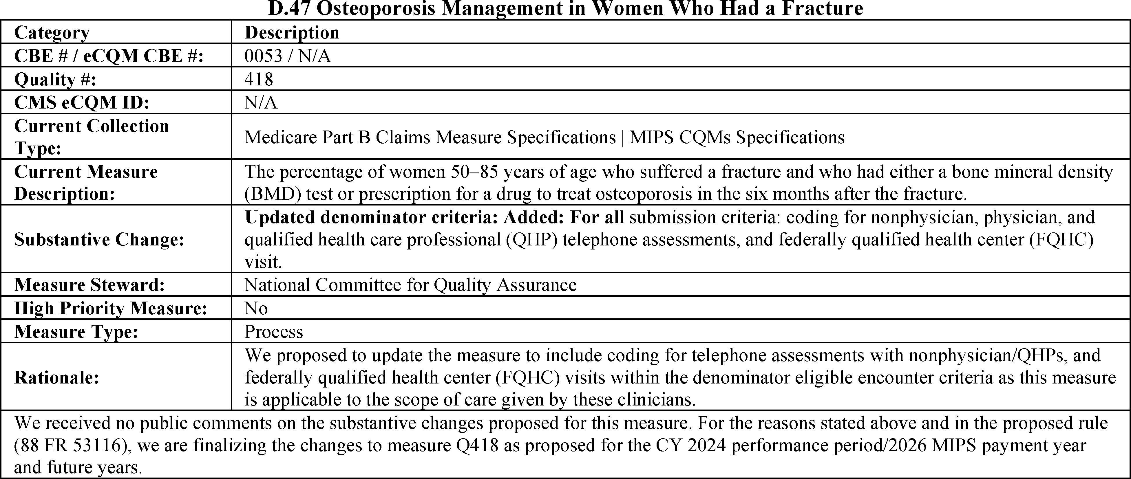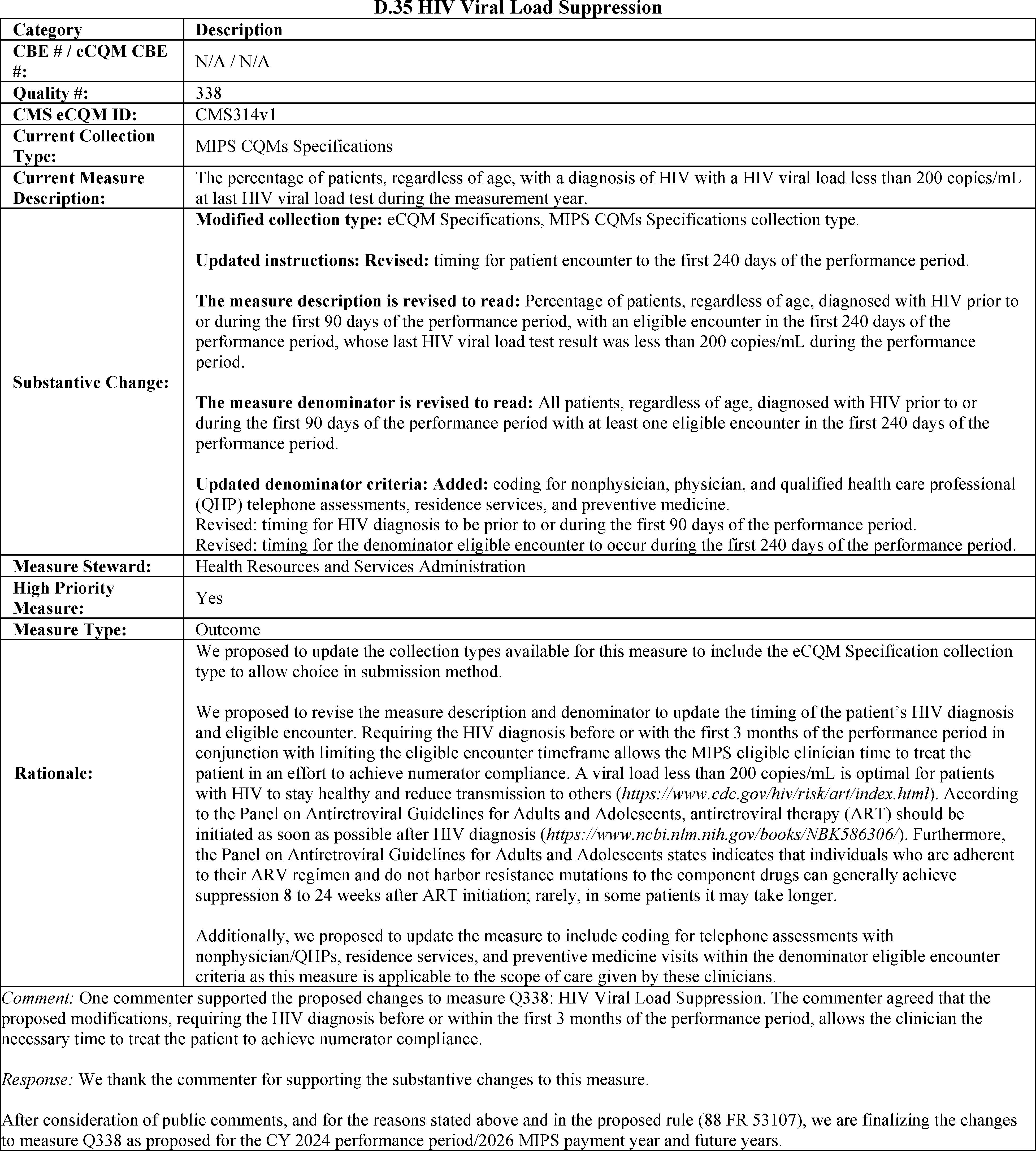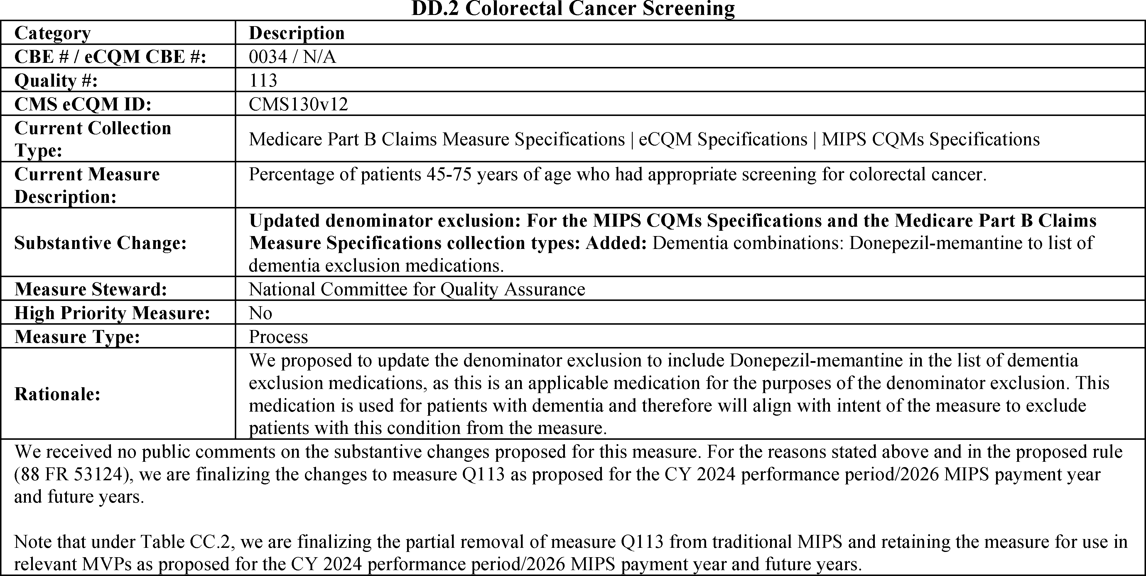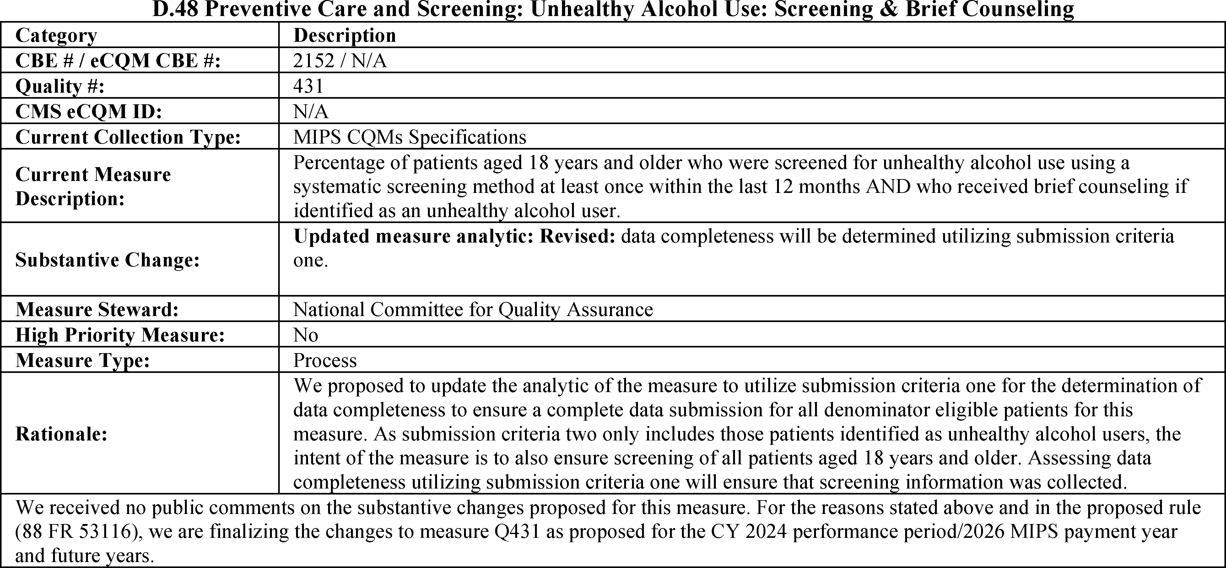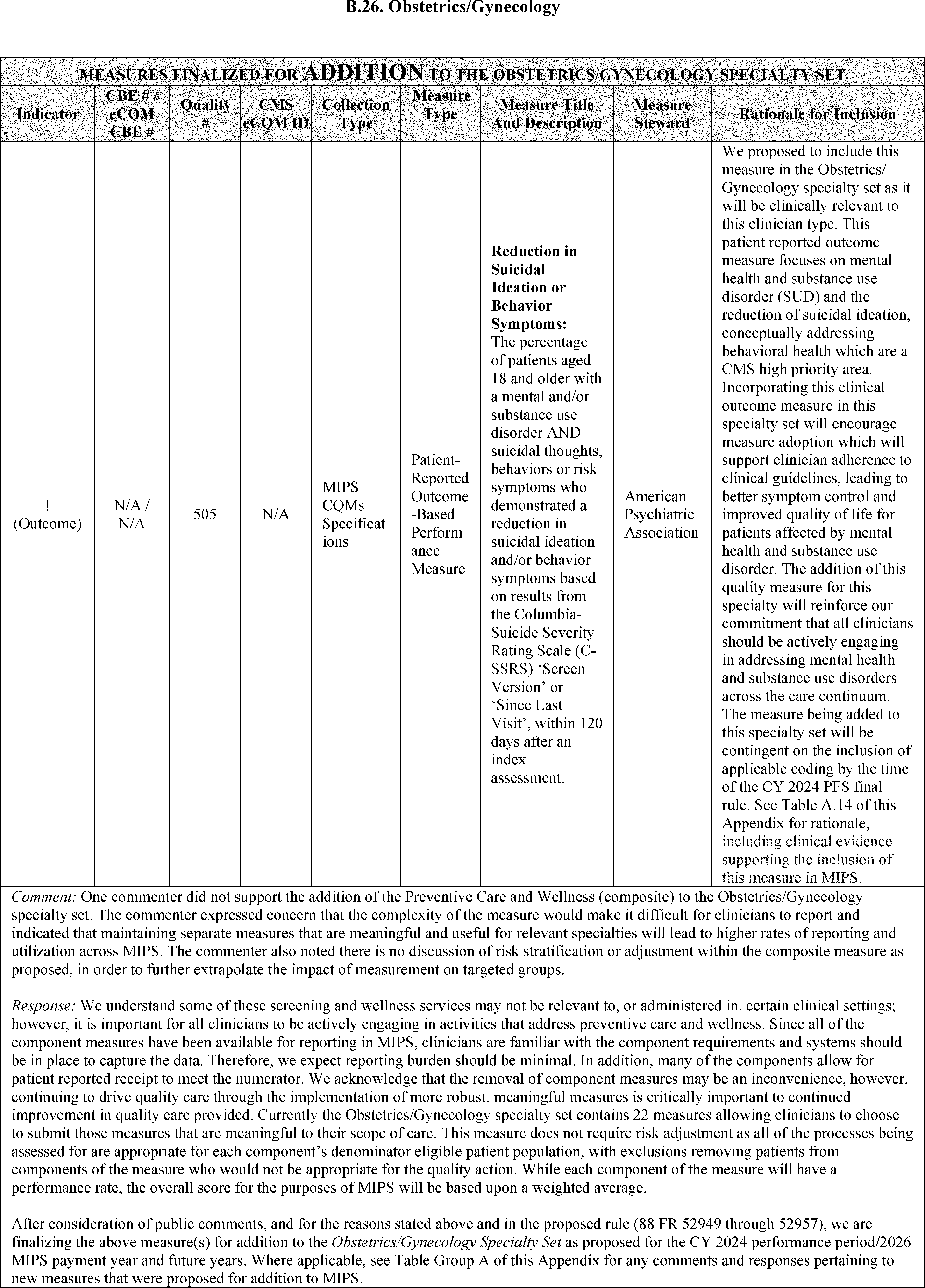 This major final rule addresses: changes to the physician fee schedule (PFS); other changes to Medicare Part B payment policies to ensure that payment systems are updated to reflect changes in medical practice, relative value of services, and changes in the statute; payment for dental services inextricably linked to specific covered medical services; Medicare Shared Savings Program requirements; updates to the Quality Payment Program; Medicare coverage of opioid use disorder services furnished by opioid treatment programs; updates to certain Medicare and Medicaid provider and supplier enrollment policies, electronic prescribing for controlled substances for a covered Part D drug under a prescription drug plan or an MA-PD plan under the Substance Use-Disorder Prevention that Promotes Opioid Recovery and Treatment for Patients and Communities Act (SUPPORT Act); updates to the Ambulance Fee Schedule regulations and the Medicare Ground Ambulance Data Collection System; codification of the Inflation Reduction Act and Consolidated Appropriations Act, 2023 provisions; expansion of the diabetes screening and diabetes definitions; pulmonary rehabilitation, cardiac rehabilitation and intensive cardiac rehabilitation expansion of supervising practitioners; appropriate use criteria for advanced diagnostic imaging; early release of Medicare Advantage risk adjustment data; a social determinants of health risk assessment in the annual wellness visit and Basic Health Program.