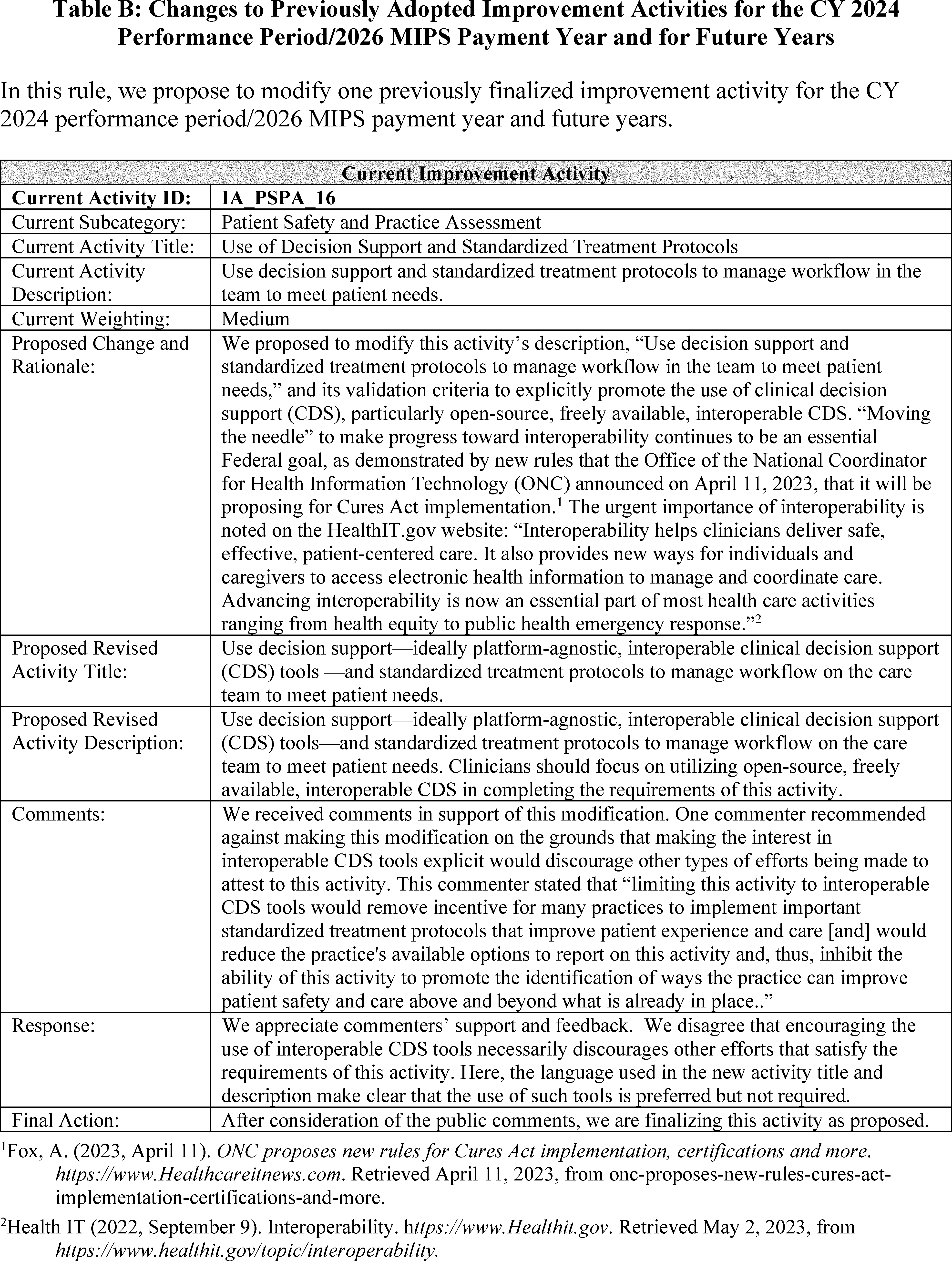 As noted under the proposed rule (88 FR 52590), to date, CMS has determined each MIPS APM to require the performance of improvement activities worth 100 percent of the improvement activity performance score (85 FR 84865, 85031).