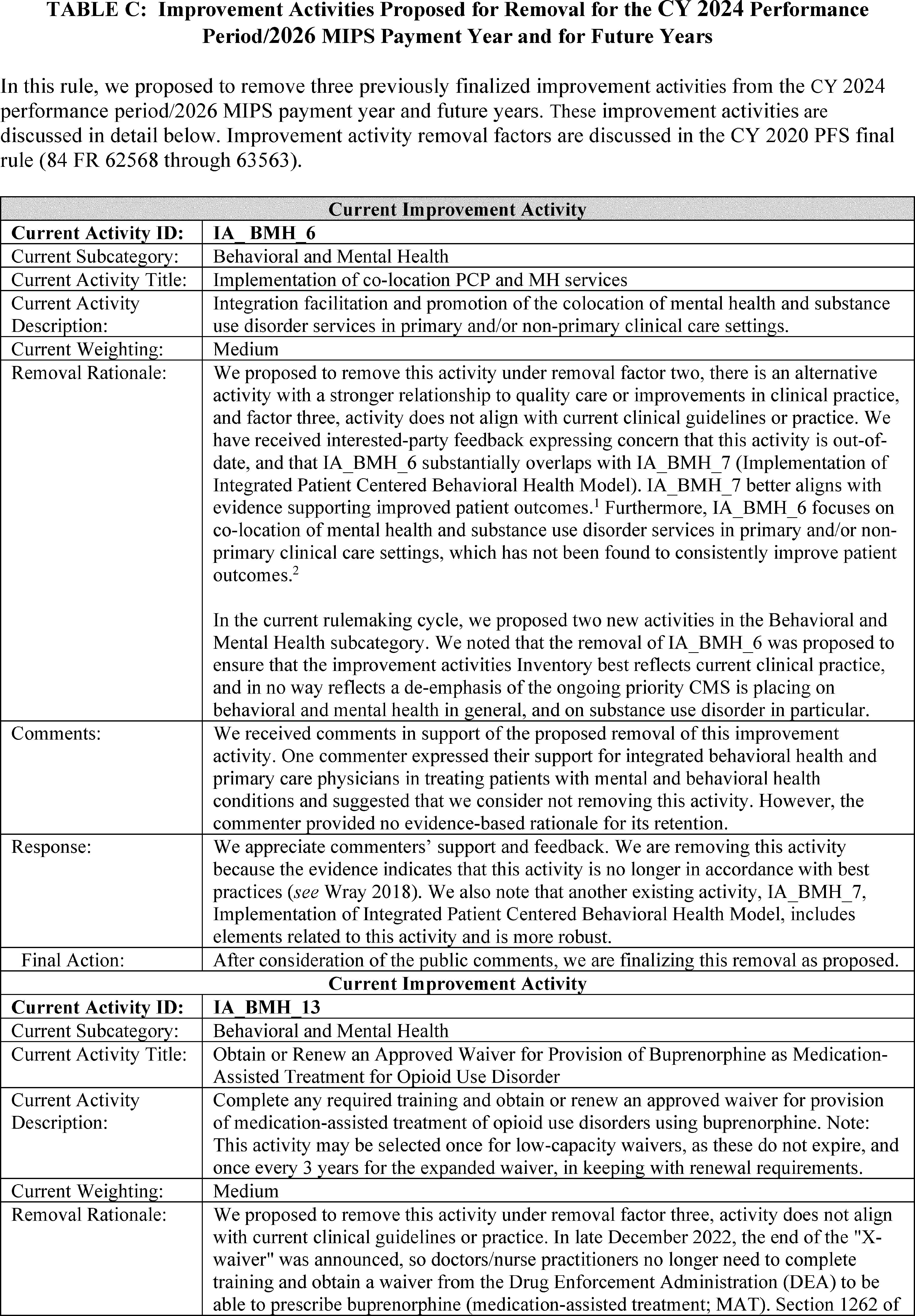 This major final rule revises payment polices under the Medicare PFS and makes other policy changes, including to the implementation of certain provisions of the Consolidated Appropriations Act, 2023 (Pub. L. 117-328, September 29, 2022), Inflation Reduction Act of 2022 (IRA) (Pub. L. 117-169, August 16, 2022), Consolidated Appropriations Act, 2022 (Pub. L. 117-103, March 15, 2022), Consolidated Appropriations Act, 2021 (CAA, 2021) (Pub. L. 116-260, December 27, 2020), Bipartisan Budget Act of 2018 (BBA of 2018) (Pub. L. 115-123, February 9, 2018) and the Substance Use-Disorder Prevention that Promotes Opioid Recovery and Treatment for Patients and Communities Act (SUPPORT Act) (Pub. L. 115-271, October 24, 2018), related to Medicare Part B payment. In addition, this major final rule includes provisions regarding other Medicare payment policies described in sections III. and IV.