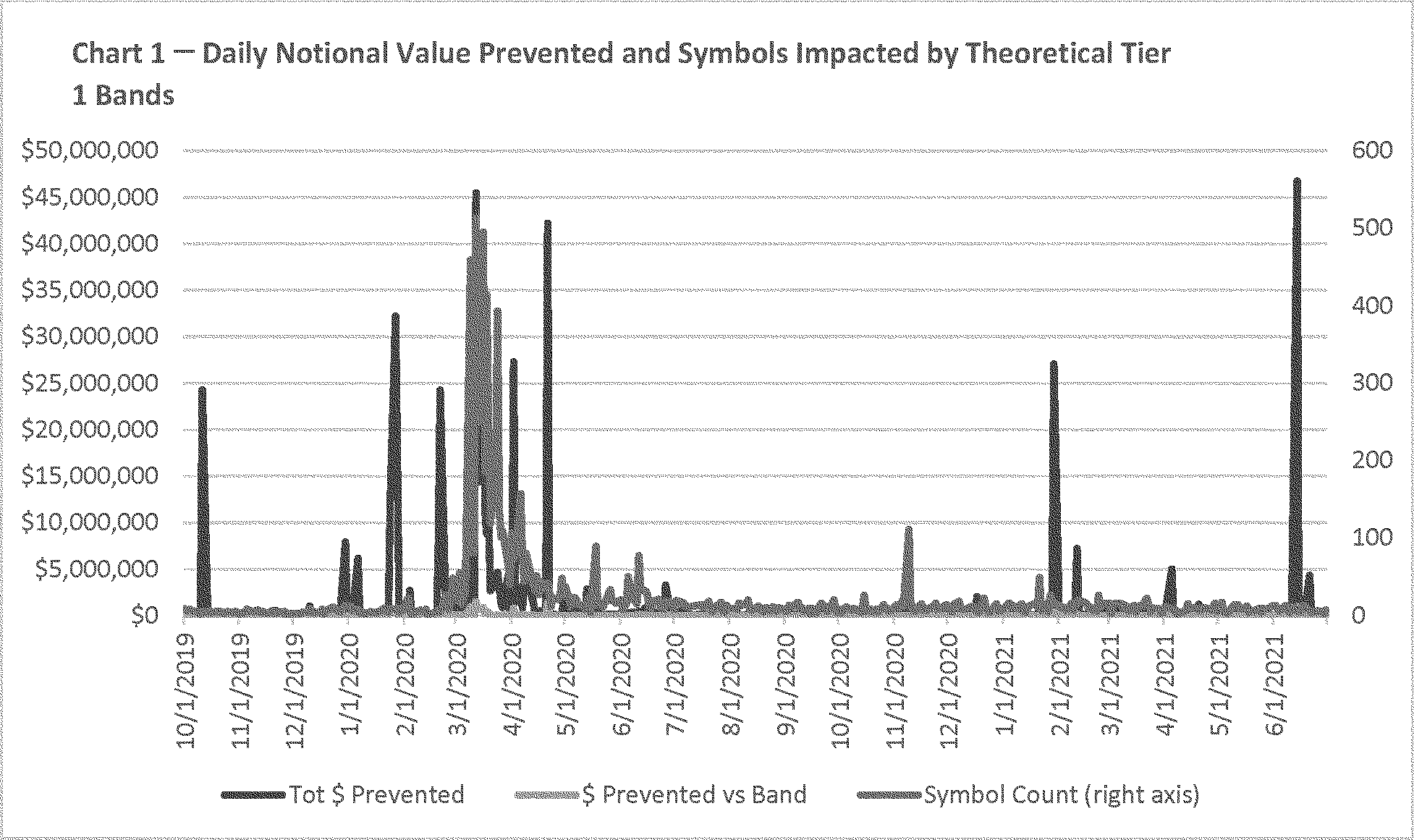 The Participants drilled down into the results discussed above to determine, on a day-by-day basis, the amount of notional value prevented and the number of symbols impacted by the narrower Theoretical Tier 1 Bands. The results are shown in Chart 1 below: