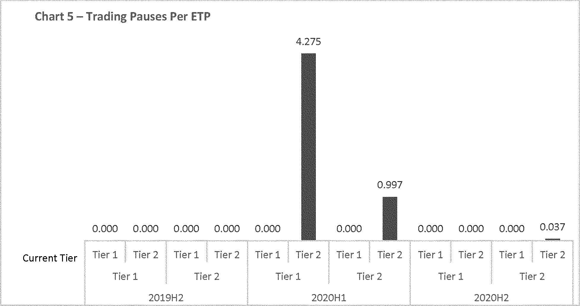 Regarding Trading Pauses, Chart 5 below shows that ETPs that switched from Tier 2 to Tier 1 had fewer Trading Pauses than those that remained in Tier 2. ETPs that moved from Tier 1 to Tier 2 had more Trading Pauses than those that remained in Tier 1.