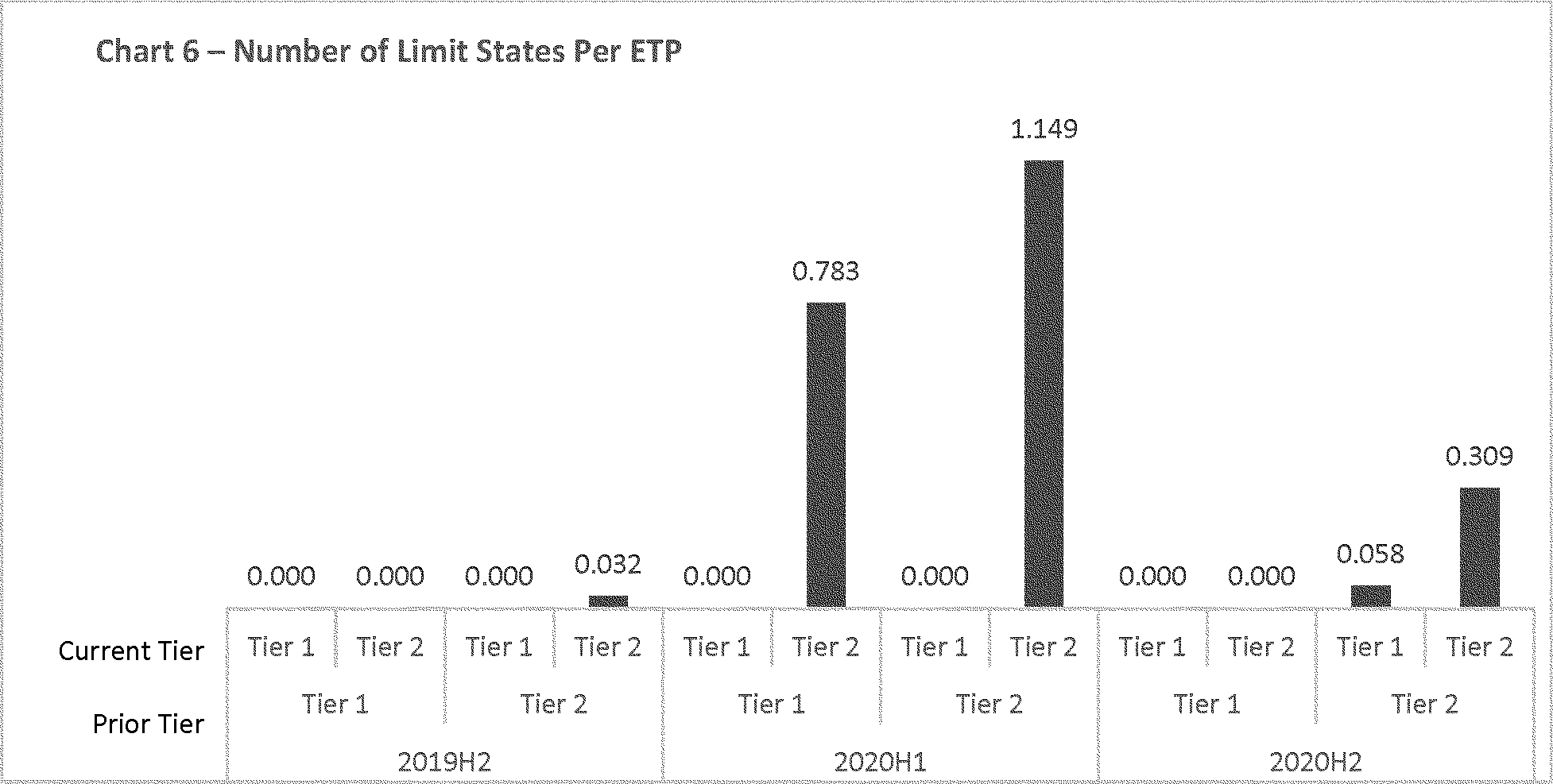 Regarding Limit States, Chart 6 below shows similar results. ETPs that were recategorized from Tier 2 to Tier 1 showed a decrease in the number Limit States, while ETPs that were moved from Tier 1 to Tier 2 showed an increase in the number of Limit States.