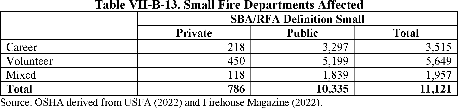 The fire registry data are self-reported by individual fire departments, and in some cases, departments have classified themselves as a “volunteer” department even though they also reported some career or paid-per-call responders. OSHA has reclassified these departments such that only those departments where all active firefighters are volunteers are listed as “volunteer” departments and only those where all active firefighters are either career or paid per call are “career,” with the remainder being “mixed.”