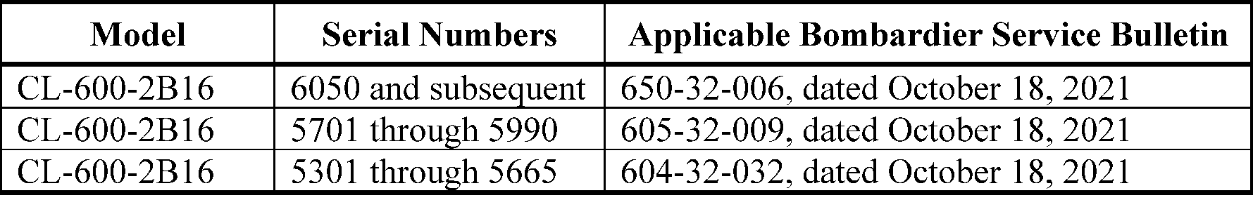 This AD applies to Bombardier, Inc., Model CL-600-2B16 (601-3A, 601-3R, and 604 Variants) airplanes, certificated in any category, with serial numbers 5301 through 5665 inclusive, 5701 through 5990 inclusive, and 6050 and subsequent.
