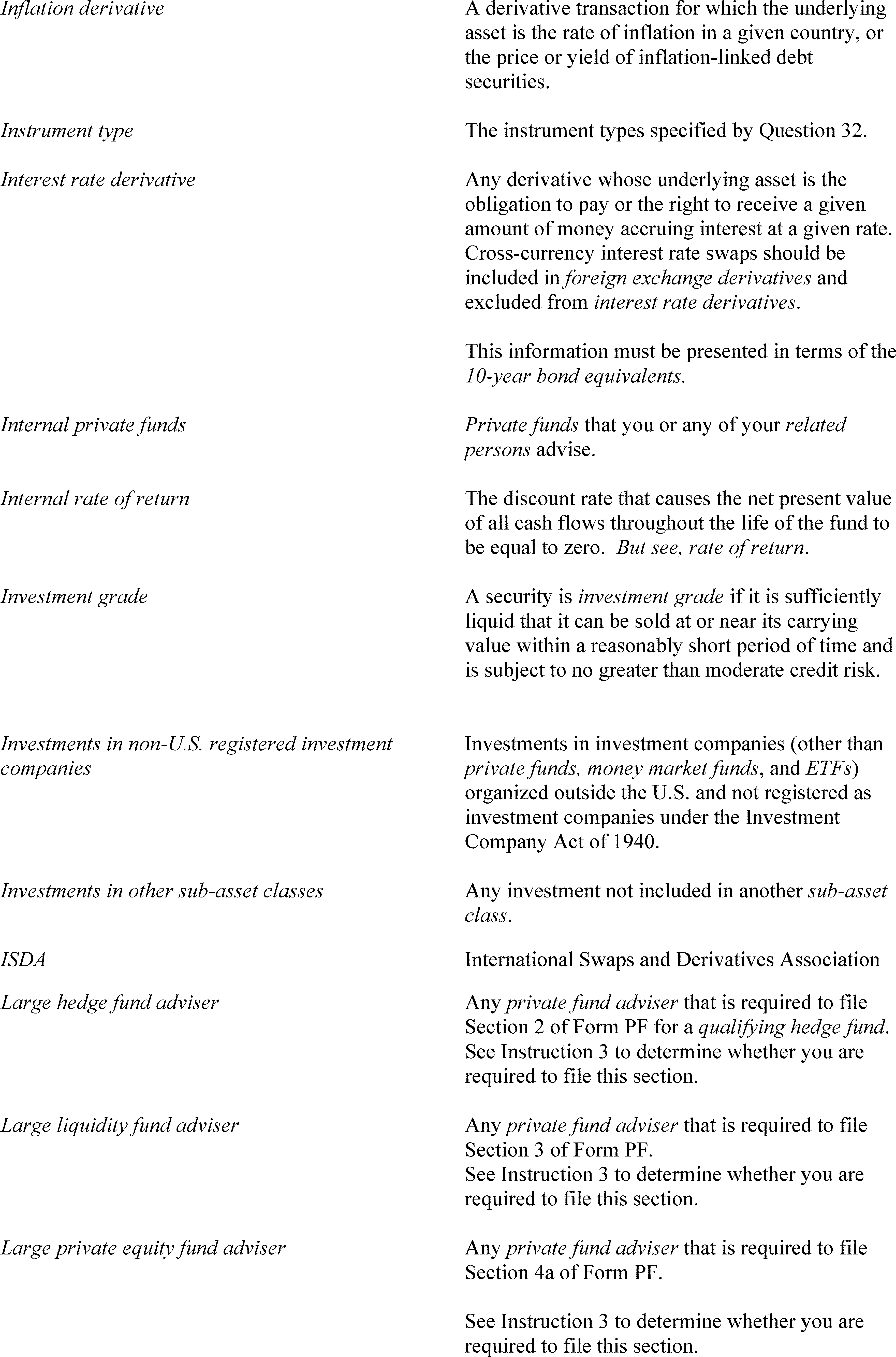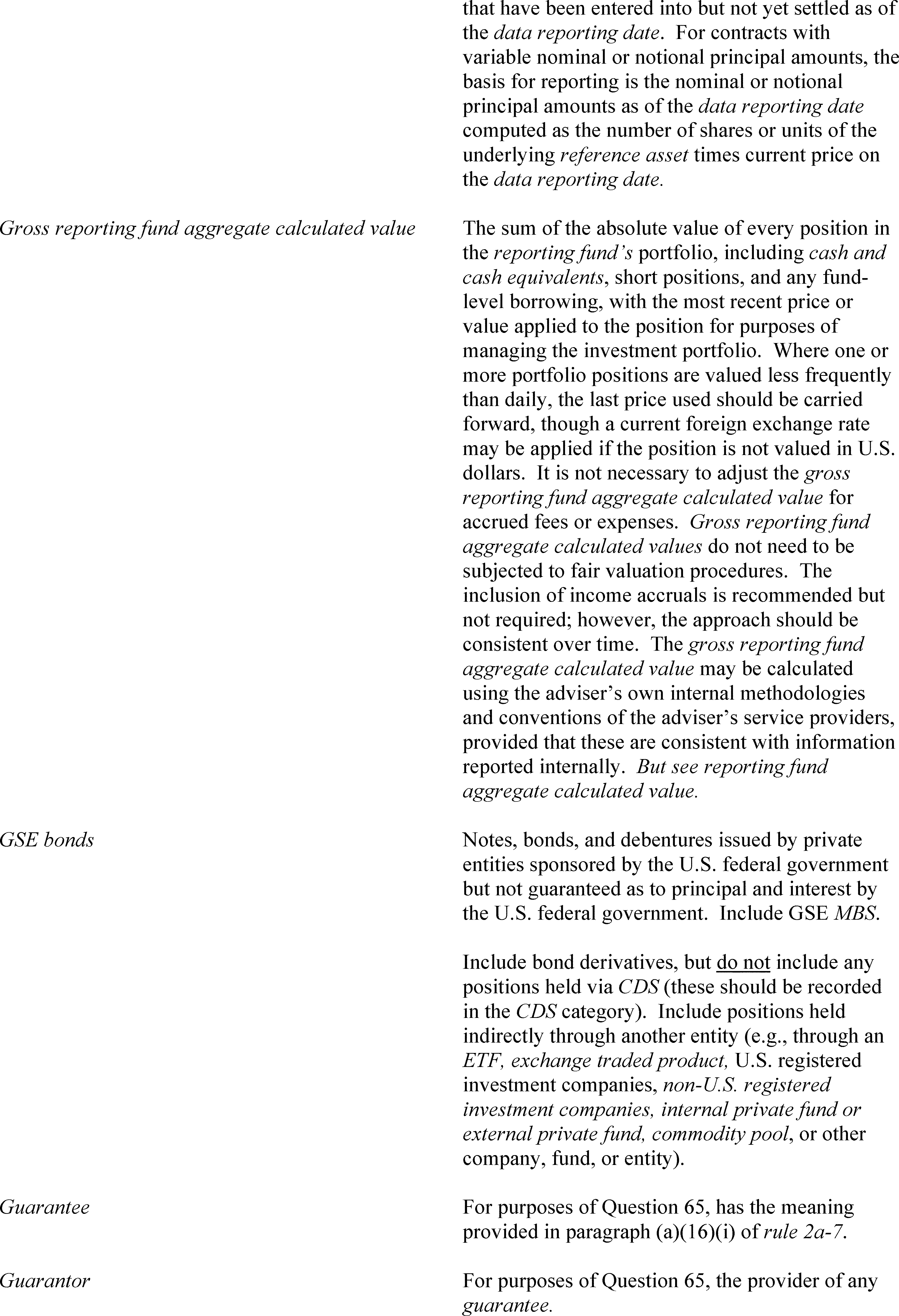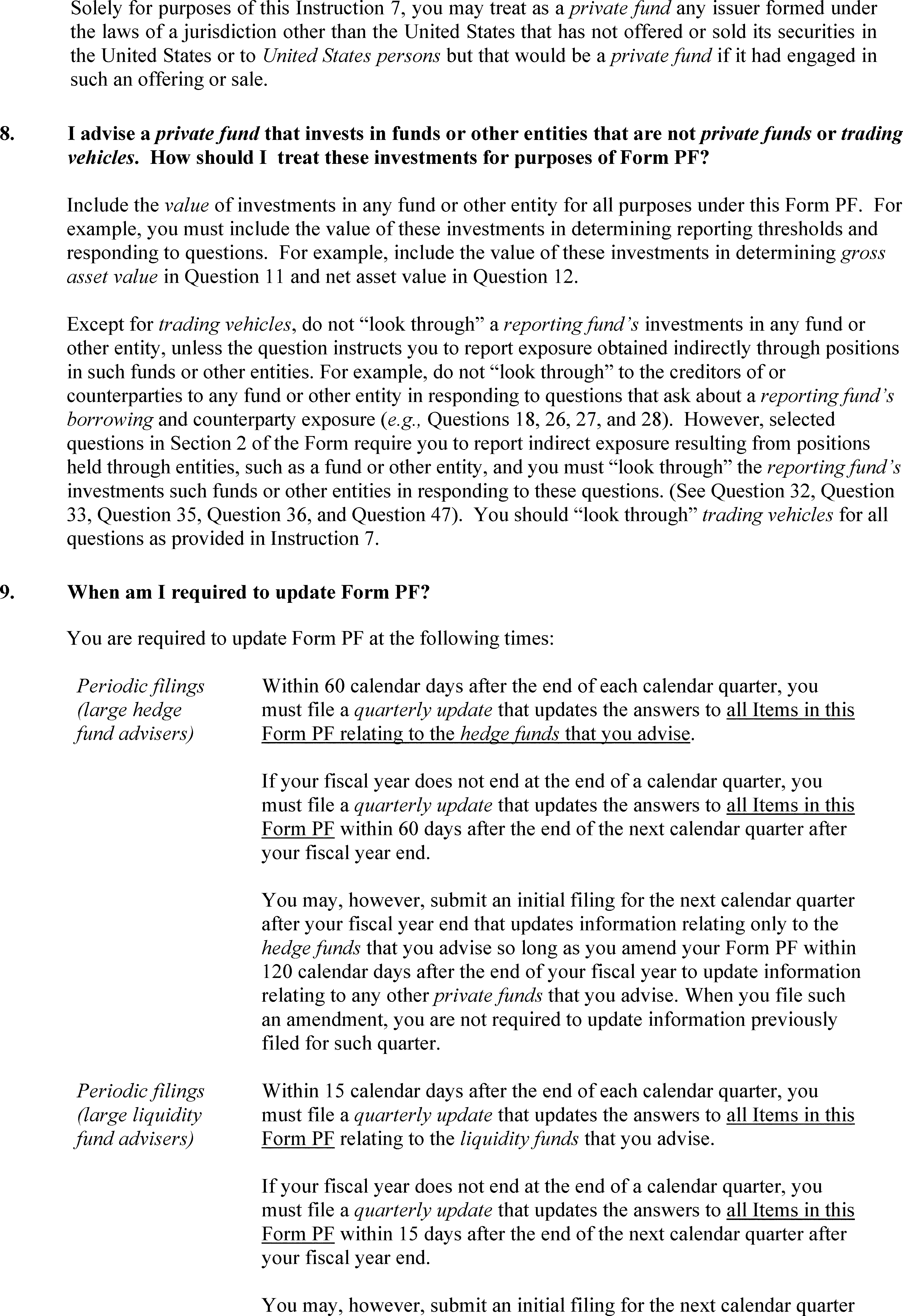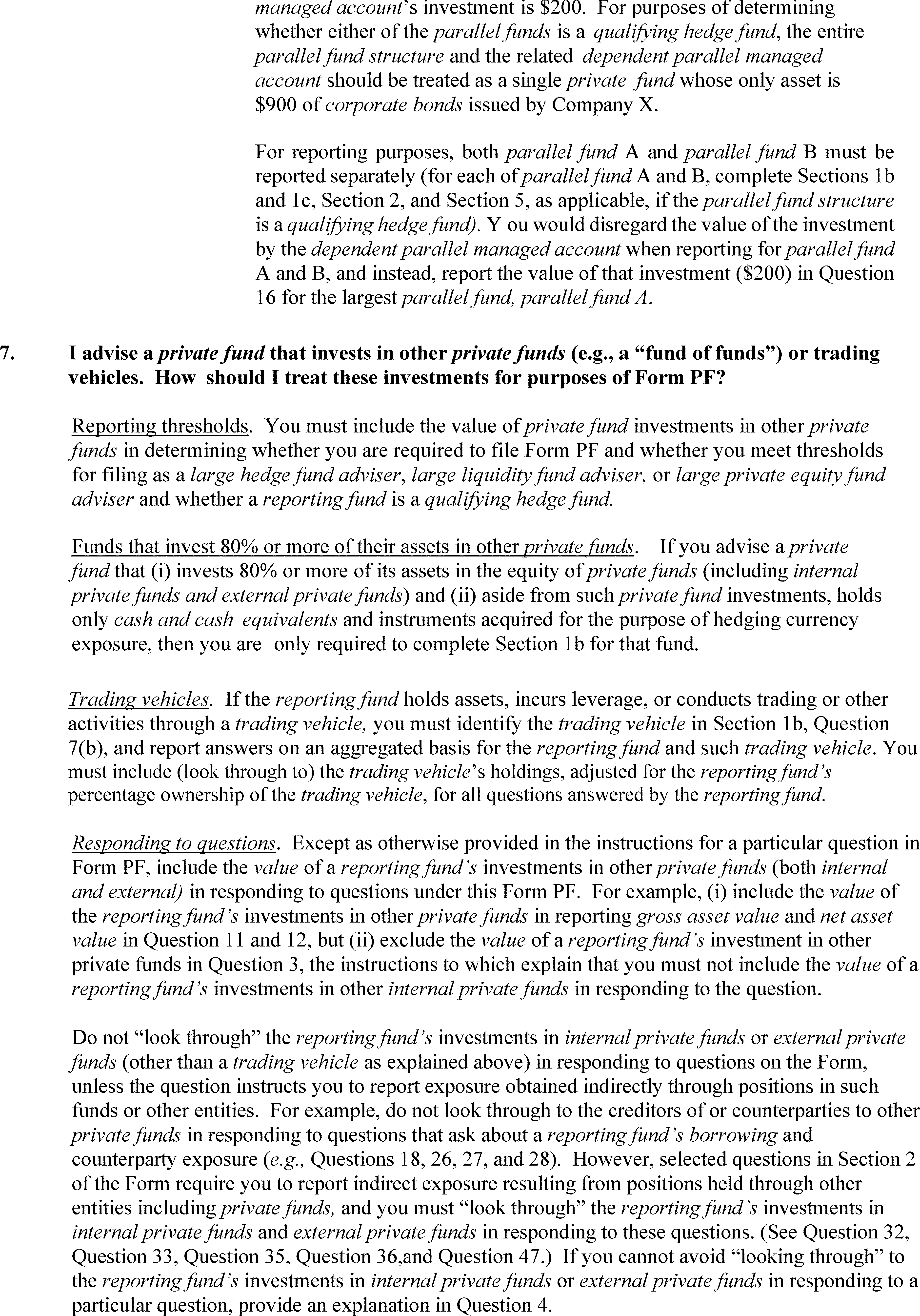 We are also adopting, with some modifications from the proposal, amendments to Form PF regarding how advisers report private fund investments in other funds. We are revising proposed Instruction 7 to require an adviser to include the value of investments in other private funds (including internal and external private funds) when determining whether the adviser is required to file Form PF, whether it meets the thresholds for reporting as a large hedge fund adviser, large liquidity fund adviser, or large private equity fund adviser, and whether a hedge fund is a qualifying hedge fund, rather than permit an adviser to either include or exclude the value of investments in other private funds for the purpose of determining its reporting threshold, as proposed.[15]